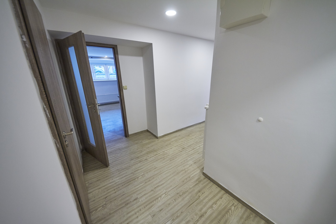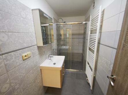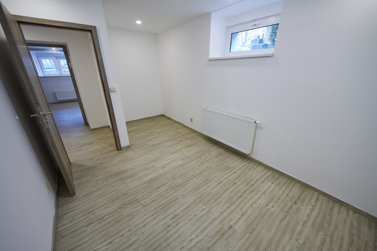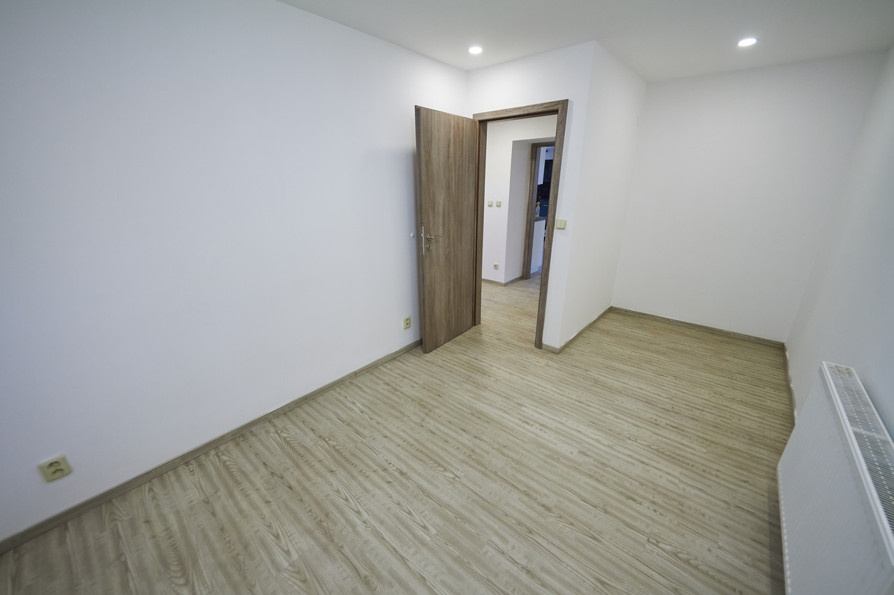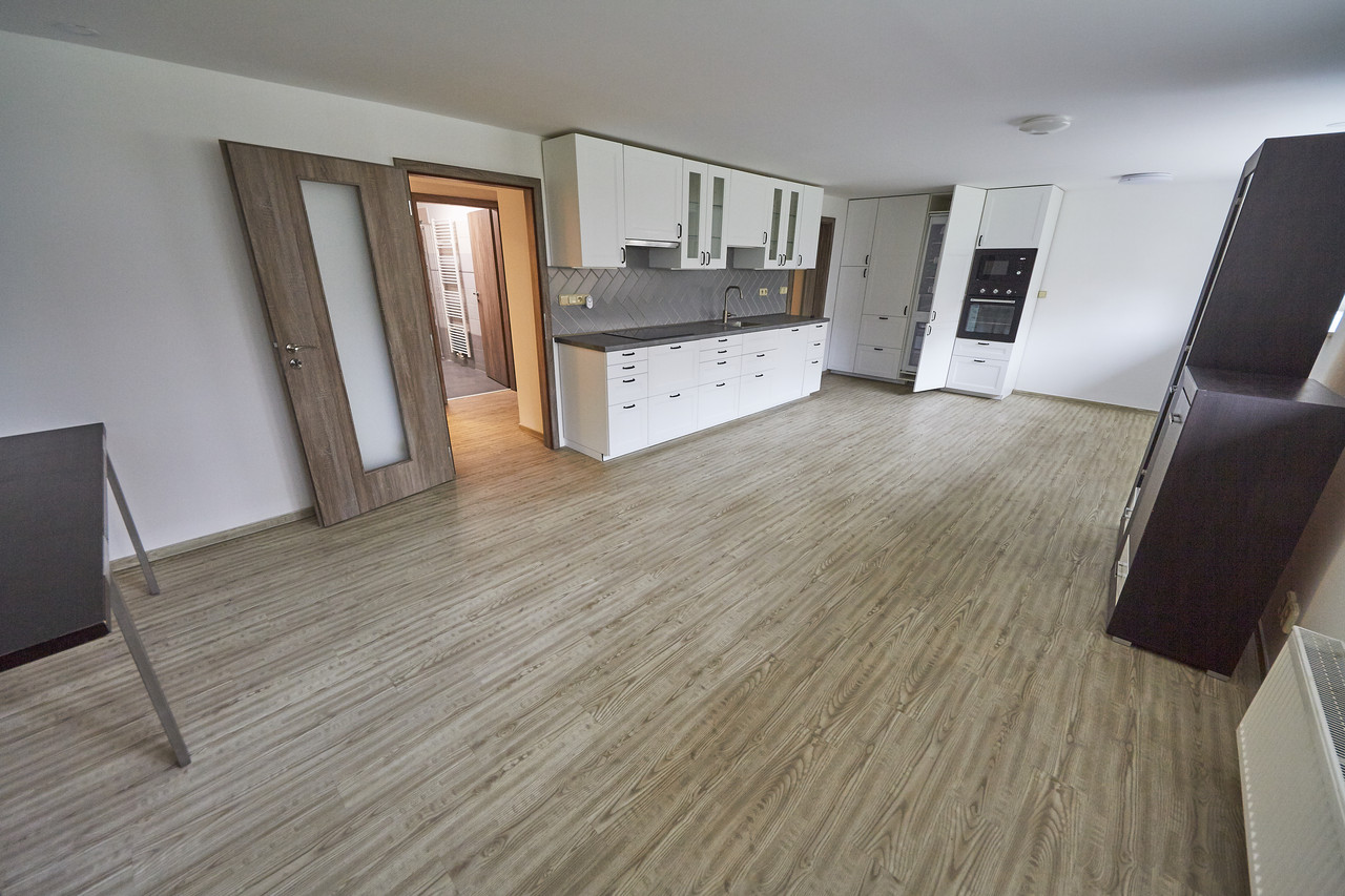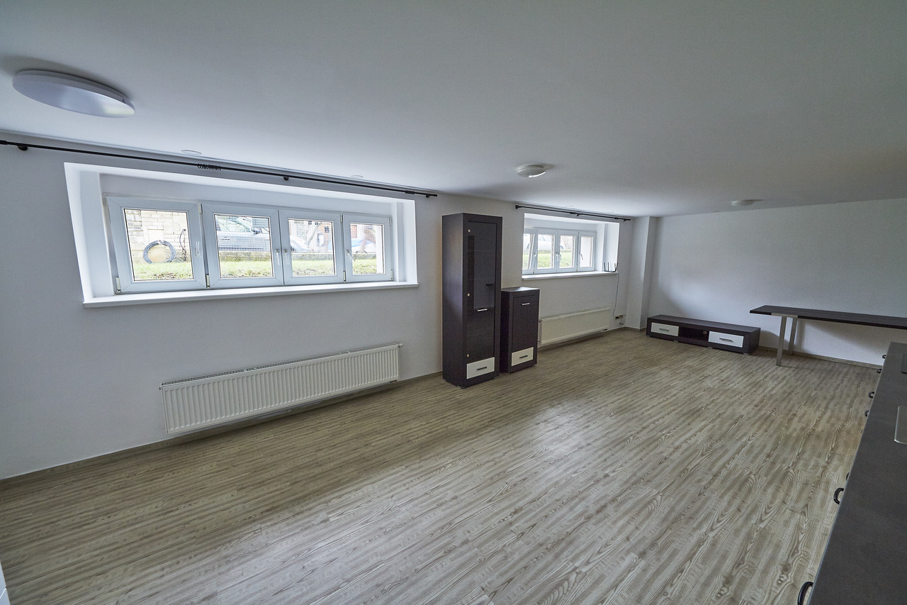 Byt 2+kk, 66,9m2 po kompletní rekonstrukci, v suterénu dvoupodlažního rodinného domu se třemi bytovými jednotkami. Obývací pokoj 34,7m2 s kuchyňskou linkou s keramickou varnou deskou s digestoří, el. troubou, mikrovlnkou, ledničkou s mrazákem a myčkou nádobí. Ložnice 10,8m2, koupelna se sprchovým koutem, umyvadlem a topným žebříkem, samostatné WC, komora s pračkou. Ústřední topení a teplá voda z plynového kotle. Možnost využití zahrady a přístřešku s grilem a posezením. Volné ihned.