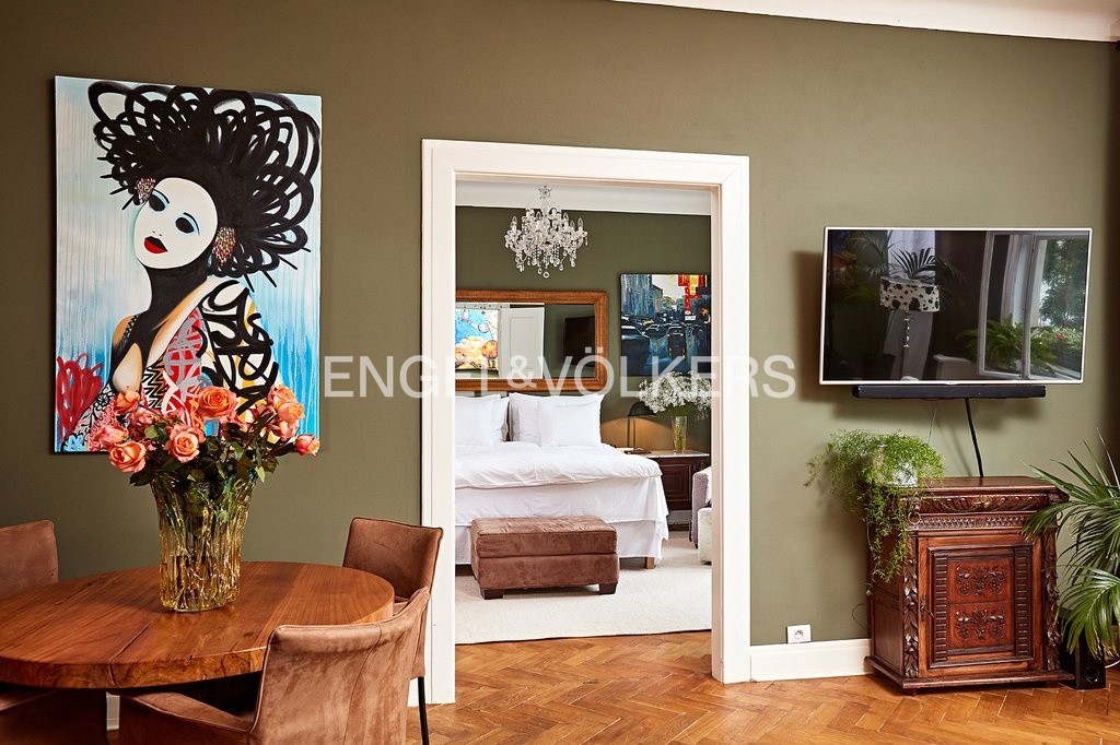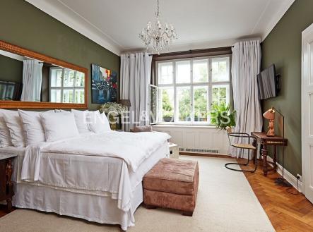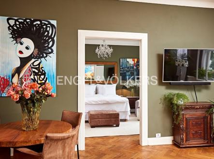 Činžovní dům z přelomu 19. a 20. století v prestižní části Prahy na Rašínově nábřeží. V domě byl kladen důraz na zachování původních prvků domu i bytu. Reprezentativní společné prostory a nadstandardní servis je samozřejmostí. Centrální místností bytu je obývací pokoj s jídelním prostorem. Apartmán disponuje dvěma ložnicemi, jedna z nich je orientovaná do klidného vnitrobloku a je z ní vstup na balkon. Na rekonstrukci byly použity kvalitní materiály, jako je mramor, vysoce jakostní dřevo a luxusní doplňkové dekorační předměty. Nezapomenutelná atmosféra apartmánu v neopakovatelném stylu dýchá z každého detailu. Původní renovovaná okna a zárubně dveří. Na podlahy jsou použity parkety a dlažba. Byt se nachází ve třetím nadzemním podlaží. Samozřejmostí je výtah. Kauce je stanovena na tři měsíční nájmy, provize za zprostředkování činí jeden měsíční nájem + DPH.