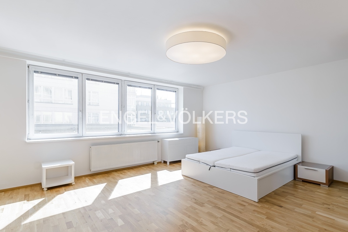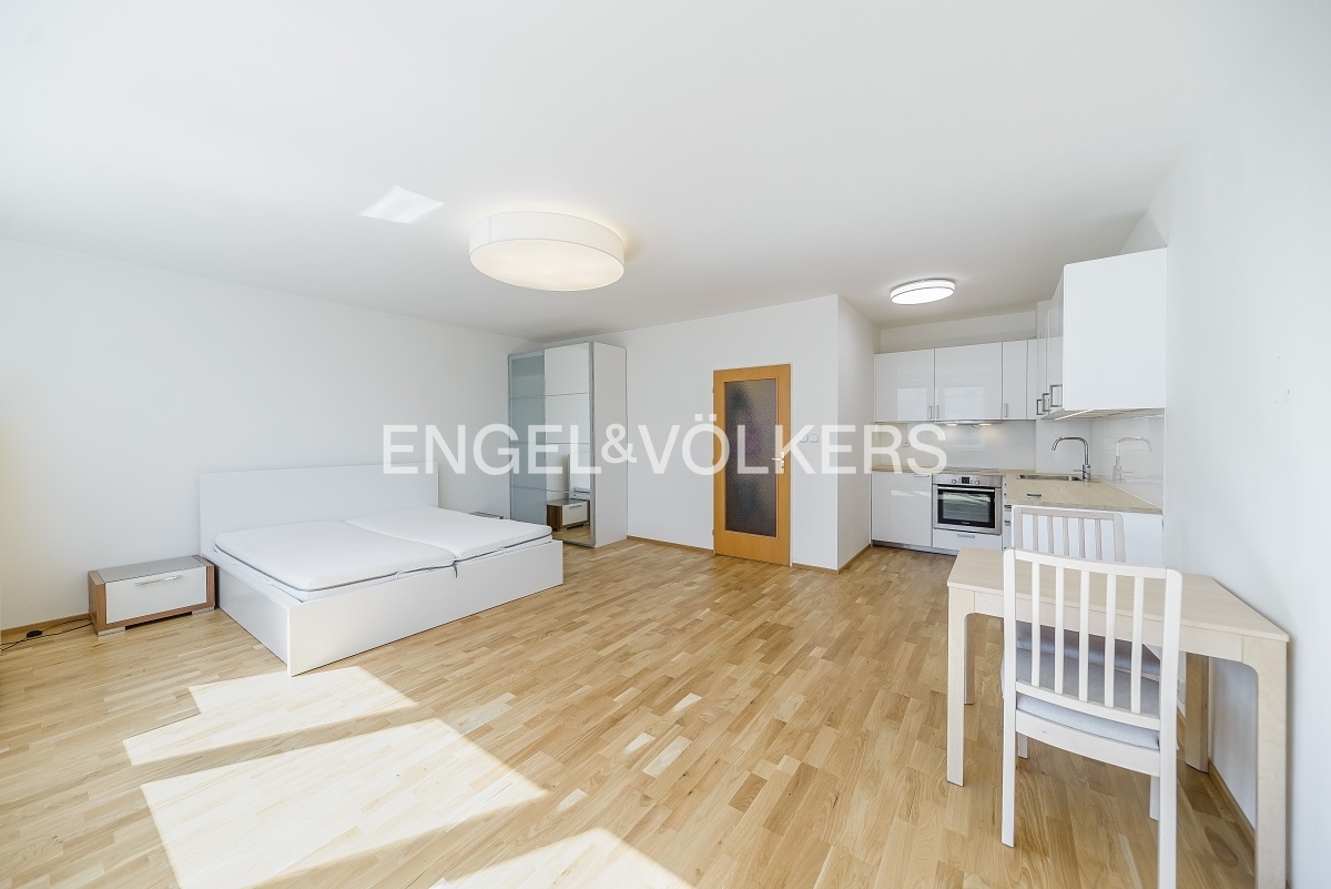 Krásný byt po částečné rekonstrukci s dispozicí 1+kk v 5. NP udržovaného bytového domu. Byt se skládá ze vstupní chodby, obytné místnosti s plně vybavenou kuchyní všemi spotřebiči značky Bosch, jídelním stolem, manželskou postelí a šatní skříní. Koupelna se sprchovým koutem je vybavena pračkou se sušičkou. Byt je orientován na východní stranu a je velmi světlý. V bytě jsou kompletně nové dřevěné podlahy. Poplatky činí 3 600 Kč včetně vytápění. Elektrická energie se hradí zvlášť. V budově je výtah, 24/7 recepce a možnost zajištění parkovacího místa v podzemních garážích za poplatek. Tramvajová zastávka se spojením do centra i stanice metra Želivského se nachází pár kroků od domu, v okolí je veškerá občanská vybavenost.