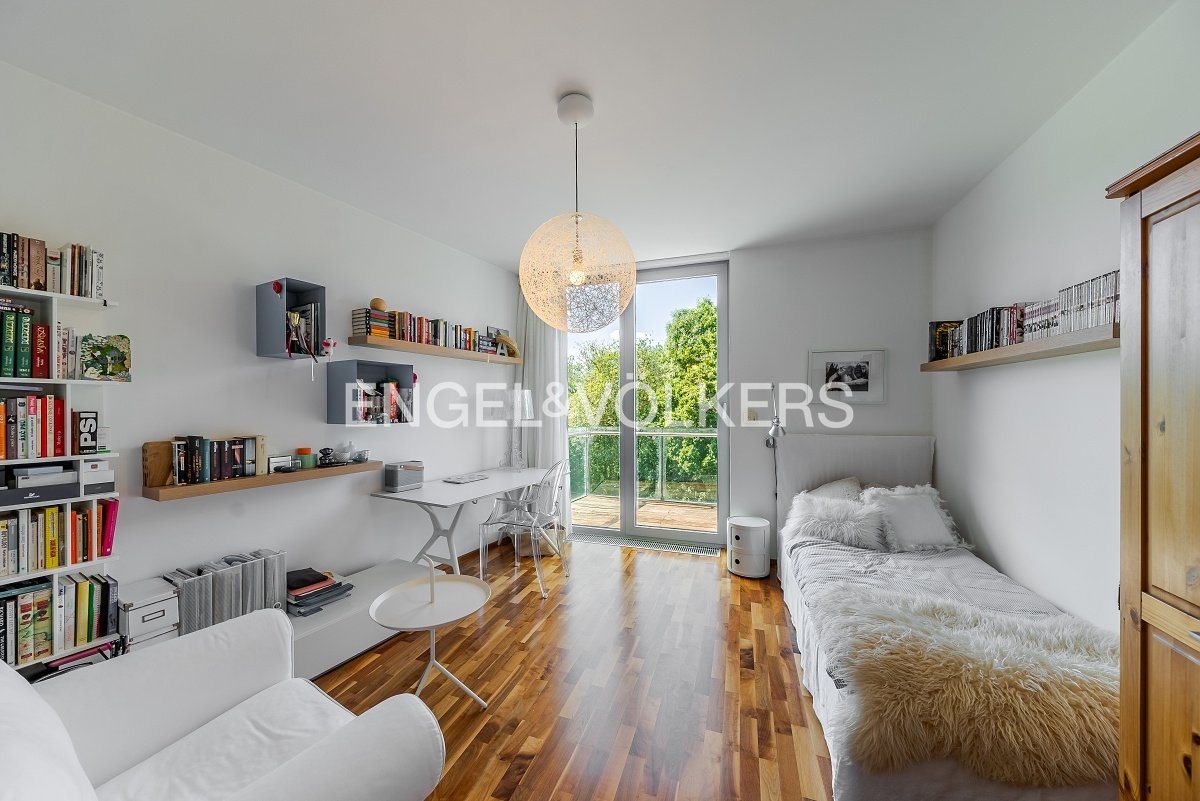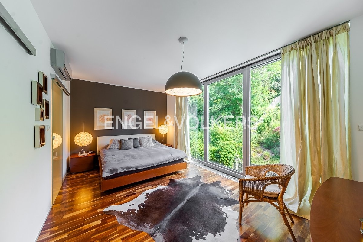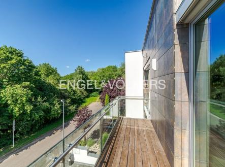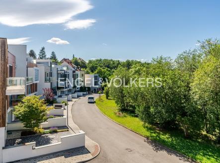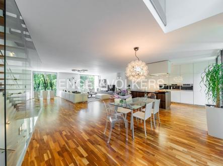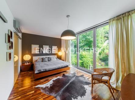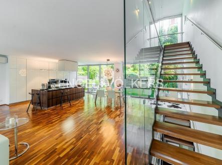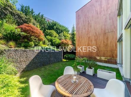 Vila z roku 2009 se nachází v ulici Pod Císařkou a je součástí architektonicky oceněného rezidenčního projektu Atriové vily Císařka. Moderní řadový dům s dispozicí 5+kk nabízí vnitřní užitnou plochu 300 m² a je ideální volbou pro rodinné bydlení s důrazem na soukromí, kvalitu a prostor. Dispozice domu je rozložena do čtyř podlaží propojených elegantním proskleným schodištěm. V nejnižším podlaží se nachází garáž pro dvě auta, vstupní hala, technické zázemí a koupelna. Hlavní obytné patro vyniká prostorným obývacím pokojem s designovou kuchyní Poliform Varenna Twelve se spotřebiči Miele a přímým vstupem na soukromou zahradu. Druhé patro nabízí hlavní ložnici s vlastní koupelnou a šatnou, dvě další neprůchozí ložnice, sdílenou koupelnu a balkon. V nejvyšším podlaží se nachází pracovna nebo další ložnice s přístupem na střešní terasu s přípravou na wellness zónu (koupelna, vířivka apod.). Dům splňuje vysoké standardy jak po technické, tak designové stránce. Interiér tvoří kombinace dřevěných podlah a kamenné dlažby, velkoformátová hliníková okna s dvojskly a venkovním stíněním, klimatizace v každém pokoji, centrální vysavač i rošty z tropického dřeva. Vytápění zajišťuje plynová kotelna. Lokalita na pomezí Hřebenek a Smíchova vyniká jedinečnou kombinací vilového klidu a blízkosti centra města. Dům je situován v tiché slepé ulici obklopené zelení, jen pár minut od Anděla či Malé Strany. V pěším dosahu se nachází školy, obchody, restaurace i veškerá občanská vybavenost. Výborné dopravní napojení zajišťuje Plzeňská ulice, tunel Mrázovka i blízké tramvajové linky.