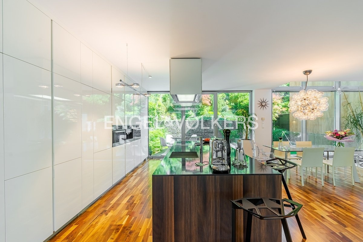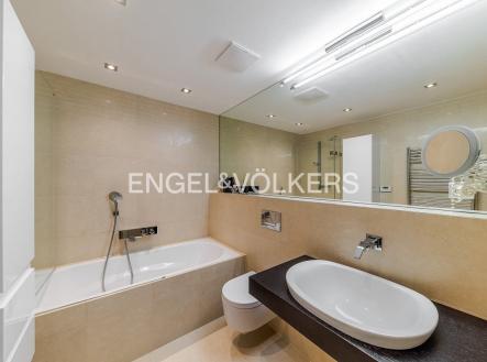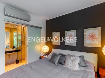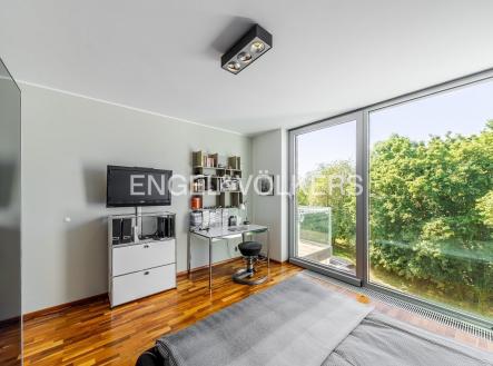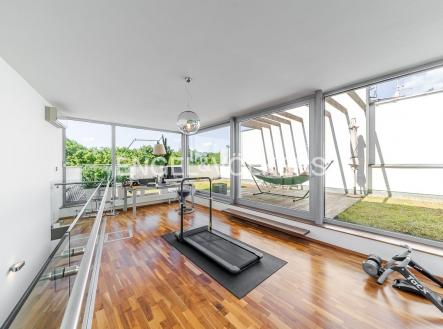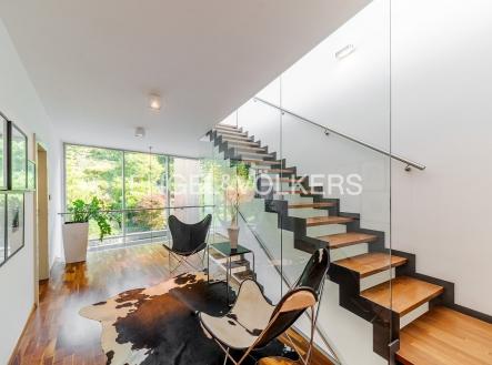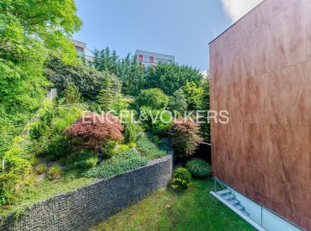 Vila z roku 2009 se nachází v ulici Pod Císařkou a je součástí architektonicky oceněného rezidenčního projektu Atriové vily Císařka. Moderní řadový dům s dispozicí 5+kk nabízí vnitřní užitnou plochu 300 m² a je ideální volbou pro rodinné bydlení s důrazem na soukromí, kvalitu a prostor. Dispozice domu je rozložena do čtyř podlaží propojených elegantním proskleným schodištěm. V nejnižším podlaží se nachází garáž pro dvě auta, vstupní hala, technické zázemí a koupelna. Hlavní obytné patro vyniká prostorným obývacím pokojem s designovou kuchyní Poliform Varenna Twelve se spotřebiči Miele a přímým vstupem na soukromou zahradu. Druhé patro nabízí hlavní ložnici s vlastní koupelnou a šatnou, dvě další neprůchozí ložnice, sdílenou koupelnu a balkon. V nejvyšším podlaží se nachází pracovna nebo další ložnice s přístupem na střešní terasu s přípravou na wellness zónu (koupelna, vířivka apod.). Dům splňuje vysoké standardy jak po technické, tak designové stránce. Interiér tvoří kombinace dřevěných podlah a kamenné dlažby, velkoformátová hliníková okna s dvojskly a venkovním stíněním, klimatizace v každém pokoji, centrální vysavač i rošty z tropického dřeva. Vytápění zajišťuje plynová kotelna. Lokalita na pomezí Hřebenek a Smíchova vyniká jedinečnou kombinací vilového klidu a blízkosti centra města. Dům je situován v tiché slepé ulici obklopené zelení, jen pár minut od Anděla či Malé Strany. V pěším dosahu se nachází školy, obchody, restaurace i veškerá občanská vybavenost. Výborné dopravní napojení zajišťuje Plzeňská ulice, tunel Mrázovka i blízké tramvajové linky.