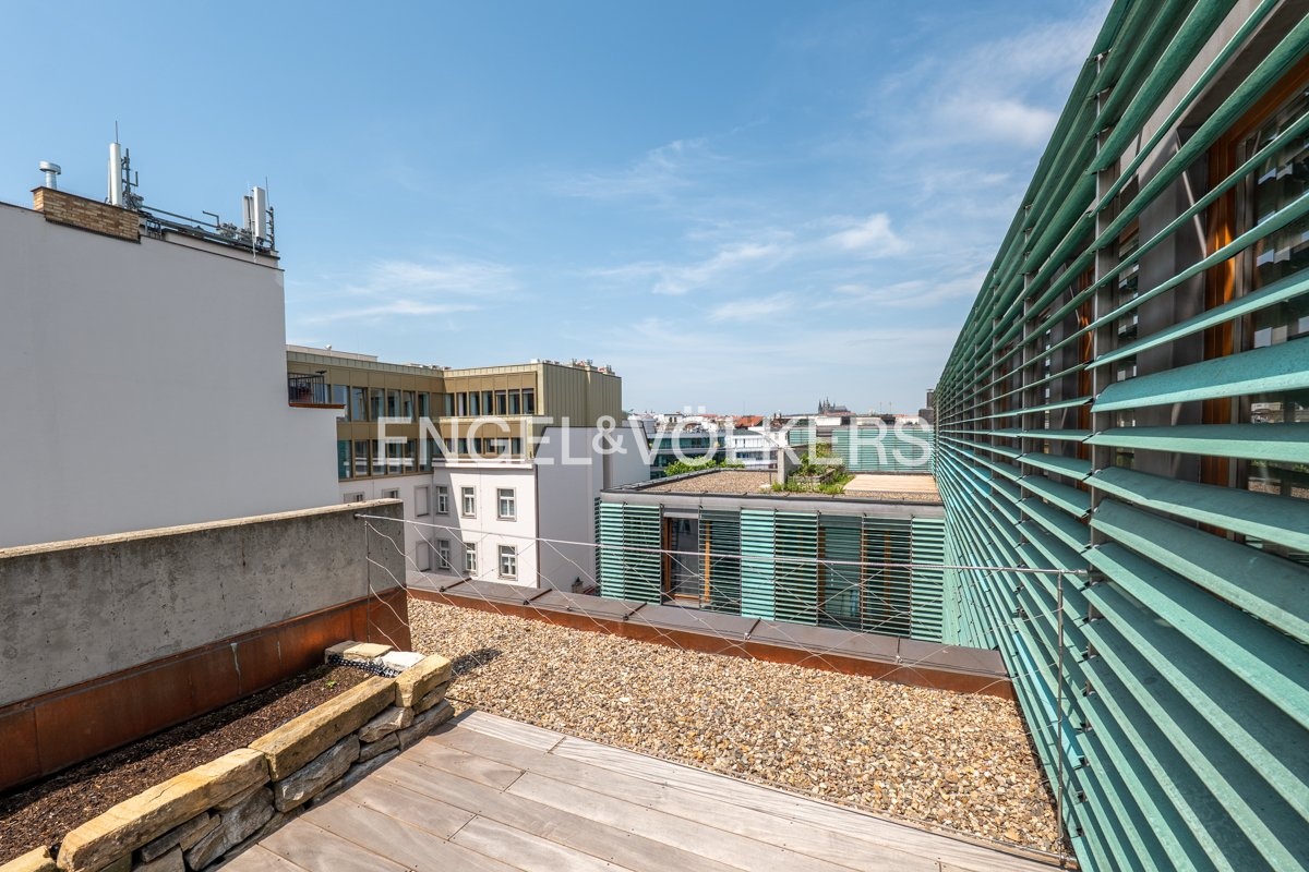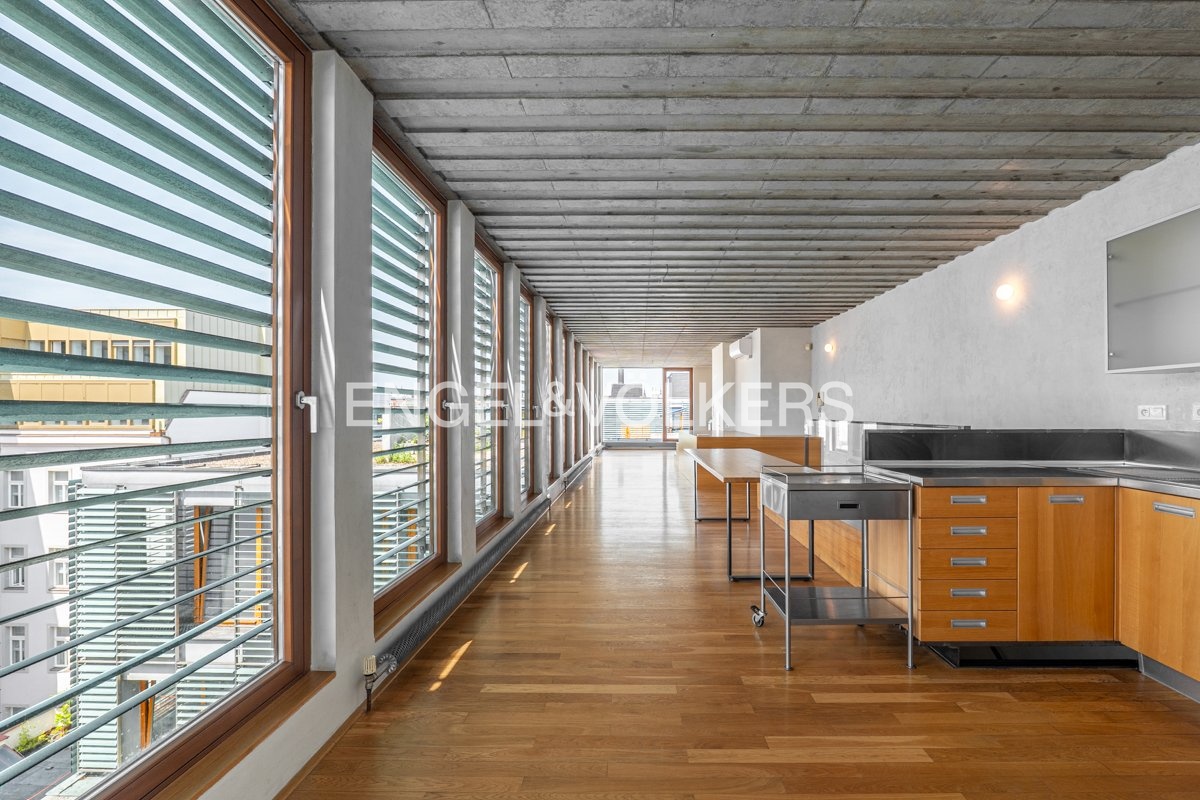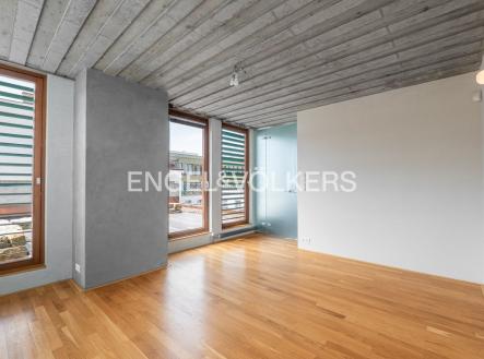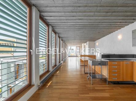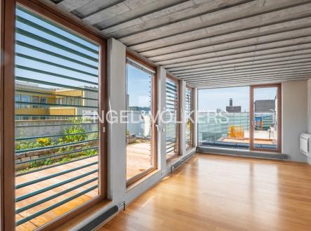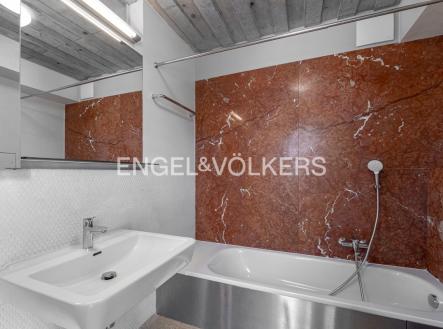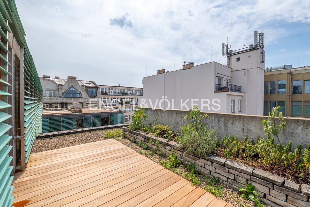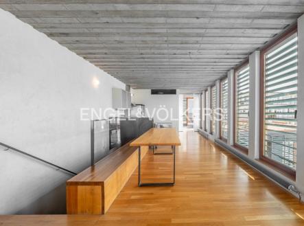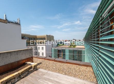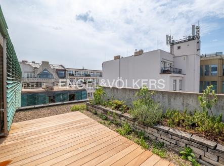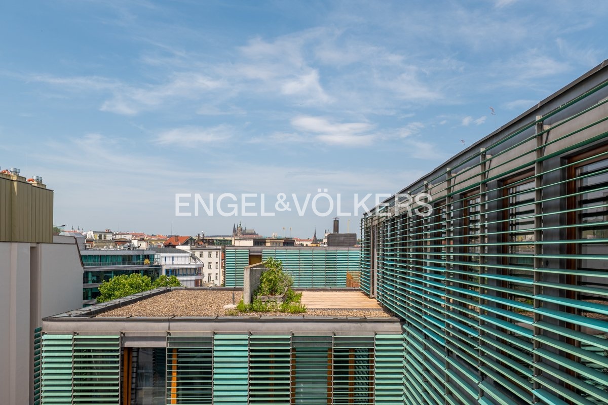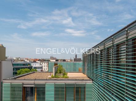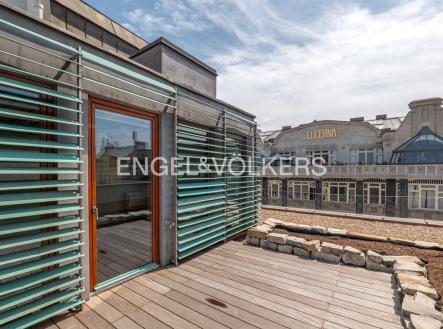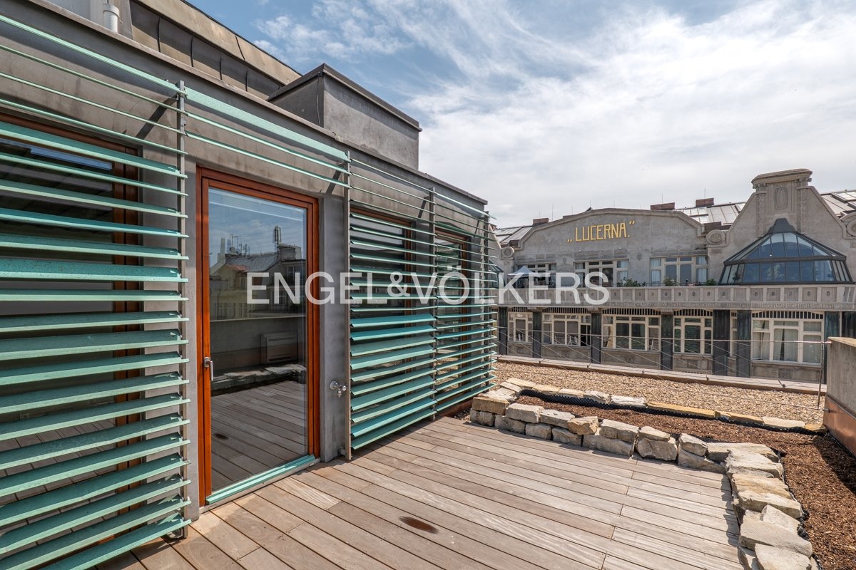 Palác Langhans byl před lety kompletně zrekonstruován a díky adici bylo možné přistavět moderní bytové nástavby na historický komplex z konce 19. století renomovaným architektonickým ateliérem Lábus AA. Z jedné strany je palác v kontaktu s ulicí Vodičkova a z druhé sousedí s Františkánskou zahradou. Má tak v centru unikátní místo s kombinací dopravní dostupnosti (tramvaje a metro), výhledů a klidu (Pražský hrad) i občanské vybavenosti (Václavské náměstí). Byt s oblíbenou dispozicí 2+kk v nejvyšším patře domu nabízí vstupní halu, vzdušný obývací prostor s plně vybaveným kuchyňským koutem a světlou ložnici. Koupelna je navržena v kombinaci mramoru a benátského štuku, vybavená vanou, umyvadlem a toaletou. Bonusem je venkovní prostor v podobě dvou teras. Světlo do bytu proniká hlukotěsnými okny skrze měděné žaluzie tvořící charakter celého projektu. Profilovaný pohledový beton tvoří výborný kontrast s masivní dubovou podlahou. Do bytu, který se nachází v šestém a sedmém nadzemním podlaží Vás zaveze výtah, který se nachází u recepce, která objekt střeží 24/7. Velkou výhodou je úložný prostor v podobě komory a klimatizace. V domě je centrální plynové topení, měsíční náklady na bydlení vychází 7 000 Kč/měsíc + převod elektřiny a internetu na nájemce. Vratná kauce je ve výši dvou měsíčních nájmů. Provize realitní kanceláři je jeden měsíční nájem + DPH.