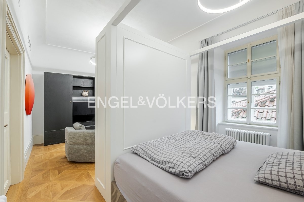 K pronájmu nabízíme plně zařízený, elegantní byt ve druhém nadzemním podlaží historického Pinkasova paláce na Malé Straně, jen pár kroků od Vltavy a Karlova mostu. Palác prošel kompletní rekonstrukcí, při které se dbalo na zachování původních prvků a zároveň na vytvoření moderní rezidence s výtahem, recepcí, wellness zónou s finskou a parní saunou a posilovnou. Apartmán nabízí vysoký standard bydlení v jedné z nejžádanějších pražských lokalit. Dispozici tvoří chytře rozdělený pokoj na spací a obývací část, samostatná kuchyně vybavená spotřebiči Miele a jídelním prostorem, koupelna se sprchovým koutem a vstupní chodba. Součástí vybavení je také pračka se sušičkou. Byt je vybaven klimatizací, dřevěnými podlahami a elektronicky ovládanými roletami. Pro nájemníky je možnost zvolit úroveň služeb od standardních až po exkluzivní, včetně hotelových služeb. Unikátní poloha přímo na Kampě zajišťuje výjimečnou atmosféru a zároveň skvělou dostupnost do centra města i na druhý břeh Vltavy. V těsné blízkosti se nachází stylové kavárny, restaurace, parky i historické památky. Měsíční poplatky činí 6 720 Kč. Zájemce je srozuměn s provizí realitní kanceláře ve výši jednoho měsíčního nájmu + DPH.