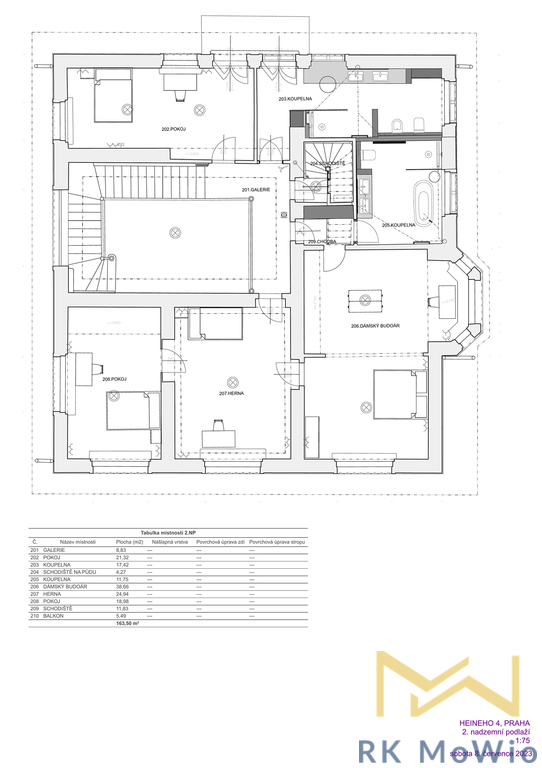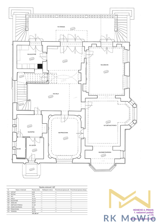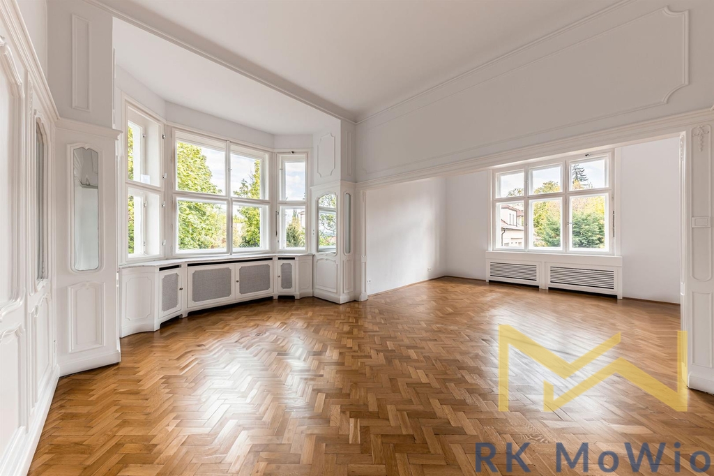 RK MoWio v exkluzivním zastoupení nabízí na prodej nadstandardní, prvorepublikovou vilu v prestižní lokalitě pražského Bubenče! Tato honosná, zrekonstruovaná, čtyř podlažní nemovitost pochází z let 1914 - 1920. Vila nabízí k užívání 8 ložnic a celkovou plochu 726 m2. Značnou výhodou je terasa o rozloze 32,79 m2, zimní zahrada (9,61 m2), balkón o výměře 5,49 m2 a zahrada, v ulici Heineho v reprezentativní lokalitě diplomatické čtvrti Prahy 6 - Bubeneč, v blízkosti zahraničních ambasád. Přízemí této luxusní nemovitosti tvoří vstupní předsíň, přijímací hala s původním schodištěm a průchozí šatna, prostorný obývací pokoj, jídelna a oddělená kuchyně, pracovna, zimní zahrada a samostatná toaleta. Terasa je přístupná z jak jídelny, tak z haly a obývacího pokoje. V prvním patře naleznete hlavní ložnici s privátní koupelnou, vybavenou vanou, sprchou, dvěma umyvadly a toaletou, druhou ložnici se vstupem na balkón, další dvě ložnice, oddělenou koupelnu se sprchovým koutem, dvěma umyvadly, bidetem a toaletou se vstupem na balkón. Druhé patro disponuje chodbou, hlavní ložnicí se soukromou koupelnou, dalšími třemi ložnicemi, samostatnou koupelnou a praktickou šatnou. V suterén domu se nachází vinný sklípek, prádelna, úložné prostory a technické zázemí (kotelna, sklad). Vybavení domu zahrnuje kuchyňskou linku se spotřebiči značky Miele (včetně lednice s mrazákem, sklokeramické varné desky, digestoře, zabudované elektrické a mikrovlnné trouby), vestavěné skříně z dřevěného masivu, štuky a úložné prostory, sanita Villeroy & Boch a Hansgrohe, plynový kotel, přípojka pro pračku a sušičku, francouzská okna, alarm, zrenovované původní dřevěné plochy a podlahy, italská velkoformátová dlažba a obklady. Vila má inteligentní systém řízení domácnosti Loxone Smart Home (ovládání přes chytrý telefon), podlahové vytápění v kuchyni a koupelnách, WiFi 6, kamerový systém, shoz prádla. Na pozemku je možnost parkovacího stání a dobíjení elektromobilu. Nemovitost se nachází ve vyhledávané lokalitě Prahy 6 - Bubeneč. V okolí se nachází mnoho zahraničních ambasád a veškerá občanská vybavenost (restaurace, kavárny, supermarkety, poliklinika a podobně). Rodiny ocení snadnou dostupnost do mezinárodních škol - Riverside school, International School Prague, Park Lane International School. Pro relaxaci v zeleni je oblíbená Královská obora Stromovka či Letenské sady. Realitní kancelář nemá k dispozici energetický štítek, proto uvádíme podle vyhlášky 78/2013 Sb. třídu energetické náročnosti budovy G.