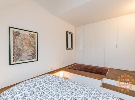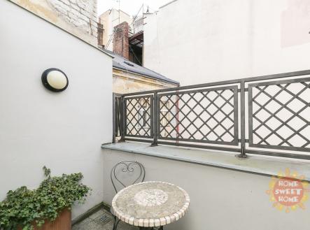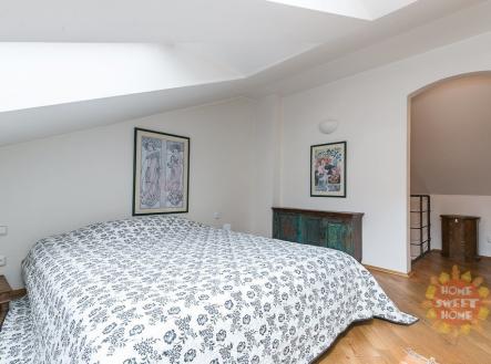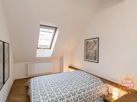 Luxusně zařízený mezonetový podkrovní byt v 5. a 6.patře cihlového domu s výtahem o celkové rozloze 126 m2 se nachází ve velice lukrativní oblasti s magickým výhledem na Nové Město. V bytě se nachází původní otevřená kuchyně orientovaná do obývacího pokoje; okouzlující prostředí s vysokým nábytkem a orientálními koberci (jídelna a obývací pokoj, kuchyň, 2 ložnice, 2 koupelny, 2 sklady, terasa 4m2). 1. úroveň: vstupní hala; jídelna a obývací pokoj s TV, plně vybavená kuchyň s jídelním koutem, dvoulůžková ložnice s rozkládací skříní a vestavěnou skříní, koupelna se sprchou, 2 sklady a terasa. 2. úroveň: vstupní hala; dvoulůžková ložnice s vestavěnou skříní, koupelna s vanou. Minimální délka pronájmu činí 1 rok, ubytování formou Airbnb nelze realizovat.