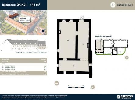 Dovolujeme si vám nabídnout komerční prostor o celkové výměře 141 m² umístěný v 1.NP, který je součástí 2. etapy unikátního projektu Jinonický dvůr. Komerční prostor není zkolaudovaný, kupující si musí sám zajistit vydání kolaudačního rozhodnutí. Nabídka ve stavu SHELL & CORE umožnuje přizpůsobení prostor potřebám budoucího uživatele komerční jednotky. Uzavřený rezidenční areál se nachází v klidné části atraktivní lokality Prahy 5 Jinonicích, v blízkosti přírodního parku KošířeMotol a Prokopského údolí. V rámci druhé etapy vznikly originální komerční prostory s původními klenbovými stropy, které dle stavebního povolení mohou sloužit pro komerční využití: provoz obchodů a služeb běžné občanské vybavenosti (lékárna, květinářství, optika, domácí potřeby, cukrárna, prodejna oděvů, prodejna potravin, pekárna bez výrobny, pouze prodej pečiva a pekařských výrobků). Přiložené vizualizace znázorňují prostor využitý pro kancelář, kadeřnictví či fitness centrum. Lokalita je vzdálena pouhých deset minut jízdy autem nebo 20 minut jízdy městskou hromadnou dopravou do centra Prahy a zároveň je velmi dobře dostupná z pražského letiště. V blízkosti Jinonického dvora se nachází veškerá občanská vybavenost, ať už jde o školu, mateřskou školku, sportoviště nebo nákupní centrum Galerie Butovice, které je vzdáleno pouze 10 minut chůze, podobně jako stanice metra, která je dostupná autobusem nebo za 5 minut chůze. Cena nezahrnuje garážové stání, které si lze dokoupit. V případě zájmu nás neváhejte kontaktovat. Prodej přímo od majitele. Více informací o této komerční jednotce a kompletní nabídce najdete na webu www.creditasre.cz.