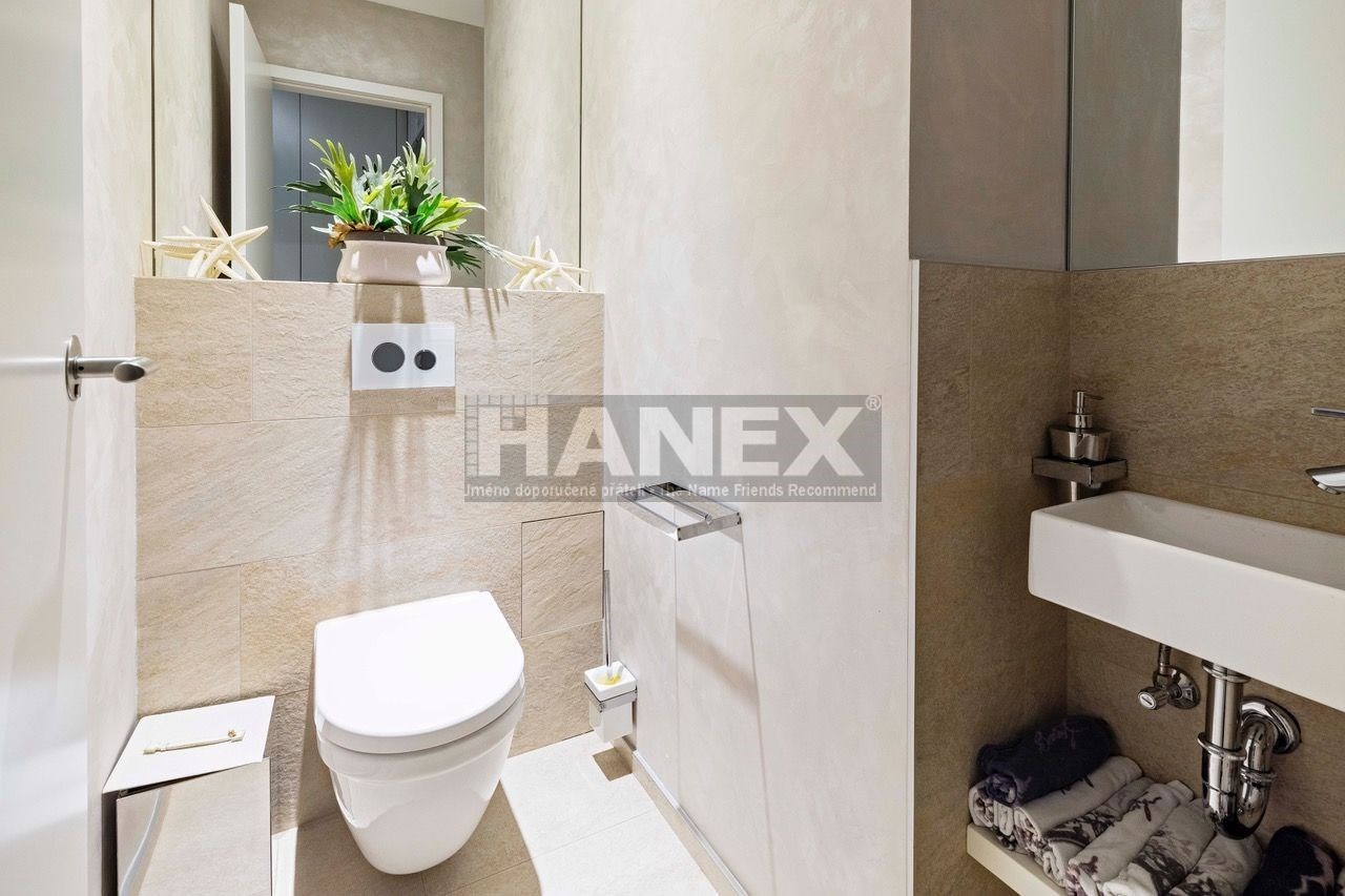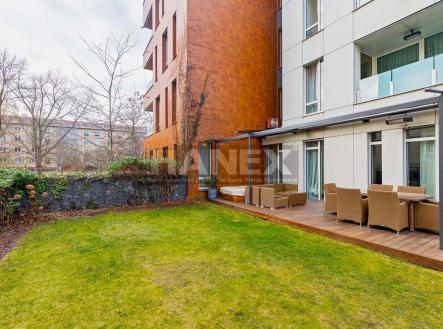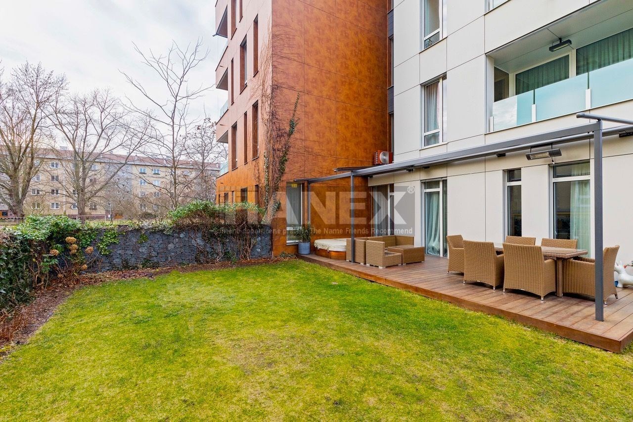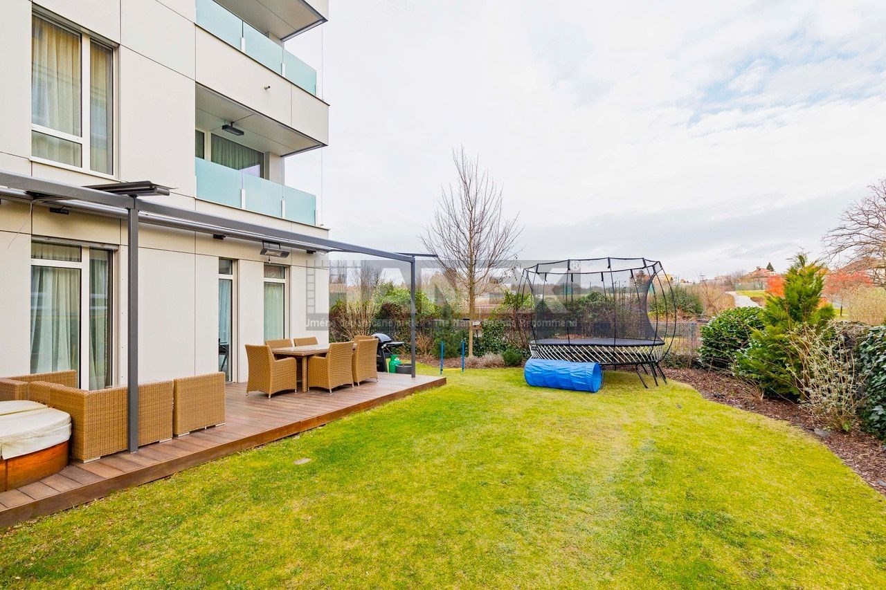 Moderní designový byt 3+kk (99 m2) s velkou privátní zahradou (200 m2), parkovacím stáním a sklepem v luxusní rezidenci v Praze 4 – Hodkovičkách. Nadstandardně vybavený a zařízený byt vás nadchne svou velkorysou dispozicí a vzdušností. Plně klimatizovaný byt nabízí 2 ložnice, prostornou šatnu – walk in closet, koupelnu s vanou, sprchový kout a toaletou a samostatnou toaletu. Z obývacího pokoje (40 m2) s kuchyňským koutem je přímý vstup do zahrady. Kuchyňská linka s ostrůvkem je vybavena kvalitními vestavěnými spotřebiči. Luxusní bydlení doplňuje krytá terasa s vířivkou. Předokenní žaluzie. Orientace bytu jih a východ. V budově je recepce s ostrahou 24 hodin, kamerový systém, společenská místnost, vinotéka k využití pro rezidenty. Byt je připojen na recepci a centrální pult ochrany. Příjemné bydlení v zeleni v blízkosti centra, snadná dostupnost významných sportovních a volnočasových center – golf, tenis, squash, cyklostezky a trasy pro inline bruslení u Vltavy. Poplatky jsou zvlášť 13.900,– Kč + elektřina bude převedena na nájemce.