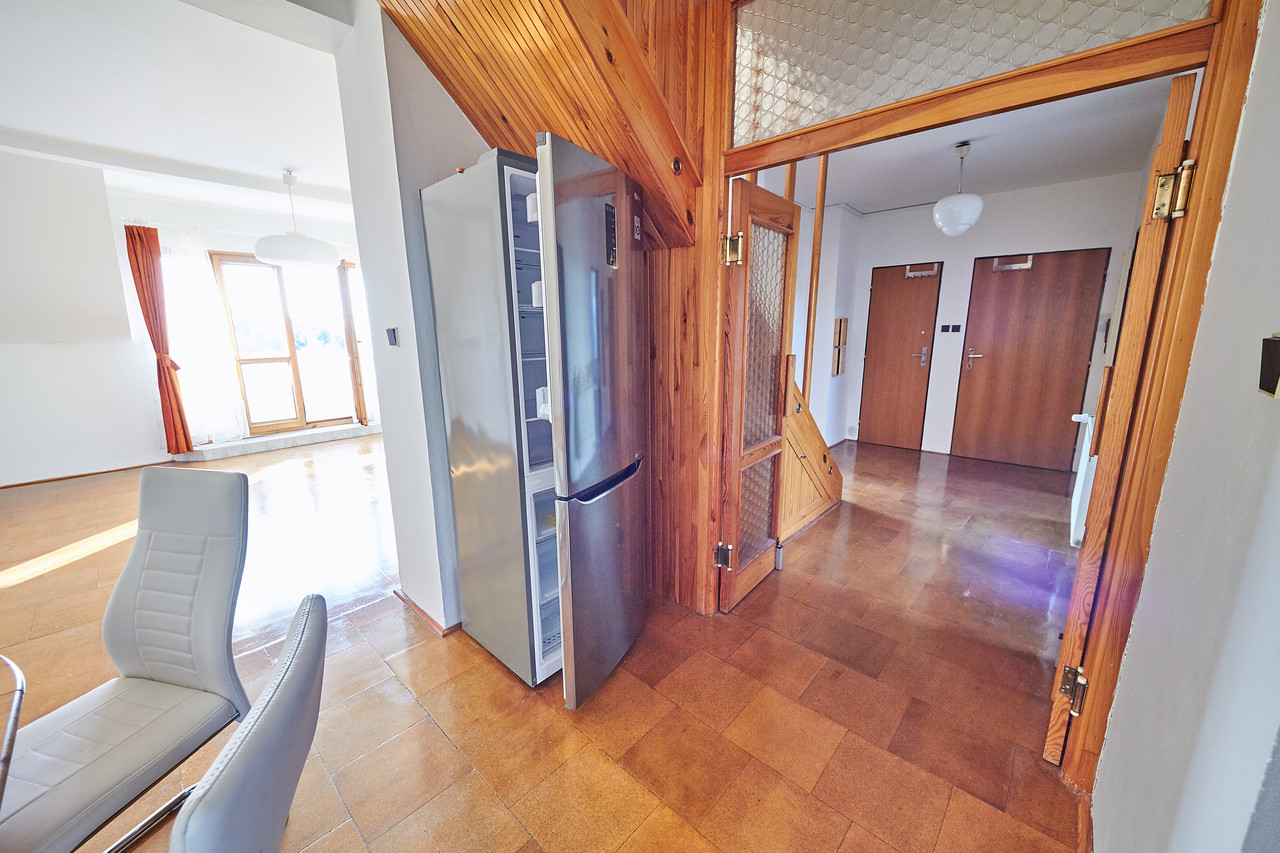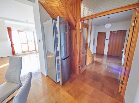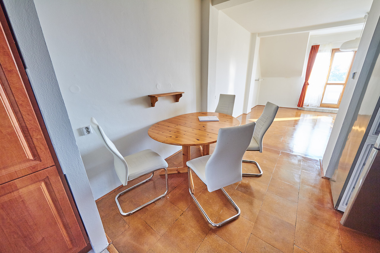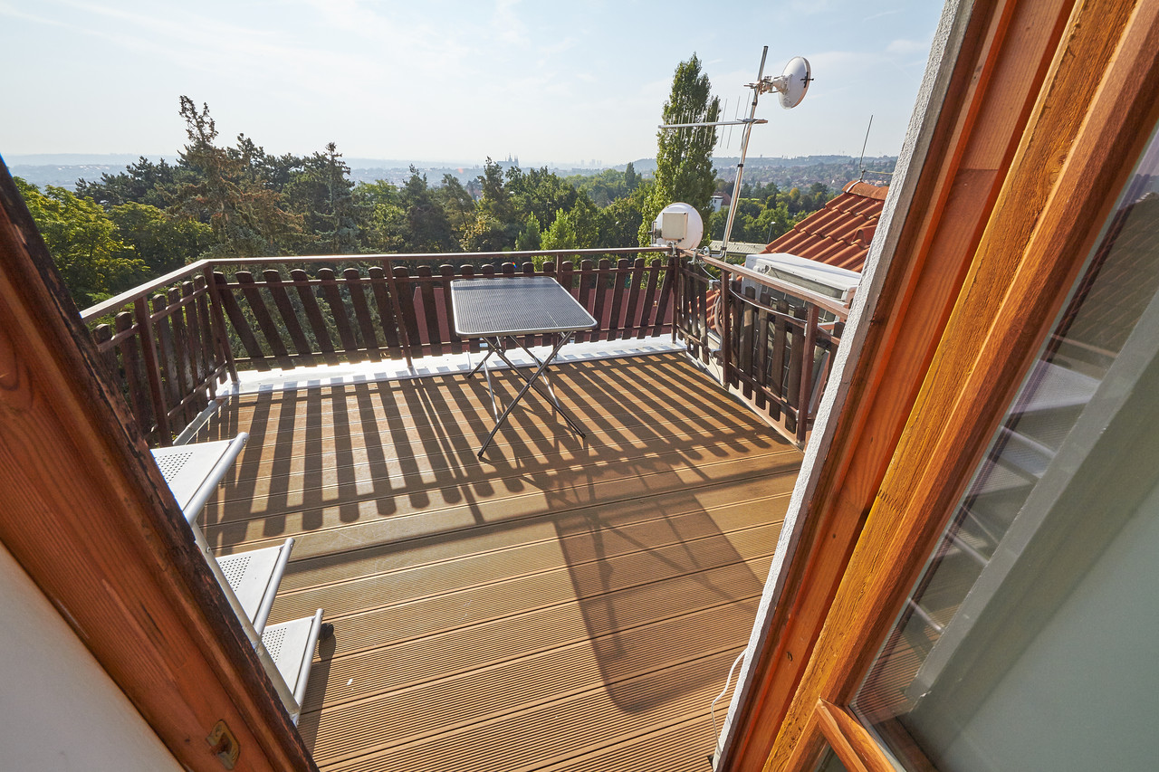 Prostorný mezonetový byt 3+kk s terasou a balkonem, v prestižní čtvrti Hanspaulka. Byt ve 3.patře bytového domu v nádherném prostředí pražské Hanspaulky. V dolním patře bytu se vpravo nalézá prostorná ložnice s dvoulůžkem, šatní skříní, saunou a klimatizací. Vpravo v chodbě vedle ložnice je prostorná komora, ve které je aktuálně umístěna sušička prádla AEG. Vlevo proti ložnici je samostatné WC a samostatná koupelna s vanou, sprchovým koutem, dvojumyvadlem a pračkou Samsung.Chodba v dolní části bytu ústí do obývací části bytu, v jejíž levé části je kuchyňský kout s plně vybavenou kuchyní s keramickou varnou deskou, digestoří, el. troubou, myčkou nádobí AEG a mikrovlnkou. Na kuchyňský kout navazuje malá jídelna s jídelním stolem a dále obývací pokoj 25m2 s klimatizací a vstupem na malý balkon.Z chodby v dolní části bytu je vstup schodištěm do patra, kde je předsíňka cca 11m2 se vstupem na terasu 9m2 s nádherným panoramatickým výhledem na Prahu. Z předsíňky vpravo je dále vstup do ložnice cca 17m2 s dvěma lůžky. Dobré dopravní spojení bus - metro A Bořislavka. Volné ihned.