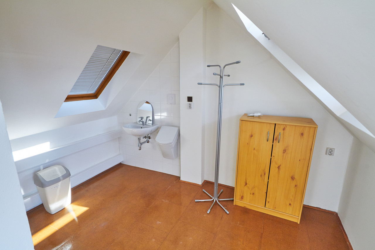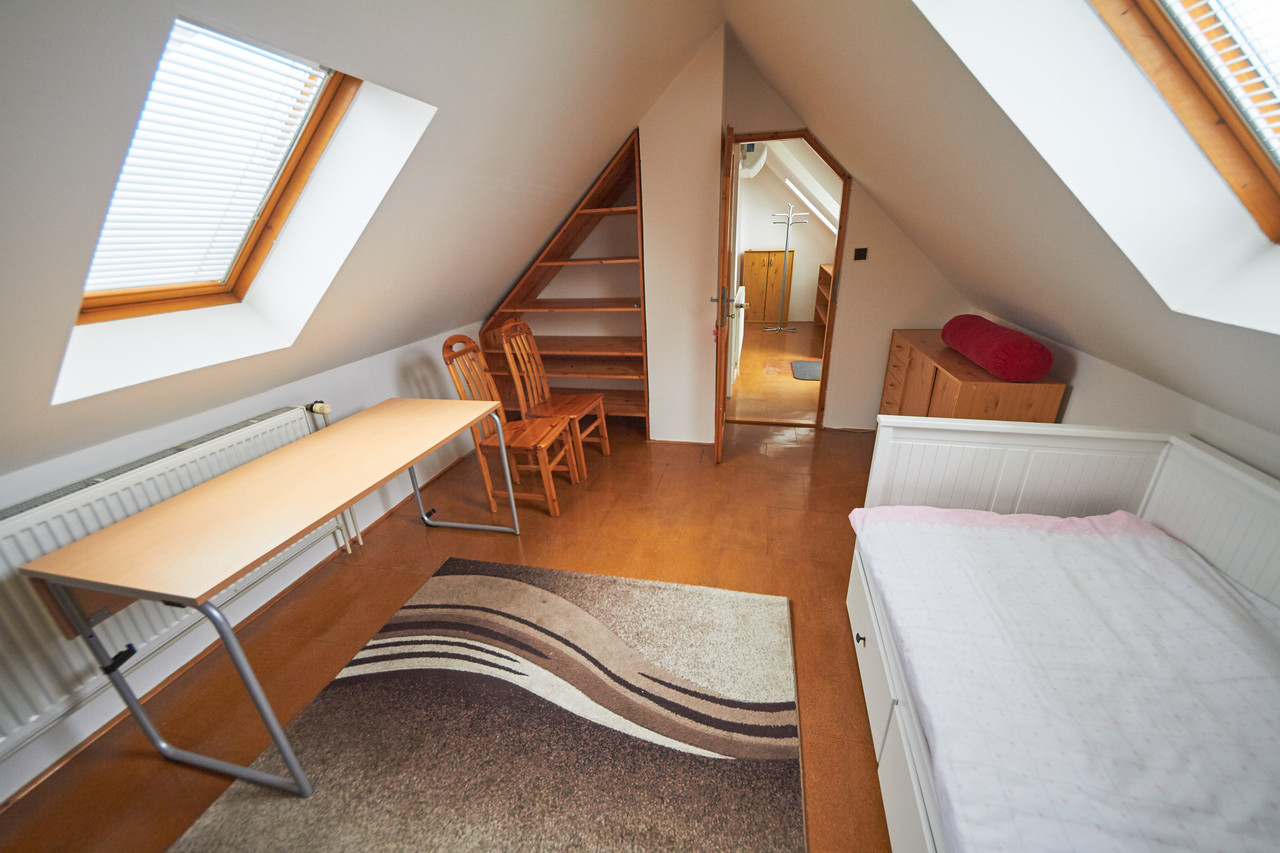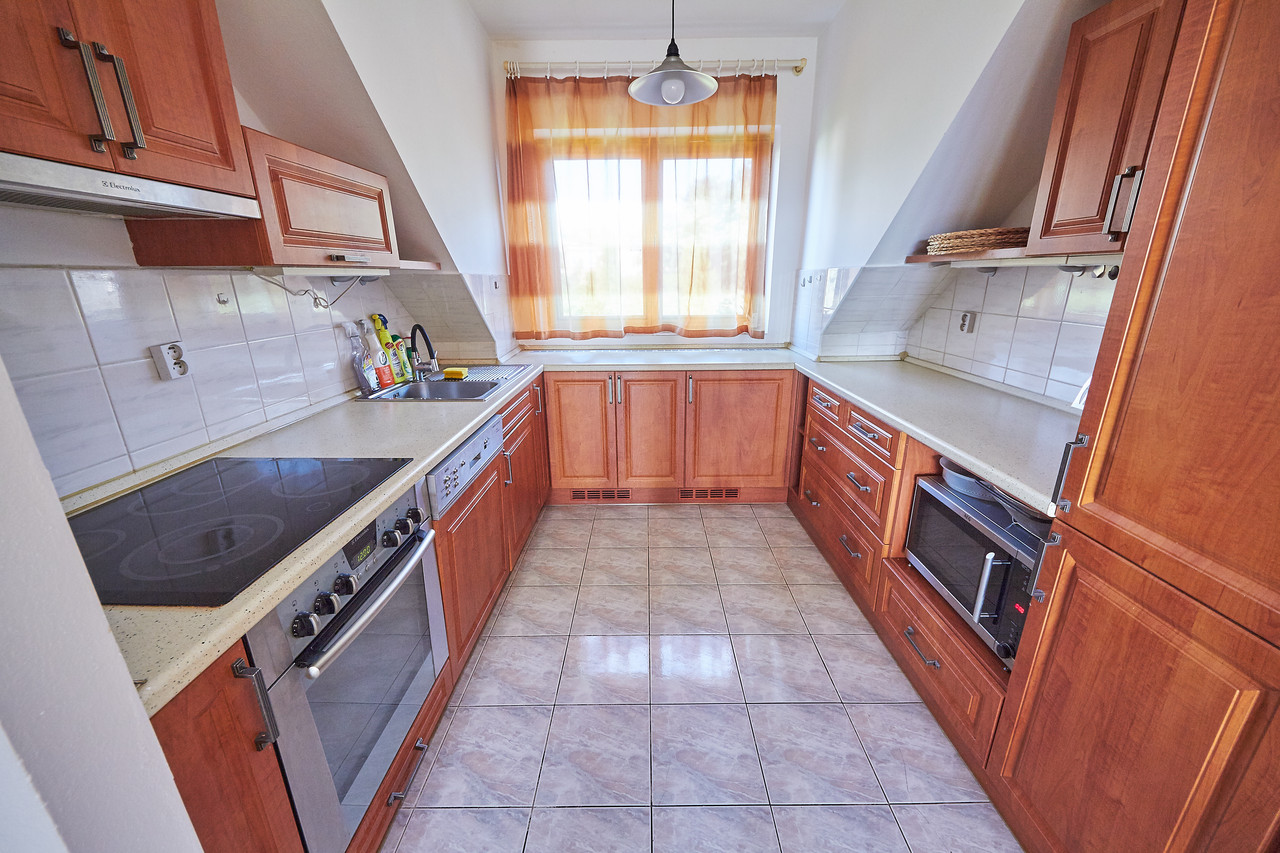 Prostorný mezonetový byt 3+kk s terasou a balkonem, v prestižní čtvrti Hanspaulka. Byt ve 3.patře bytového domu v nádherném prostředí pražské Hanspaulky. V dolním patře bytu se vpravo nalézá prostorná ložnice s dvoulůžkem, šatní skříní, saunou a klimatizací. Vpravo v chodbě vedle ložnice je prostorná komora, ve které je aktuálně umístěna sušička prádla AEG. Vlevo proti ložnici je samostatné WC a samostatná koupelna s vanou, sprchovým koutem, dvojumyvadlem a pračkou Samsung.Chodba v dolní části bytu ústí do obývací části bytu, v jejíž levé části je kuchyňský kout s plně vybavenou kuchyní s keramickou varnou deskou, digestoří, el. troubou, myčkou nádobí AEG a mikrovlnkou. Na kuchyňský kout navazuje malá jídelna s jídelním stolem a dále obývací pokoj 25m2 s klimatizací a vstupem na malý balkon.Z chodby v dolní části bytu je vstup schodištěm do patra, kde je předsíňka cca 11m2 se vstupem na terasu 9m2 s nádherným panoramatickým výhledem na Prahu. Z předsíňky vpravo je dále vstup do ložnice cca 17m2 s dvěma lůžky. Dobré dopravní spojení bus - metro A Bořislavka. Volné ihned.