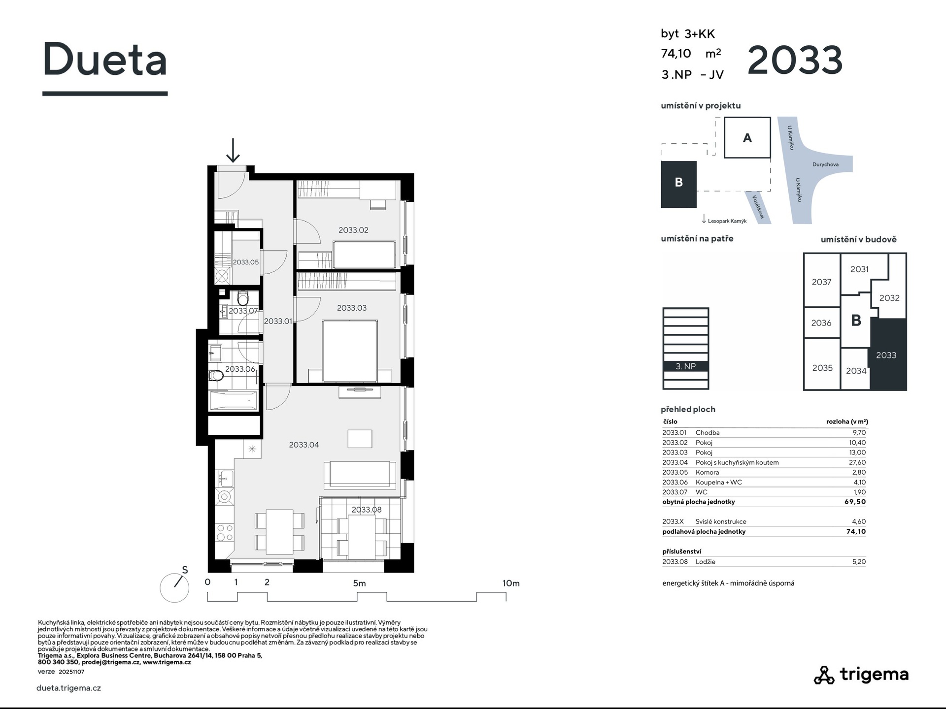 Apartment No. 2033: Spacious 2-Bedroom (3+kk) with Loggia & South-East Orientation New build in a successful development just 5 minutes from the future Metro D station! Located directly adjacent to the Kamýk Forest and neighboring park, this project offers stunning views of both the greenery and the Prague skyline. With construction already underway and 40% of units sold within the first 6 months, now is the time to secure your future home. Apartment No. 2033 offers a generous 3+kk (2-bedroom) layout with a total floor area of 74.1 sqm, providing ample space and comfort for family living. Situated on the 2nd floor of the Dueta Kamýk project, its South-East orientation ensures bright, sun-filled mornings. Interior & Layout The heart of the home is a spacious living room with a kitchenette (27.6 sqm), complemented by two well-proportioned bedrooms (10.4 sqm and 13.0 sqm). Total area includes a 5.2 sqm loggia for outdoor relaxation and a 2.8 sqm utility/storage room (komora) inside the apartment, a main bathroom with a toilet (4.1 sqm) plus an additional separate guest toilet (1.9 sqm). Key Benefits of Unit 2033: - Generous 3+kk layout with a private loggia. - South-East orientation for beautiful morning light. - Energy Class A – exceptionally low monthly utility costs. The apartment is equipped with high-end technologies for a healthy and comfortable lifestyle: - Heat recovery ventilation (recuperation) - Underfloor heating throughout. - External electric blinds for privacy and temperature control. - High-quality materials ensuring long-term durability. Project & Location The building is currently under construction with an estimated completion date of July 2027. The Dueta Kamýk project will also feature its own commercial spaces, including a planned supermarket, fitness center, and other local services. The exceptional location right by the Kamýk Forest offers tranquility at your doorstep, while the upcoming Metro D (Nové Dvory station) ensures rapid access to the city center. The surrounding neighborhood boasts excellent civic amenities, including schools and medical facilities. Dueta Kamýk is the ideal choice for a family home or a smart investment in one of Prague’s fastest-growing locations.