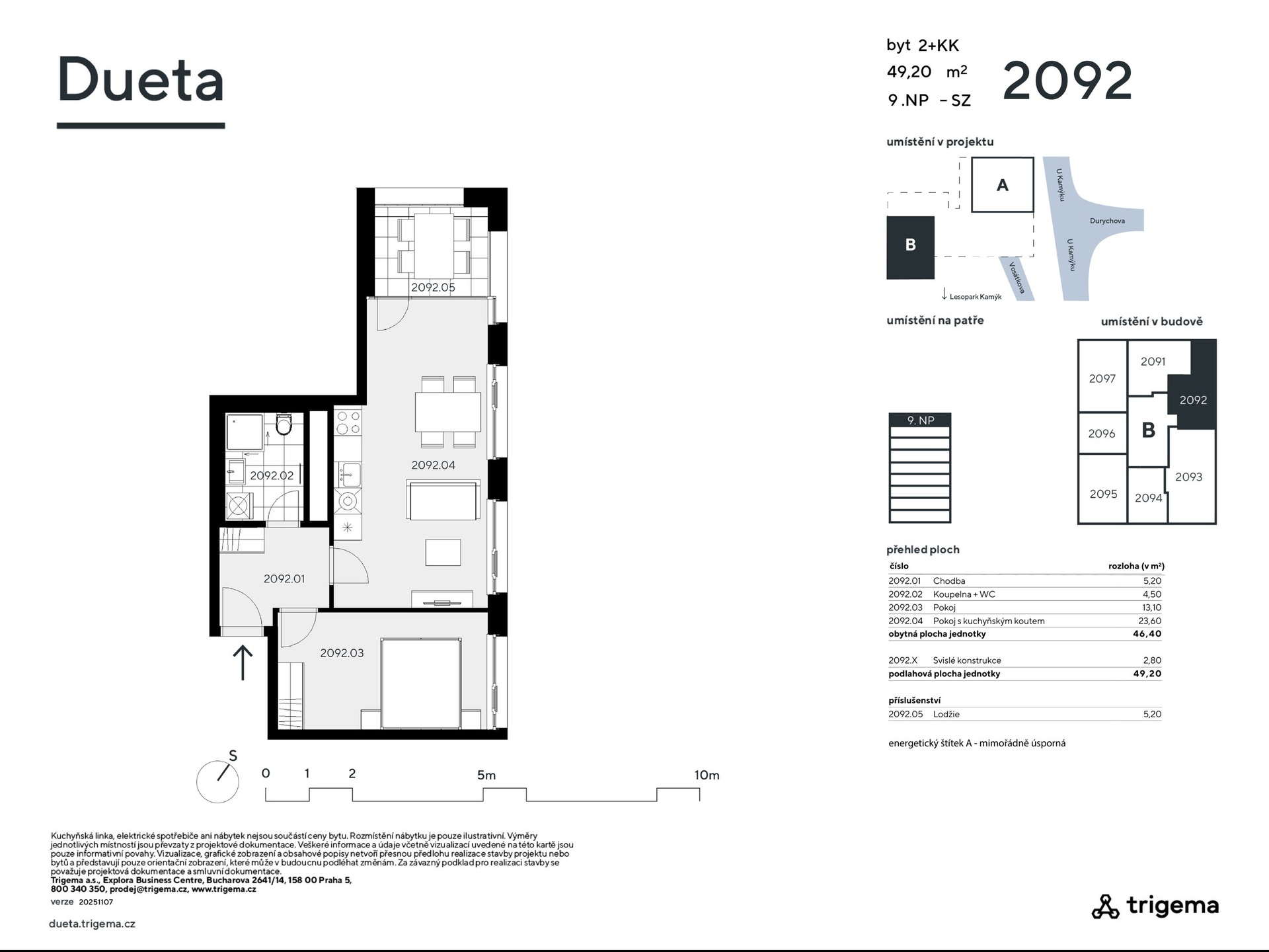 Apartment No. 2092: Modern 1-Bedroom (2+kk) with Loggia and North-East Orientation Construction has begun – 40% of apartments sold in just 6 months! Don’t miss out on your chance to choose the perfect layout and orientation in the attractive Dueta Kamýk project, where modern living meets nature. Apartment No. 2092 offers a practical 2+kk (1-bedroom) layout with a total floor area of 49.2 sqm. This unit is designed to maximize natural daylight and provides spacious rooms for comfortable city living. Situated on the 9th floor, its North-East orientation ensures plenty of morning sun and a bright interior. The interior consists of a bright living room with a kitchenette (23.60 sqm), a bedroom, a hallway, and a modern bathroom with a toilet. A wonderful bonus is the spacious 5.20 sqm loggia, perfect for morning coffee or outdoor relaxation. - High-quality standards and premium finishes throughout. - Practical 2+kk layout with an emphasis on efficient space utilization. - Energy Class A – exceptionally energy-efficient for low running costs. Ideal for: Couples, singles, or investors seeking a modern, practical home in a high-demand location. About the Dueta Kamýk Project Dueta Kamýk offers a unique combination of peaceful living surrounded by nature and excellent accessibility to Prague’s city center, thanks to the planned Metro D line. The location provides immediate access to forest parks and extensive greenery, alongside attractive elevated views. The apartments are equipped with premium technologies for maximum comfort and cost-effective operation: - Heat recovery ventilation (recuperation) - Underfloor heating - External window blinds Dueta Kamýk is the perfect solution for both personal housing and a smart investment in a rapidly developing location.