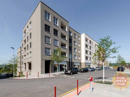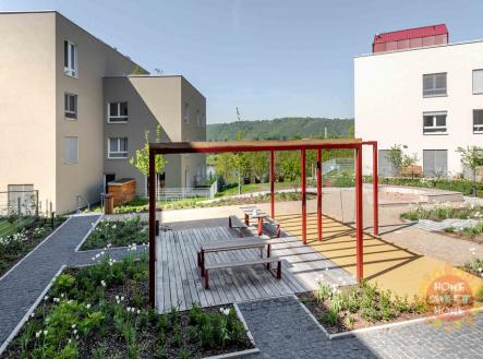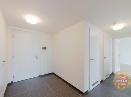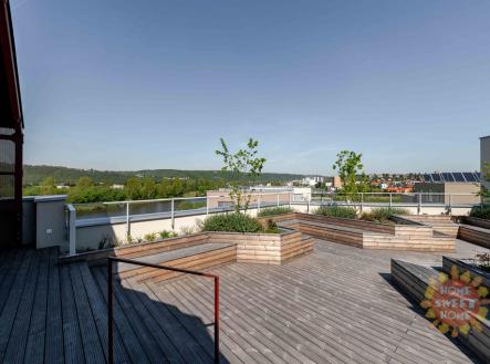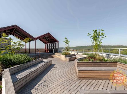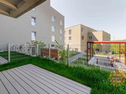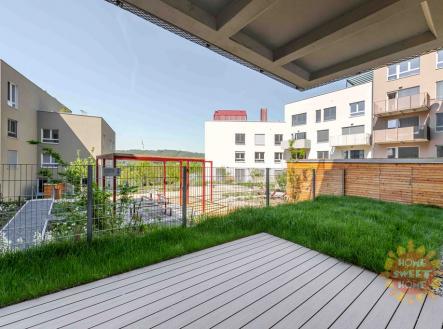 Modřany, moderní byt 3+kk k pronájmu, předzahrádka, terasa, garážové stání, sklep, ul. Kolmanova