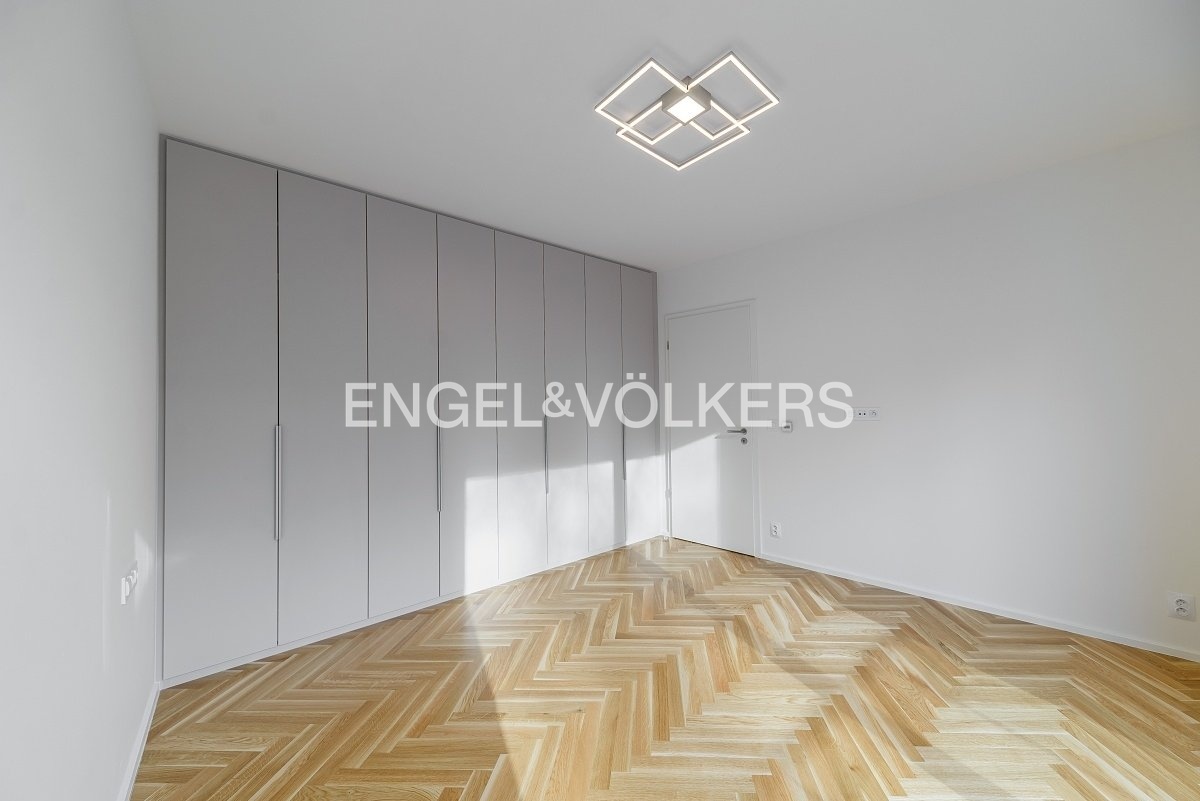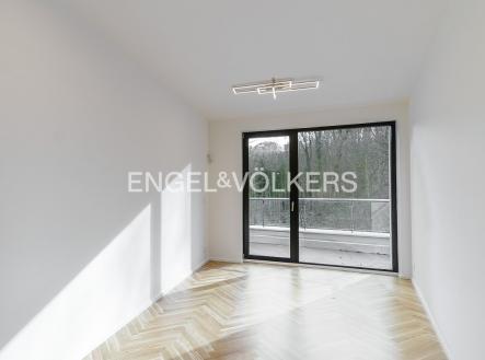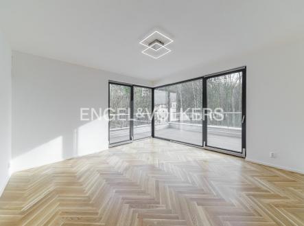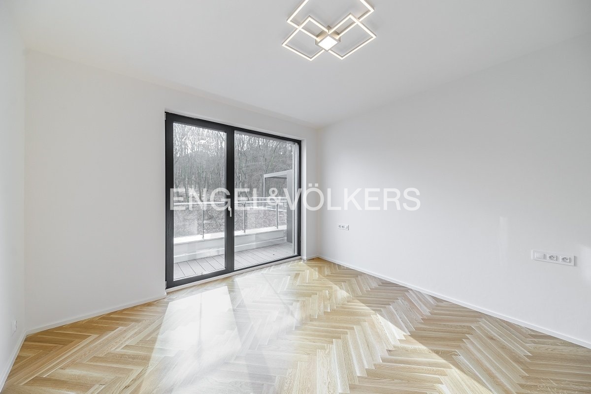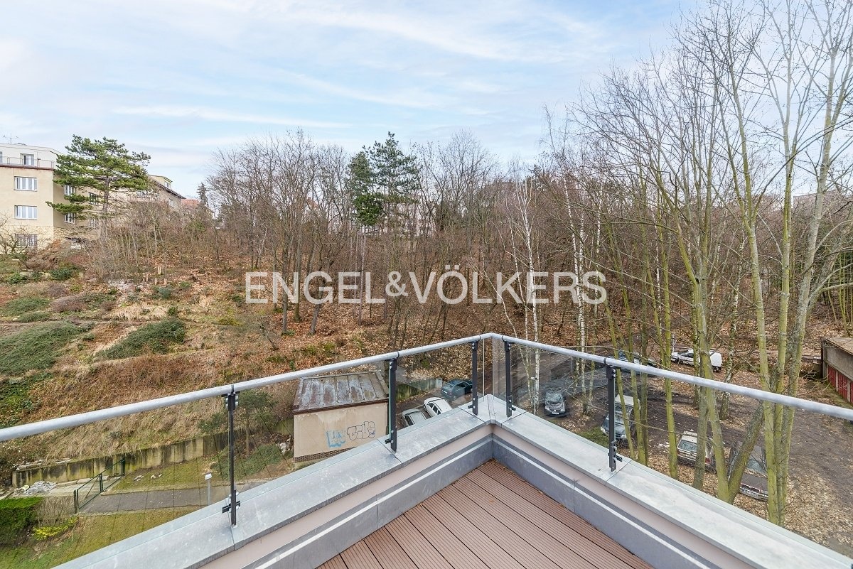 Od 1. 5. 2026 je připraven k nastěhování prostorný byt 3+kk v nejvyšším podlaží nově dokončené budovy v klidné rezidenční části Smíchova. Vysoké provedení bytu podtrhují masivní dřevěné podlahy, automatické předokenní rolety, hliníková okna, bezpečnostní zařízení a podlahové topení. Srdcem apartmánu je světlý obývací pokoj spojený s kuchyňským koutem s vestavěnými spotřebiči. Z obývacího pokoje je vstup přes francouzská okna na velkorysou rohovou terasu s výhledem do zeleně. V bytě jsou dvě samostatné ložnice, jedna z nich má vstup na vlastní balkon a vestavěnou šatní skříň. Koupelna je zařízena vanou a toaleta je samostatná. Vstupní hala disponuje další prostornou šatní skříní. Součástí pronájmu jsou dvě parkovací stání v podzemních garážích a sklep, je zde možnost i nabíjení elektroauta. Klidná lokalita nabízí spoustu zeleně a zároveň spoj do centra města jak autem, tak i MHD je velmi rychlý.