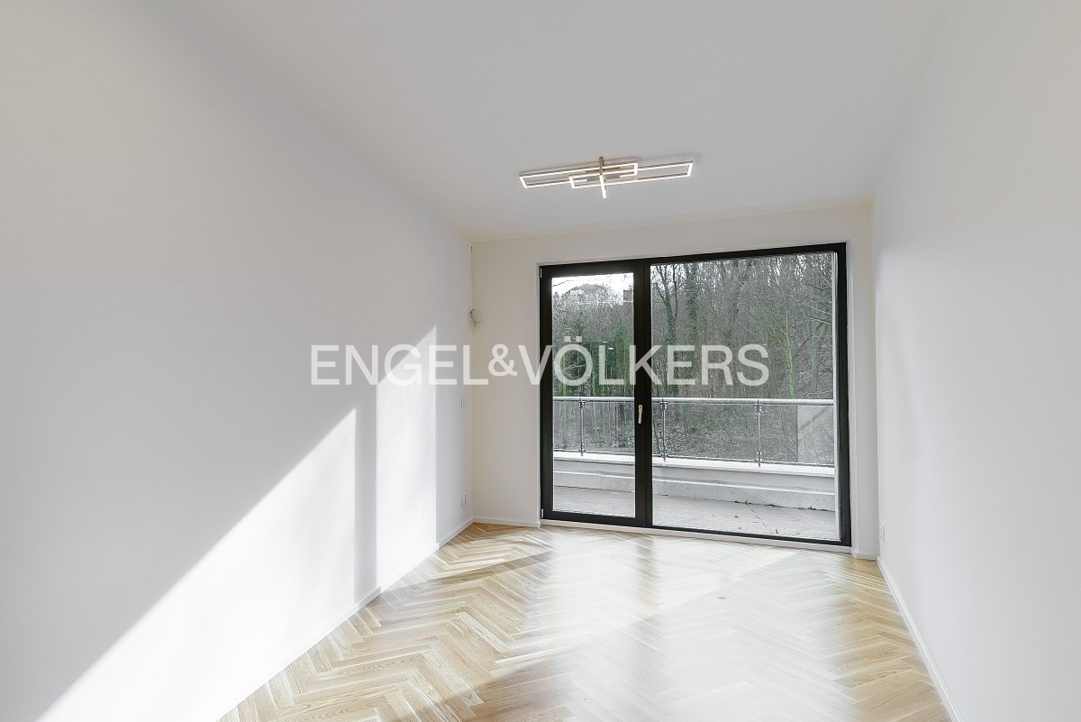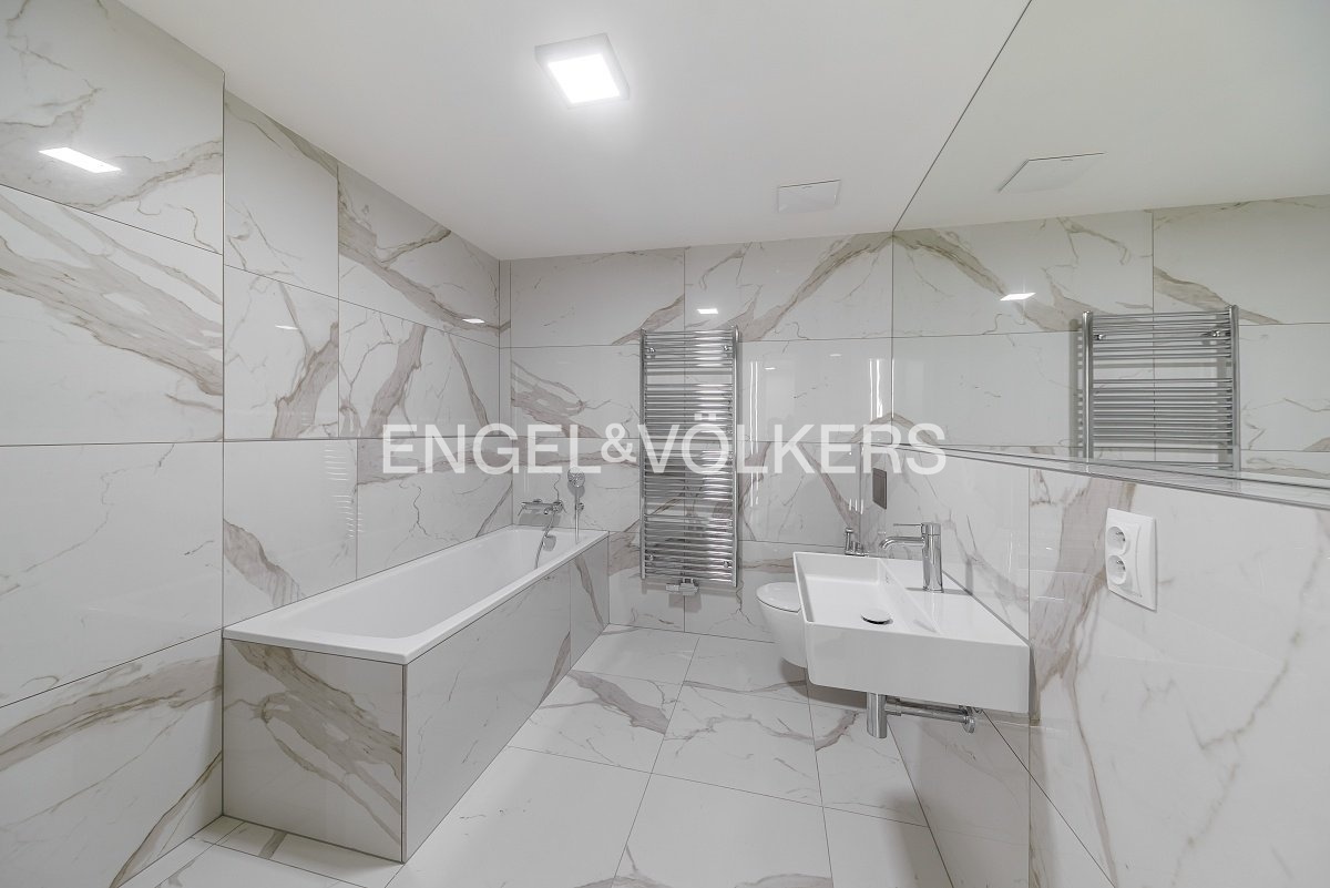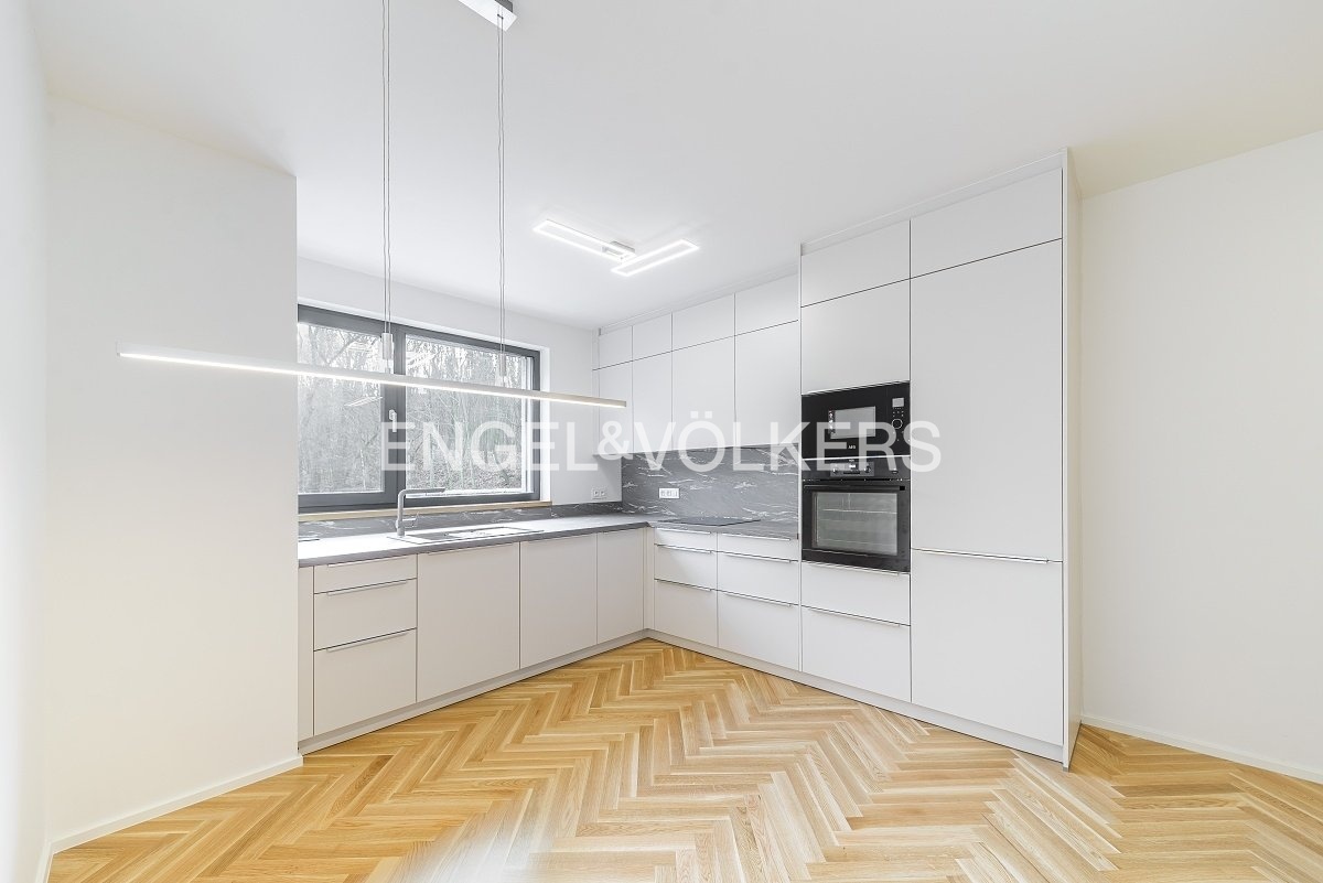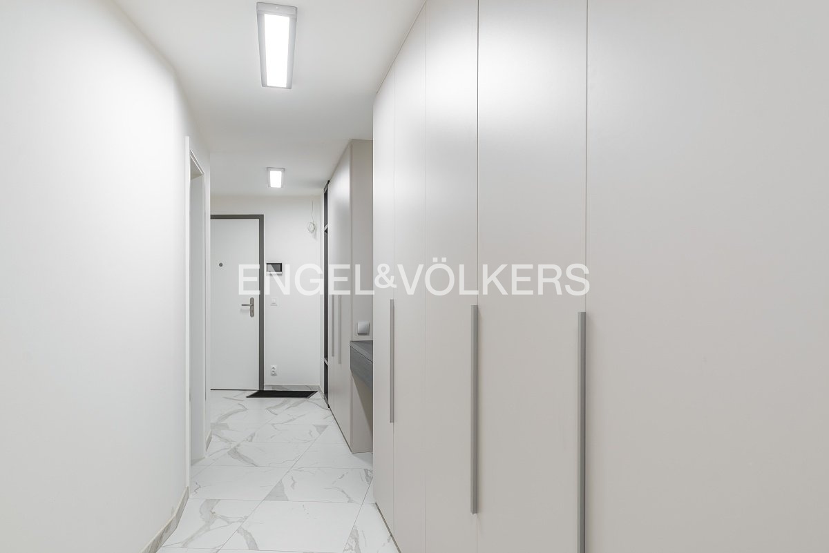 Od 1. 5. 2026 je připraven k nastěhování prostorný byt 3+kk v nejvyšším podlaží nově dokončené budovy v klidné rezidenční části Smíchova. Vysoké provedení bytu podtrhují masivní dřevěné podlahy, automatické předokenní rolety, hliníková okna, bezpečnostní zařízení a podlahové topení. Srdcem apartmánu je světlý obývací pokoj spojený s kuchyňským koutem s vestavěnými spotřebiči. Z obývacího pokoje je vstup přes francouzská okna na velkorysou rohovou terasu s výhledem do zeleně. V bytě jsou dvě samostatné ložnice, jedna z nich má vstup na vlastní balkon a vestavěnou šatní skříň. Koupelna je zařízena vanou a toaleta je samostatná. Vstupní hala disponuje další prostornou šatní skříní. Součástí pronájmu jsou dvě parkovací stání v podzemních garážích a sklep, je zde možnost i nabíjení elektroauta. Klidná lokalita nabízí spoustu zeleně a zároveň spoj do centra města jak autem, tak i MHD je velmi rychlý.