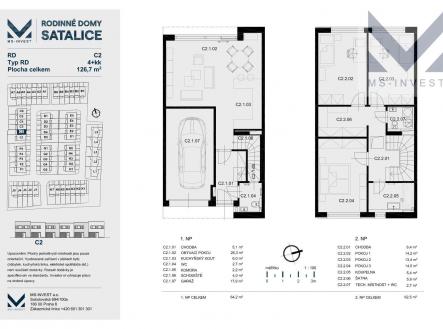 V rámci projektu RD Satalice. který je umístěn v nově vzniklé ulici Hubačova se nachází nabízený dům C- 2 o velikosti 4+kk a celkové podlahové ploše 127 m s pozemkem o ploše 186m2 disponuje v 1. NP vlastní garáží, šatnou, komorou, toaletou, prostorným obývací pokojem s kuchyňským koutem o ploše 30 m a navazující terasou propojující dům se zahradou. Zahrada je orientována na západ, sousedí se zahradami stávajících rodinných domů. Ve 2. NP se nachází hlavní ložnice o ploše 15 m, dále 2 další ložnice, koupelna s vanou a samostatné WC spojené s technickou místností. Pozemek tohoto domu má velikost 185 m . Tento dům je jako jeden z posledních dostupných domů v projektu vybaven přípravou na osazení chlazení klimatizace ve všech obytných místnostech. Tento dům má výhodnou polohu na okraji projektu, kde navazuje na zahrady stávající zástavby. Kromě vlastní garáže je možné parkovat další auto na vlastním pozemku před domem. V ceně domu je mimo jiné fotovoltaika s bateriovým úložištěm a napojením do distribuční soustavy, reteční nádrž na dešťovou voudu s čerpadlem a dálkově ovládané hliníkové předokenní žaluzie na všech oknech. Domy jsou již dokončeny, zkolaudovány a připraveny k nastěhování. Prodej přímo od developera.