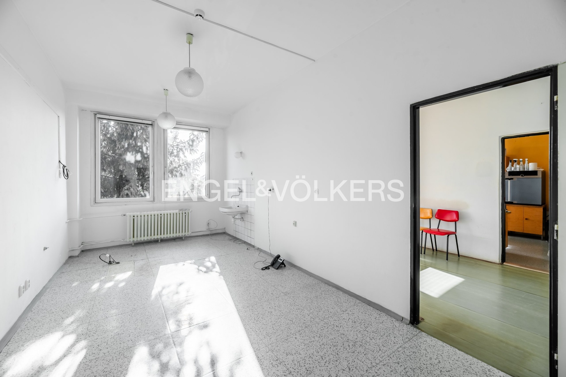 K pronájmu nabízíme prostory, které jsou vhodné pro zubní ordinaci (ale ne pro dentální hygienu), pneumologii a ftizeologii, alergologii nebo revmatologii v poliklinice na pražském Břevnově. Vstup do prostor je přes vstupní halu budovy, přístup do patra je možný po schodech nebo výtahem. K ordinaci patří čekárna v samostatné místnosti, která je sdílená se sousední stomatologickou ordinací. Prostorná místnost obdélníkového tvaru má dvě plastová otevíratelná okna s dvojsklem a s kovovými vodorovnými žaluziemi, je dostatečně prosvětlená, přírodní světlo doplňují dva lustry a lampa nad každým ze dvou umyvadel. Podlaha s dlažbou splňuje hygienické podmínky pro lehké omývání. V podlaze je zasazen přípojný bod elektrického vedení pro napojení zubařského křesla. Pro více informací nebo prohlídku nás kontaktujte. Fotografie jsou ilustrativní a místnost sousedí se společnou čekárnou na pravé straně.