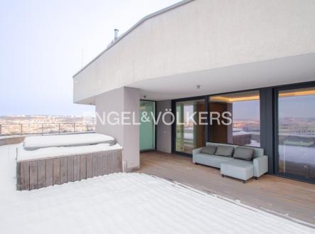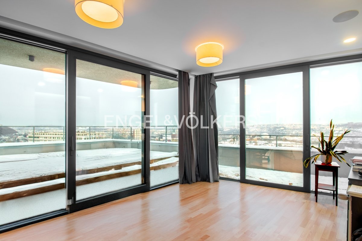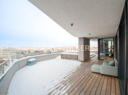 K pronájmu reprezentativní penthouse o dispozici 6+kk jako jediný v nejvyšším patře projektu Byty Krejcárek. Tato rezidence nabízí maximální soukromí a nadstandardní vybavení s výhledem na panorama Prahy. Interiér a vybavení: Obytný prostor: Centrální obývací pokoj plynule propojený s jídelní částí. Kuchyně: Plně vybavená minimalistická kuchyňská linka v bílé barvě s vestavěnými spotřebiči, mikrovlnnou troubou. Materiály: V celém bytě jsou položeny kvalitní dřevěné parkety (v současné době překryty plovoucí podlahou). Designové prvky: Vstupní hala se zaoblenou dřevěnou stěnou, podhledové LED osvětlení. Úložné prostory: Šatna u hlavní ložnice a další vestavěné skříně vyrobené na míru. Terasa a exteriér: Panoramatická terasa: Obklopuje byt a je přístupná velkoformátovými posuvnými okny z hlavních místností. Vířivka: Součástí terasy je instalovaná vířivka pro celoroční využití, venkovní sprcha a zahrádka. Dispozice a podmínky: Předsíň, obývací pokoj s kuchyní, ložnice se šatnou, další tři pokoje, wellness, tři koupelny s toaletou. Parkování: Možnost parkování za poplatek 2 000 Kč / měsíc (k dispozici až 4 parkovací stání). Sklep: K bytu nenáleží sklepní kóje. Kauce: Činí dva měsíční nájmy. Nájemce je seznámen s provizí realitní kanceláři ve výši jednoho měsíčního nájmu + DPH.