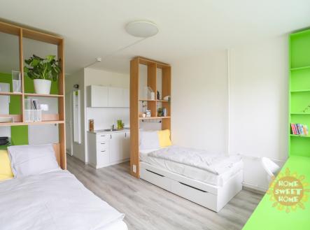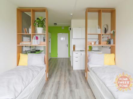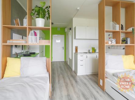 Nabízíme k pronájmu studentské sdílené bydlení pro dvě osoby ve studiu o rozloze 18 m² v rezidenčním třípodlažním domě s výtahem v ulici Kotlaska, Praha 8 - Palmovka. Tato lokalita vyniká skvělou dopravní dostupností. Rezidence poskytuje mnoho společných prostor k vyžití. Vhodné především pro studenty. Studio bylo navrženo s důrazem na maximální využití prostoru a funkčnost. Součástí studia je plně vybavená vlastní kuchyňská linka (lednice, varná deska, mikrovlnná trouba, digestoř), koupelna se sprchovým koutem a toaletou, dvě lůžka s matracemi 90x200cm, dostatek úložného prostoru, pracovní deska. Vybavení bytu je velmi kvalitní a přispívá k příjemnému bydlení. Vysokorychlostní internet je samozřejmostí a je již zahrnut v ceně poplatků. Rezidence poskytuje plné vyžití pro volnočasové aktivity, tak pro společné setkávání a budování komunity. V budově naleznete fitness centrum (vybavená posilovna a venkovní fitness zázemí), natáčecí a hudební místnost, herna s pingpongovým stolem a kulečníkem, venkovní grilování, prádelna (za příplatek) a společná prostorná kuchyně s jídelním koutem. Toto bydlení je ideální volbou pro studenty, kteří hledají kvalitní a dostupné ubytování v blízkosti škol a dalších důležitých bodů v Praze. Rezidence se nachází pouhých 5 min. od stanice metra linky B - Palmovka. V rezidenci nabízíme více pokojů, pro jednotlice či páry – skutečný vzhled pokoje se může lišit v závislosti na konkrétním designu. Konkrétní typ pokoje, jeho umístění a patro budou upřesněny na základě vaší poptávky, včetně termínu a délky pobytu.Minimální doba pronájmu jsou tři měšíce. Uvedená cena je včetně veškerých poplatků (elektřina, voda, topení, vysokorychlostní internet a využívání společných prostor). Cena za lůžko pro 1 osobu vč. poplatků EUR 550. Studio je vhodné maximálně pro dvě osoby. V případě zájmu o prohlídku či více informací nás neváhejte kontaktovat.