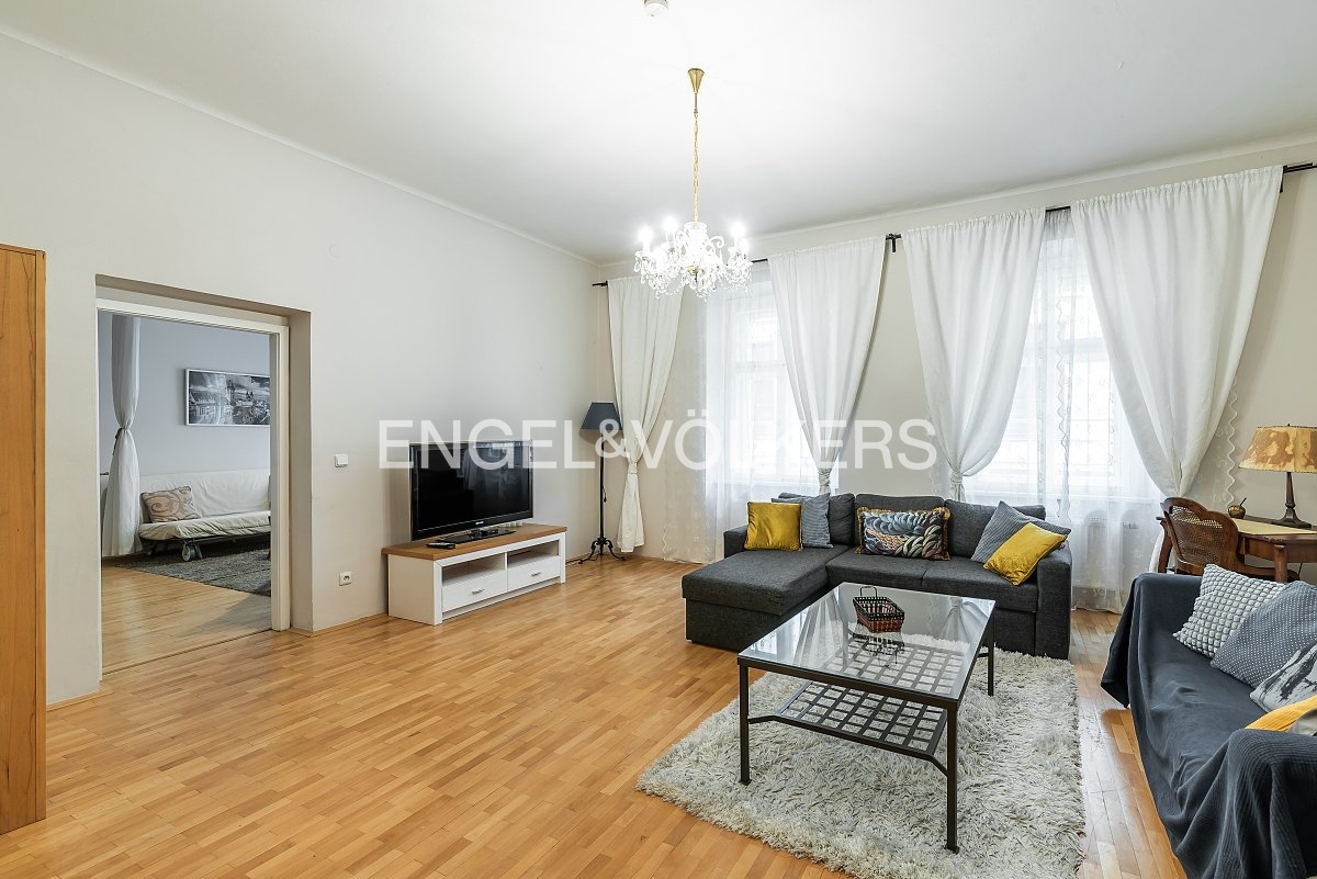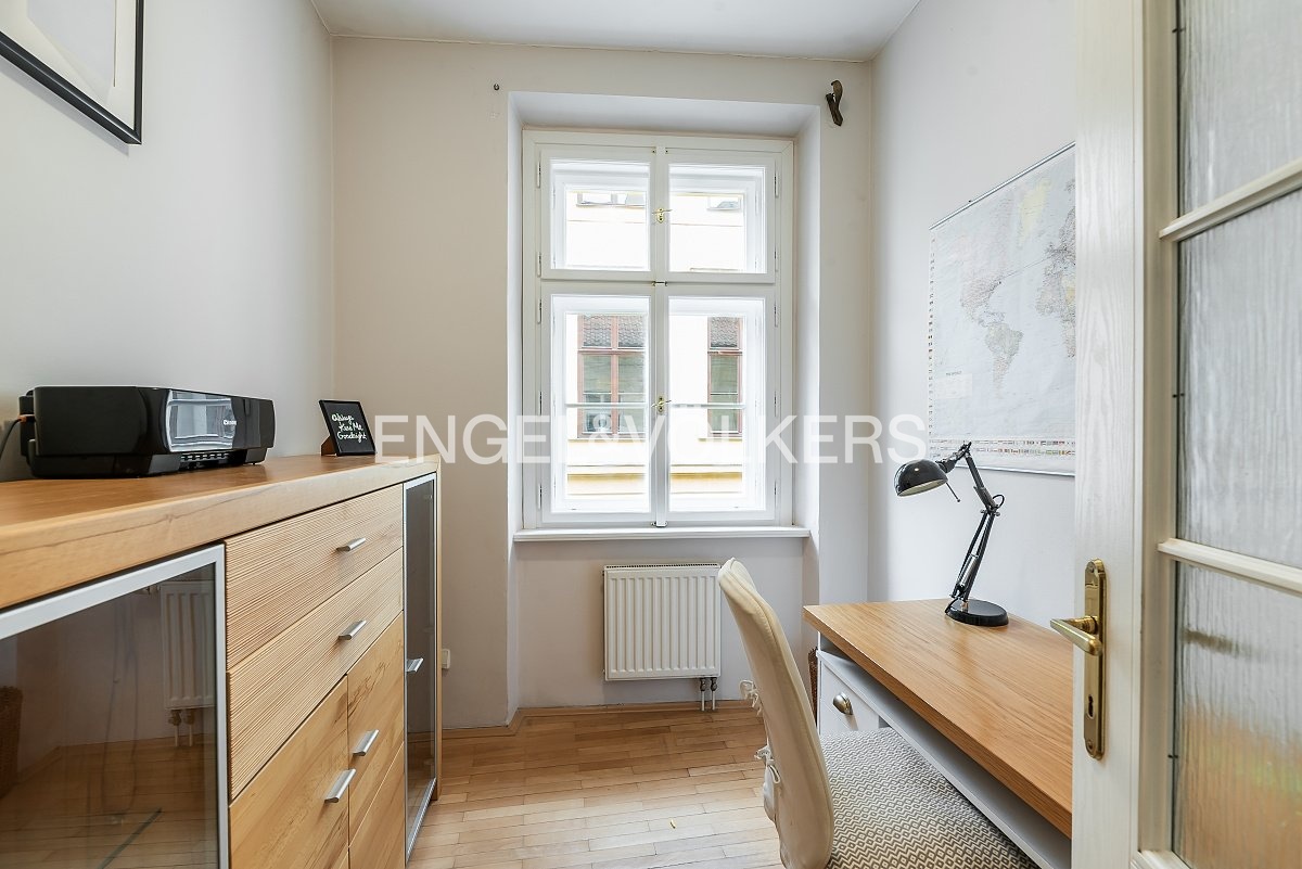 Kompletně zařízený byt ve třetím nadzemním podlaží historického domu v centru Prahy v blízkosti náměstí Republiky. Praktická dispozice bytu s obývacím pokojem, plně vybavenou kuchyní, prostornou hlavní ložnicí, pracovnou a koupelnou s vanou a toaletou. Součástí pronájmu je pračka, myčka a veškeré vybavení. Poplatky činí 6 000 Kč a zahrnují zálohy na energie i internet.