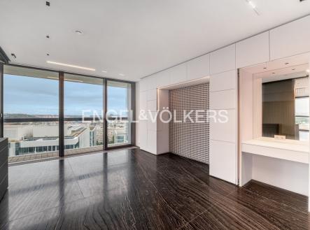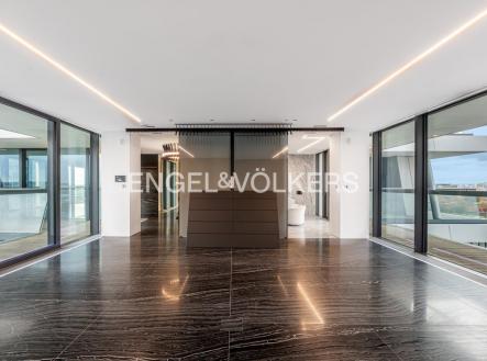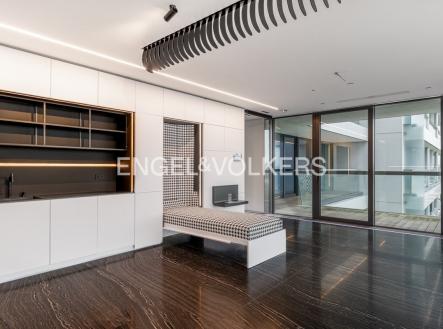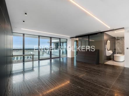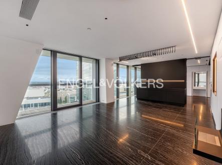 K pronájmu nabízíme mimořádně prostorný a prémiově zařízený byt 3+kk o velikosti 160 m², situovaný v 15. patře prostřední věže prestižní rezidence V Tower – nejvyšší a nejexkluzivnější rezidenční budovy v Praze. Byt se pyšní terasou obepínající celý byt, která nabízí dechberoucí panoramatické výhledy na Prahu a přístup z každé obytné místnosti. Dominantou bytu je prostorný obývací prostor s designovou kuchyní na míru, dále zde naleznete dvě ložnice, dvě velké koupelny s vanou, samostatnou toaletu s technickou místností a šatnu. Interiér je navržen s důrazem na detail a praktičnost, což dokládá vestavěný multifunkční nábytek a dostatek úložných prostor. Celý byt je proveden ve špičkových materiálech – podlahy i koupelny z přírodního mramoru a prémiové vybavení. Rezidence V Tower poskytuje svým rezidentům nejvyšší úroveň služeb – 24/7 recepci a ostrahu, wellness centrum se saunami a bazénem, fitness, soukromé kino, společenský salonek, prádelnu i další doplňkové služby zajišťující maximální komfort. Objekt je centrálně vytápěný a klimatizovaný. Součástí nájmu je parkovací stání v uzavíratelné garáži s možností pronájmu druhého místa po dohodě. Zájemce je srozuměn s provizí realitní kanceláře ve výši jednoho měsíčního nájmu + DPH.