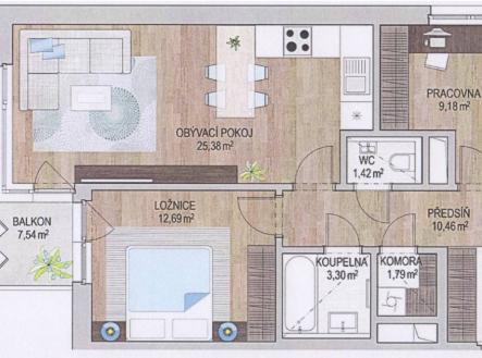 Nabízíme na prodej příjemný byt s terasou ve zdařilé novostavbě. Rezidence Green Motol, soubor 4 domů inspirovaný finskou architekturou. Projekt kolaudovaný v roce 2016 je zdařilý, moderní, svěží a elegantní. Minimální energietická náročnost, štítek B. Byt samotný je o dispozici 3+kk a velikosti 69,4m2 s balkonem (7,54m2) a nachází se ve 4. nadzemním podlaží. K bytu patří parkovací stání v garáži a sklepní kóje. Je zde světlý obývací pokoj s kuchyňský koutem, ložnice – z obou těchto místností vstup na balkón. Dále je v bytě druhá ložnice/pracovna, koupelna s vanou, samostatně toaleta a komora. Ve vstupní chodbě vestavná šatní skříň. Velkoformátová dřevěná okna, předokenní žaluzie, ventilační systém. Unikátně řešené zahrady ve vnitrobloku podtrhují výjimečnost celého projektu, moderní bydlení v souladu s přírodou nedaleko centra města. Dvě zastávky MHD na metro A Nemocnice Motol nebo 10 min tram na metro B Anděl. Náklady spojené s poplatky za dům (včetně fondu oprav) jsou cca ve výši 4.400,-Kč při minimálním užívání ze strany majitele. Byt je ve 100% kvalitě. We offer for sale a charming apartment with a terrace, the Green Motol residence - a set of 4 houses inspired by Finnish architecture. The project approved in 2016 is successful, modern, fresh and elegant. Minimum energy efficiency, label B. The apartment itself is a 3+kk layout and 69.4 m2 in size with a balcony (7.54 m2) and is located on the 4th floor. The apartment includes a parking space in the garage and a cellar. Bright living room with a kitchenette, a bedroom - both of these rooms have access to the balcony. The apartment also has a second bedroom/study, a bathroom with a bathtub, a separate toilet and a storage room. Large-format wooden windows, window blinds, a ventilation system. Uniquely designed gardens in the courtyard underline the uniqueness of the entire project, modern living in harmony with nature near the city center. The costs associated with house fees (including repair fund) are approximately CZK 4,400 with minimal use by the owner.