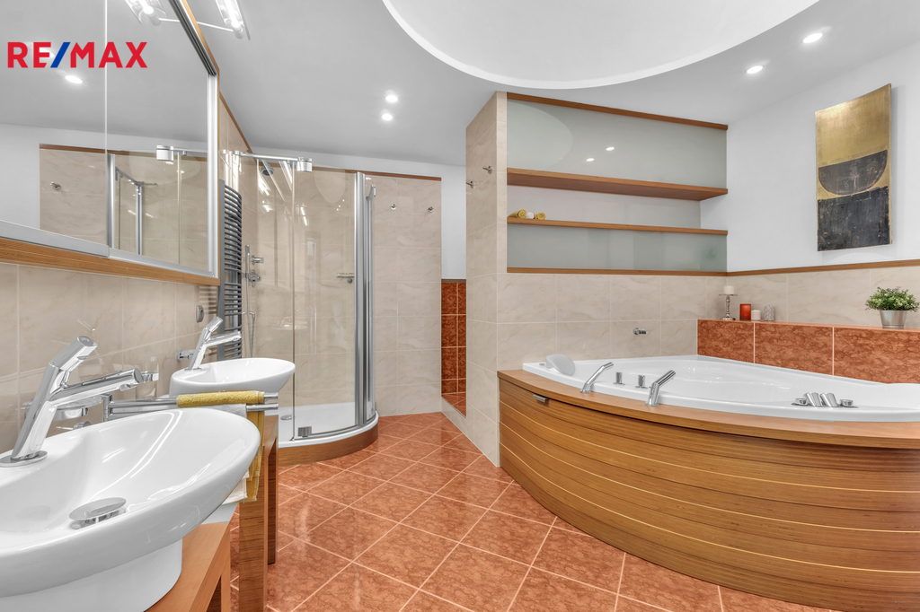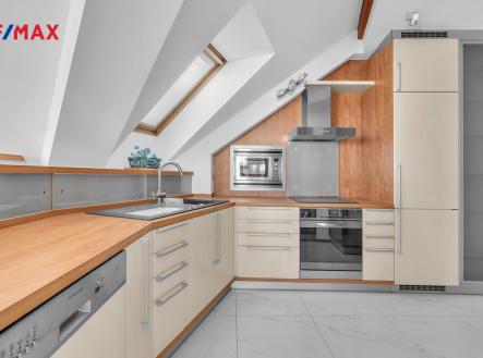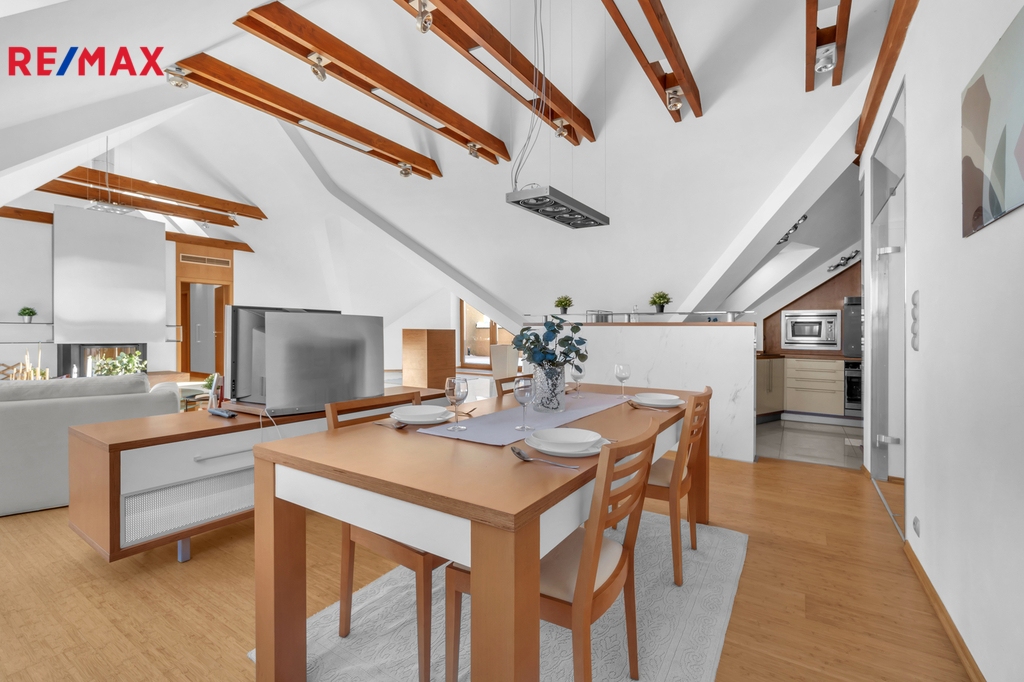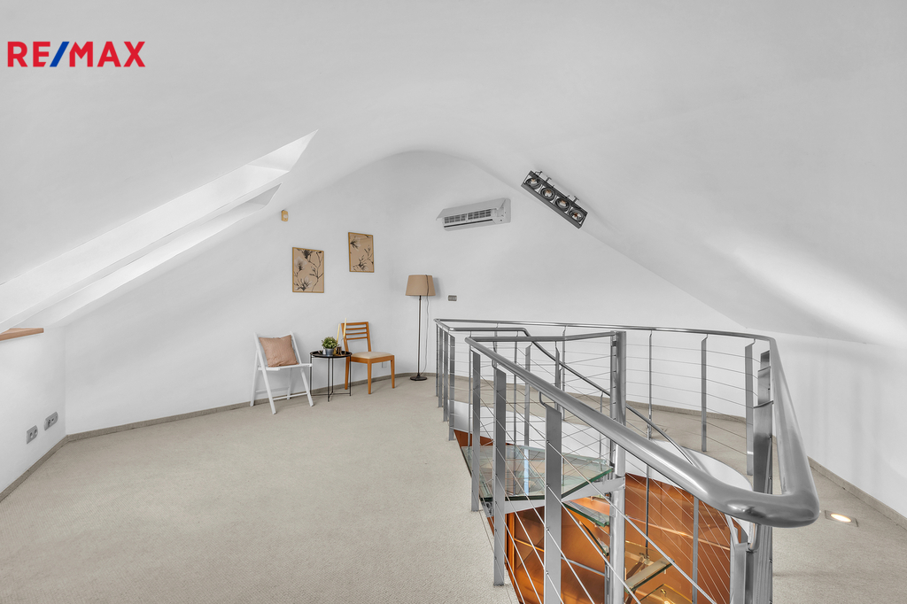 Nabízíme k prodeji nadstandartní, zcela atypický podkrovní byt o obytné podlahové ploše 219 m2 a celkové podlahové ploše 278 m2. Bytová jednotka 5kk je umístěna v šestém podlaží (podkroví) na adrese Praha 10, Za Kovárnou, Dolní Měcholupy, a je částečně vybavena. Dolní Měcholupy mají veškerou občanskou vybavenost: lékař, školka, škola, nákupní centrum. Autobusová zastávka je téměř u domu. Volnou chůzí +- 2 minuty se spojením na metro Skalka trasa A. Součástí bytu jsou dvě terasy 4 a 14,7 m2. Dále k bytu náleží kryté garážové stání pro jedno osobní vozidlo. Výtah je k dispozici od parkovacích stání přímo ke vchodovým dveřím bytu. Účelová dispozice bytu je zádveří s točitým schodištěm, předsíň, obývací pokoj s krbem, vybavený kuchyňský kout, tři pokoje, koupelna s rohovou vanou a sprchovým koutem, WC a bidetem, další koupelna s masážní vanou, sprchovým koutem, WC a bidetem, technická místnost (prádelna) s vanou a centrálním vysavačem. Další součástí bytu je galerie s pracovnou v mezonetové části, půdní prostor v mezonetové části a komora. Příjemné prostředí a komfort bydlení zajišťuje klimatizační jednotka. Galerie Golf Hostivař 2,7 Km. Vzhledem k jedinečnosti a exkluzivitě bytu nás v případě zájmu neváhejte kontaktovat. Doporučujeme prohlídku. Fotografie bytu nejsou vizualizace. Byt je v tomto stavu připraven pro zájemce. Půdorys bytu je pouze orientační nákres, nejedná se o technickou dokumentací.