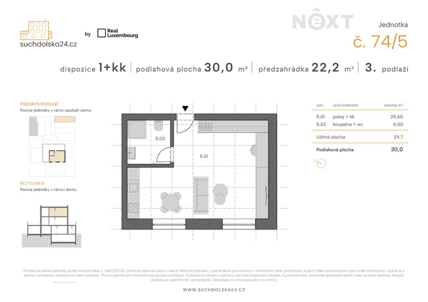 Projekt Suchdolská vzniká v klidné a přirozeně zelené části Prahy 6, v oblíbeném Suchdole. Nabízí pouze šest jednotek, díky čemuž si zachovává komorní charakter, soukromí a příjemnou sousedskou atmosféru. Je ideální volbou pro ty, kteří chtějí žít v klidu, ale zároveň v dosahu městského života. Nabízíme k prodeji moderní a nově zrekonstruovanou světlou jednotku o celkové ploše 30 m² s dispozicí 1+kk ve 3. nadzemním podlaží. Jednotka se skládá z pokoje s přípravou pro kuchyňskou linku o ploše 25,65 m² a kompletně zařízenou koupelnou s toaletou a podlahovým vytápěním o ploše 4,00 m². Součástí nabídky je také zahrádka o velikosti 22,2 m². Nabízená nemovitost je ideální pro jednotlivce, mladé páry , studenty nebo jako zajímavá příležitost pro investory. Nelze též opomenout blízkost a skvělou dostupnost na letiště Václava Havla. Jednotka je ihned k nastěhování! Suchdol je vyhledávaná lokalita díky klidu a relaxaci, zeleni a výborné dostupnosti do centra města. Nachází se zde kompletní občanská vybavenost a služby, včetně mateřských škol, základních škol a prestižní Vysoké školy Zemědělské v Praze. V okolí najdete krásné parky, plavecký bazén a moderní sportoviště, které poskytují prostor pro volnočasové aktivity. Součástí naší nabídky je kompletní servis, tedy právní služby a zajištění všech potřebných dokumentů, pomoc se zajištěním financování, pojištění nemovitosti i domácnosti, přepisy energií. Pouze u nás vám zajistíme moderní financování až na 30 let, bez ohledu na věk a prokazování příjmů, či nutnosti předkládat daňové přiznání (u podnikatelů). Zeptejte se nás a bydlete chytře! Bližší informace Vám rád sdělím na osobní prohlídce tohoto bytu. Pro komunikaci uvádějte evidenční číslo zakázky N114727.