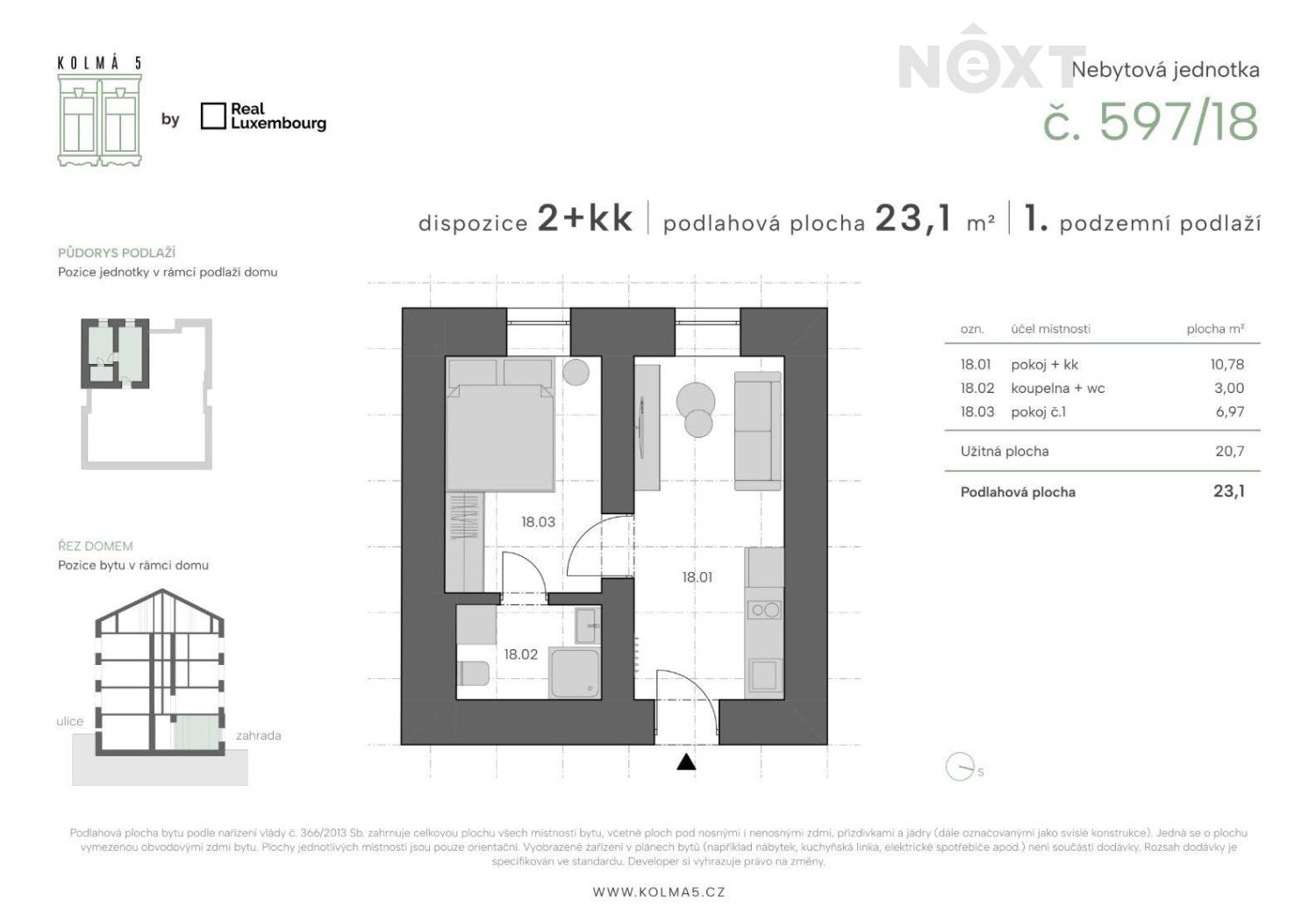 Náš projekt KOLMÁ 5 v pražských Vysočanech má vše, co si od startovacího, nebo investičního bydlení můžete přát. Perfektní lokalita: všechnu důležitou infrastrukturu máte v docházkové vzdálenosti, stejně tak parky a přírodu. MHD: tramvajová a autobusová zastávka (Podkovářská) - 3 minuty a v úplném centru jste do půl hodinky, metro (Kolbenova) - 15 minut, vlak (nádraží Libeň) - 13 minut Nákupní možnosti: Billa přímo naproti projektu přes ulici Poděbradská, v blízkosti ještě Albert Zábava a sportovní vyžití: O2 aréna - 20 minut, Rugby club Praha, fitness louka Rokytka - 10 minut, Factory Form fitness Harfa - 25 minut Příroda a místo pro odpočinek: Park Zahrádky 15 minut, Park Smetanka a meandry Rokytky 20 minut Gastronomie: v bezprostředním okolí je nespočet restaurací, bister, fast foodů či kaváren, takže v tomto ohledu Vám zde také nebude nic chybět Činžovní dům prošel kompletní rekonstrukcí. Nabídne 20 jednotek ve vysokém standardu. Rekonstrukce zahrnovala centrální rozvody médií, fasádu, společné prostory. V jednotkách pak nové rozvody, podlahy, koupelny, sanita a mnoho dalšího. Zbývá už jen vybavení a můžete kvalitně a pohodlně bydlet, nebo bezproblémově pronajímat. Tato konkrétní jednotka č.18 o dispozici 2kk a podlahové ploše 23,1 m2 se nachází v 1 podzemním podlaží s výhledem do ulice. Přesné rozložení si můžete prohlédnout na přiloženém půdorysu. Pokud Vás již nyní něco zajímá, nebo máte určité dotazy, tak se mi ozvěte. Rád se Vám budu věnovat. Nabízíme Vám kompletní servis včetně právních služeb, zajištění potřebných dokumentů, pomoc s financováním, pojištěním nemovitosti, pojištěním nájmu a domácnosti, či přepisem energií. Pro komunikaci uvádějte evidenční číslo zakázky N117039.