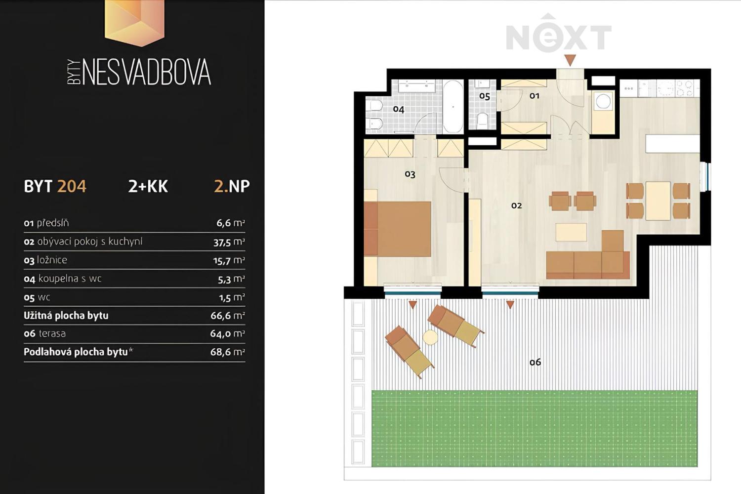 Exkluzivní prodej nadstandardního bytu 2kk s užitnou plochou 67m2 terasa 64m2, sklep, vnitřní parkovací stání, Praha - Modřany, ulice Nesvadbova. Bytová jednotka disponuje prostorným obývacím pokojem s kuchyňským a jídelním koutem (37,5 m²), ložnicí (15,7 m²), koupelnou s toaletou (5,3 m²), samostatnou toaletou (1,5m2), chodbou a prostornou terasou (64 m²). K bytu náleží vnitřní parkovací stání a sklepní kóje umístěná v suterénu domu. Byt je orientován na východní a jížní stranu. Velkým benefitem bytu je prostorná terasa o celkové výměře 64 m², díky umístění svítí na terasu sluníčko v průběhu celého dne. Nadstandarní vybavení bytu - kvalitní kuchyňská linka od společnosti Barkotex - Cesar, spotřebiče Siemens, v ložnici a na chodbě jsou prakticky řešené vestavěné skříně s vnitřním osvětlením. V bytě jsou také kvalitní dřevěné podlahy z masivu Admonter (obývací pokoj s kuchyňským koutem a ložnice) a velkoformátová dlažba (koupelna, toaleta a chodba). V podhledech je nainstalované led podsvícení. Na oknech jsou předokenní žaluzie. Při stavbě a dokončování bytu, byl kladen velký důraz na každý detail. Vybavení po dohodě - byt může zůstat kompletně vybavený. V okolí je kompletní občanská vybavenost: 350m od domu je tramvajová zastávka Čechova čtvrť (22minut k Národnímu divadlu), 400m je Poliklinika Modřany a OC Modřany, kde najdete množství obchodů a dalších služeb. V pěsí dostupnosti jsou i základní škola a mateřská školka. 700m od domu je Vlatavská cyklostezka, po které se pohodlně dostanete do centra Prahy nebo na Zbrastav, na stezce naleznete mnoho volnočasových aktivit a místa vhodná pro sport a relaxaci. V případě zájmu lze nemovitost financovat hypotečním úvěrem přes naše hypoteční centrum. Pouze u nás vám zajistíme moderní financování až na 35 let, bez ohledu na věk, prokazování příjmů či nutnosti předkládat daňové přiznání (u podnikatelů). Zeptejte se nás a bydlete chytře! Nenechte si ujít tuto jedinečnou příležitost a kontaktujte nás pro další informace a domluvení termínu prohlídky. Rád vás osobně přesvědčím o výjimečnosti této skvělé nemovitosti. Pro komunikaci uvádějte evidenční číslo zakázky N110415.