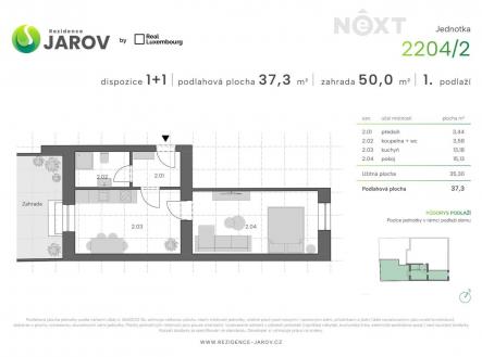 V exkluzivním zastoupení majitele vám nabízíme ke koupi krásně zrekonstruovaný malometrážní byt o dispozici 2+kk v projektu „Rezidence Jarov“ na Praze 3, v kvalitě novostavby. Byt má podlahovou plochu 37,3 m2 a zahrádku (50 m2) s terasou ve vnitrobloku domu, která je obrovským bonusem této nemovitosti. Skládá se z pokoje (15,13 m2), pokoje s kuchyní (13,18 m2), předsíně (3,44 m2) a koupelny (3,58 m2) se sprchovým koutem a WC. Byt je umístěn ve 1. nadzemním podlaží kompletně renovovaného 3 podlažního domu v ulici Na Mokřině, v klidné rezidenční části pražského Jarova. V pokoji a v kuchyni je položena vinylová podlaha, která má velice příjemné tepelně a zvukově izolační vlastnosti. V předsíni a koupelně je na podlaze položena vkusná dlažba. Ohřev teplé vody pro koupelnu, kuchyni a topení zajištěno úsporným elektrokotlem se zásobníkem teplé vody. Okna jsou úplně nová plastová s izolačním trojsklem. Myslím si, že pražský Jarov není třeba nijak zvlášť představovat. Je to klidné a příjemné místo k bydlení, s plnou občanskou vybaveností pro všechny věkové kategorie obyvatel. Pokud Vás nabídka oslovila, neváhejte mě kontaktovat pro bližší informace a osobní prohlídku nemovitosti. V případě potřeby Vám rád pomohu s vyřešením financování jejího pořízení i s dalšími následnými záležitostmi. Pouze u nás vám zajistíme moderní financování až na 30 let, bez ohledu na věk a prokazování příjmů, či nutnosti předkládat daňové přiznání (u podnikatelů). Zeptejte se nás a bydlete chytře! Pro komunikaci uvádějte evidenční číslo zakázky N113968.