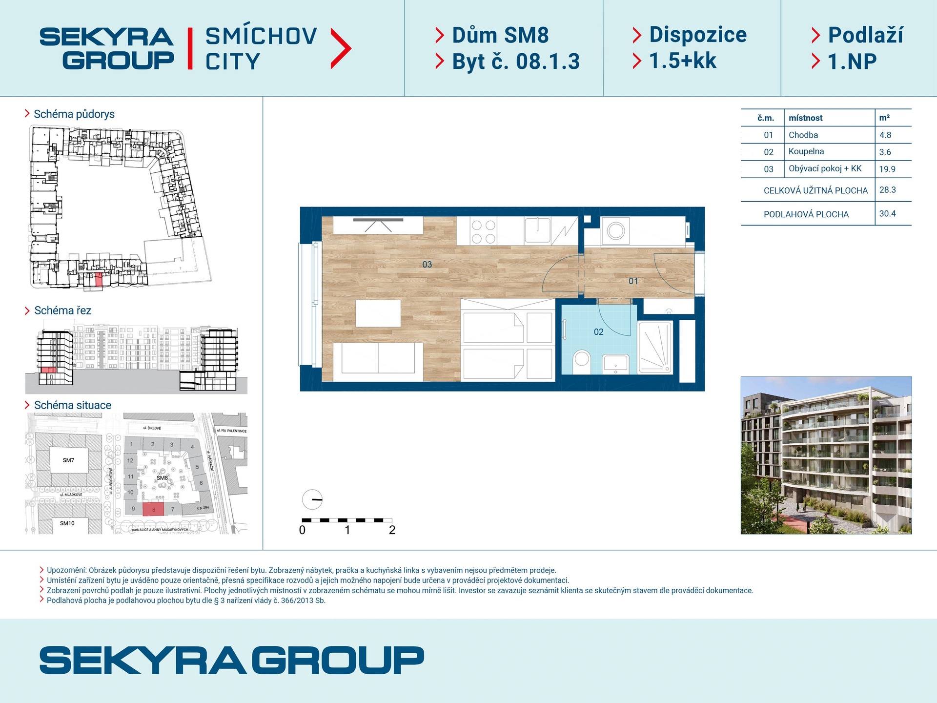 Dovolujeme si Vám nabídnout k prodeji byt 1,5+kk o výměře 30,4 m² v rezidenčním projektu Smíchov City, blok SM8. V ceně bytu je podlahové topení, předokenní žaluzie a příprava na dochlazování. SM8 navazuje na již realizované rezidenční bloky SM1/2 a SM3 a zahrnuje celkem 12 bytových domů. Je součástí projektu Smíchov City, jehož záměrem je nabídnout obyvatelům moderní bydlení s vysokým standardem provedení, vybavené špičkovými technologiemi. Nespornou výhodou je navíc umístění v centru města. Exkluzivní byty doplní v přízemí objektů funkční městský parter s obchody a službami. V ulicích budou vysázeny stromy, které zpříjemní klima a v horkých dnech poskytnou chladivý stín. Blok sousedí s třídou Madeleine Albrightové pojatou jako pěší podélný park a budoucím parkem Alice a Anny Masarykových. Byty v bloku SM8 jsou navrženy tak, aby si podle svých preferencí a možností mohl vybrat opravdu každý. Dispozičně tu naleznete vše – od malých bytů 1+kk až po velké byty kategorie 5+kk s nádhernými výhledy na Prahu. Samozřejmostí je dostatek parkovacích míst, technické zázemí a sklepní kóje v suterénu objektu. V posledním podlaží jsou pak ty nejexkluzivnější byty, z nichž některé nabízí jedinečný pohled na Vyšehrad. Všechny byty jsou navrženy ve vysokém standardu, což se týká povrchových materiálů i zařízení, jako je podlahové topení či vzduchotechnika s rekuperací vzduchu. Standard bytů lze samozřejmě přizpůsobit potřebám budoucích majitelů. Stačí se obrátit na naše prodejce.