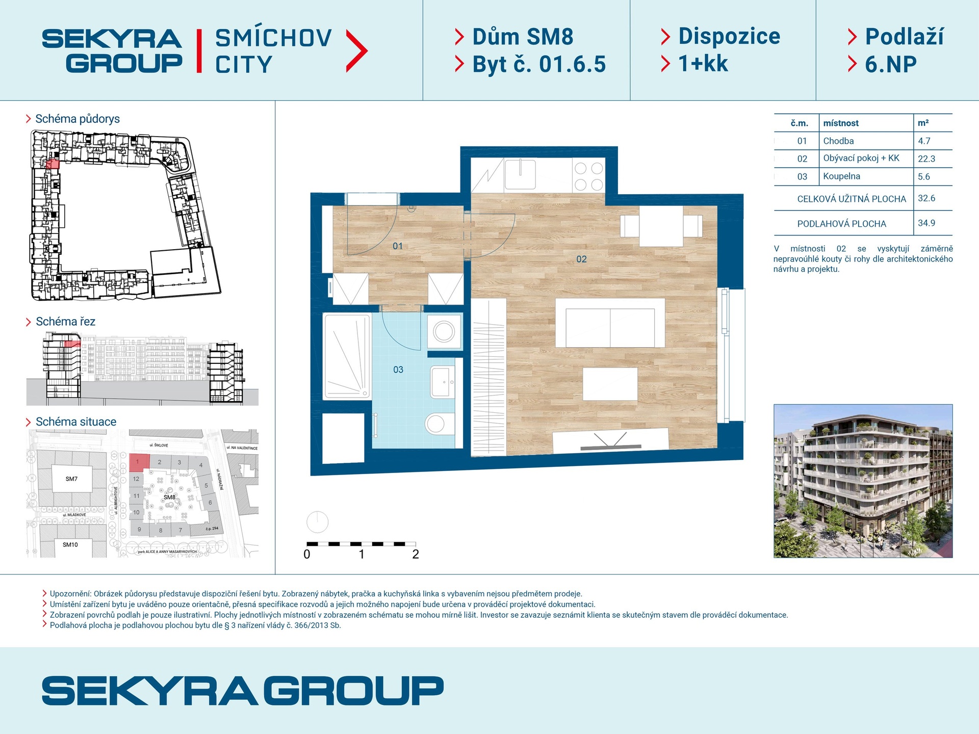 Dovolujeme si Vám nabídnout k prodeji byt 1+kk o výměře 34,9 m² v rezidenčním projektu Smíchov City, blok SM8. V ceně bytu je podlahové topení, předokenní žaluzie a příprava na klimatizaci. SM8 navazuje na již realizované rezidenční bloky SM1/2 a SM3 a zahrnuje celkem 12 bytových domů. Je součástí projektu Smíchov City, jehož záměrem je nabídnout obyvatelům moderní bydlení s vysokým standardem provedení, vybavené špičkovými technologiemi. Nespornou výhodou je navíc umístění v centru města. Exkluzivní byty doplní v přízemí objektů funkční městský parter s obchody a službami. V ulicích budou vysázeny stromy, které zpříjemní klima a v horkých dnech poskytnou chladivý stín. Blok sousedí s třídou Madeleine Albrightové pojatou jako pěší podélný park a budoucím parkem Alice a Anny Masarykových. Byty v bloku SM8 jsou navrženy tak, aby si podle svých preferencí a možností mohl vybrat opravdu každý. Dispozičně tu naleznete vše – od malých bytů 1+kk až po velké byty kategorie 5+kk s nádhernými výhledy na Prahu. Samozřejmostí je dostatek parkovacích míst, technické zázemí a sklepní kóje v suterénu objektu. V posledním podlaží jsou pak ty nejexkluzivnější byty, z nichž některé nabízí jedinečný pohled na Vyšehrad. Všechny byty jsou navrženy ve vysokém standardu, což se týká povrchových materiálů i zařízení, jako je podlahové topení či vzduchotechnika s rekuperací vzduchu. Standard bytů lze samozřejmě přizpůsobit potřebám budoucích majitelů. Stačí se obrátit na naše prodejce.