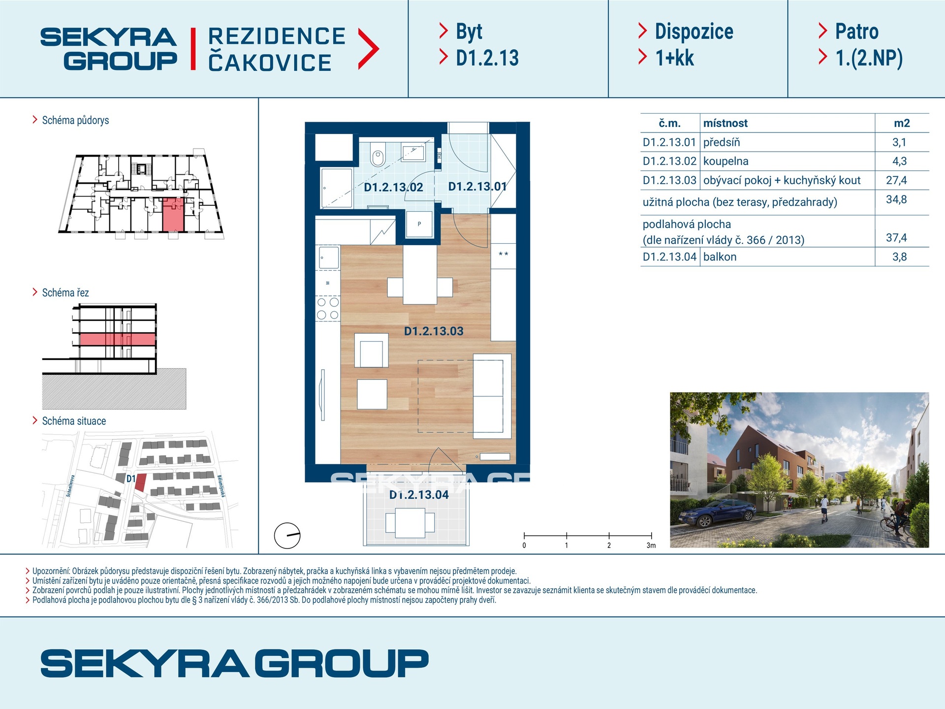 Dovolujeme si Vám nabídnout k prodeji byt 1+kk o výměře 37,4 m² s lodžií 3,8 m² v rezidenčním projektu Rezidence Čakovice, etapa B. Klidné bydlení 5 obytných domů projektu Rezidence Čakovice poskytuje moderní byty s kvalitně nastavenými standardy bydlení o dispozicích od 1+kk až po 4+kk, součástí Rezidence Čakovice bude multifunkční dům se školkou, ordinacemi a ubytovacími jednotkami. Aby přirozeně zapadly do okolní zástavby, samotné domy jsou koncipovány jako tří až pětipodlažní. Řada bytů bude disponovat vlastní zahrádkou či balkonem. Samozřejmostí jsou parkovací místa a garáže. S původní zástavbou novou rezidenci propojí příjemné uličky lemované alejemi, které plynule navážou na stávající ulice. K oddychu a rekreaci obyvatel bude sloužit i přilehlý „zelený“ prostor s trávou a stromy, jenž bude realizován v rámci výstavby projektu. Čakovice mají dlouhou a barvitou historii. Suverénní městečko se stalo součástí Prahy v roce 1968, zachovalo si však svůj genius loci. Místní kulturní památkou je novorománský kostel sv. Remigia postavený podle plánů Karla Scheinera a zámek Čakovice, který se nachází v blízkosti čakovického cukrovaru, a mezi nimi se rozprostírá anglický park. V těsném sousedství budoucí Rezidence Čakovice je i potok, rybník nebo zámecký park, což jen podtrhuje komorní a příjemnou atmosféru bydlení.