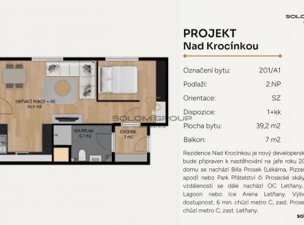Prodej nového rohového bytu 1+kk, 46,2 m² (byt o výměře 39,2 m² + balkon o výměře 7 m²), který se nachází ve 2. NP cihlové novostavby v Rezidenci Nad Krocínkou III, Praha 9 – Prosek. Jedná o družstevní byt, nepotřebujete hypoteční úvěr a cenu bytu splácíte formou splátek v měsíčních poplatcích („měsíční splátka anuity“) Splácet začínáte až po kolaudaci domu, do té doby nic neplatíte. Byt Vám je předán hotový vč. zařízené koupelny (umyvadlo, vana nebo sprchový kout, topný žebřík a závěsné WC) dále interiérové dveře, plastová okna, nové rozvody vody, elektřiny a odpadů, příprava pro kuchyňskou linku, protipožární vchodové dveře, obklady a dlažba. Je možno také využít dotaci na výběr podlahové krytiny ve výši 500 Kč/m2. Akontace za byt: 2.490.000,- Kč Anuita k bytu: 4.629.365,- Kč Splátka anuity: 25.458,- Kč Možnost vložení mimořádné splátky či doplacení celé výše anuity a byt převézt do osobního vlastnictví. Výborná dopravní dostupnost, 6 min. chůzí metro C, zast. Prosek nebo 15 min. chůzí metro C, zast. Letňany. V blízkosti domu se nachází Billa Prosek (Lékárna, Pizzerie, Mcdonald´s apod.) nebo Park Přátelství či Prosecké skály. V dojezdové vzdálenosti se nachází OC Letňany, Aquacentrum Lagoon nebo Ice Arena Letňany. Lokalita je vhodná jak k vlastnímu bydlení, tak za účelem pronajímání. K bytu přísluší balkon o výměře 7 m². Termín dokončení - konec roku 2026 Vizualizace jsou pouze ilustrativní.