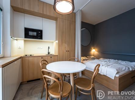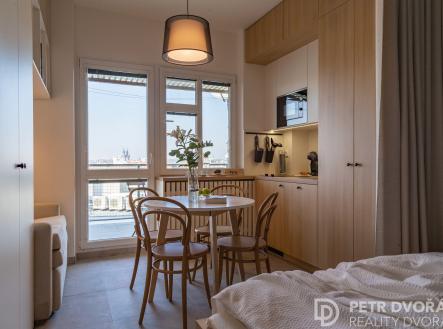 Nabídka moderního, nově zrekonstruovaného bytu 1+kk s klimatizací a terasou orientovanou do klidného vnitrobloku. Jednotka o ploše 27 m² se nachází ve funkcionalistickém činžovním domě v Opletalově ulici, který v letech 1936–1939 navrhl architekt Ferdinand Fencl. Budova disponuje dvěma výtahy a reprezentativními společnými prostory. Interiér tvoří vstupní předsíň, koupelna s walk-in sprchovým koutem a toaletou a obytný prostor s kuchyní, jídelním koutem a odpočinkovou zónou s manželskou postelí oddělenou závěsem. Z pokoje je přímý vstup na prostornou terasu s výhledem na střechy Prahy. Byt prošel kompletní rekonstrukcí, která klade důraz na funkčnost a estetiku. Podlahy jsou pokryty velkoformátovou dlažbou, okna jsou dřevěná s dvojskly. Kuchyňská linka je vybavena vestavnými spotřebiči, nechybí dostatek úložných prostor včetně niky s pračkou a sušičkou. Komfort zajišťuje klimatizace a ústřední vytápění z domovního plynového kotle. Dům stojí v jednosměrné ulici v těsné blízkosti Václavského náměstí a stanice metra Muzeum. Lokalita nabízí kompletní občanskou vybavenost, množství kaváren, restaurací, obchodů i kulturních institucí. Staroměstské náměstí a Pařížská ulice jsou v docházkové vzdálenosti.