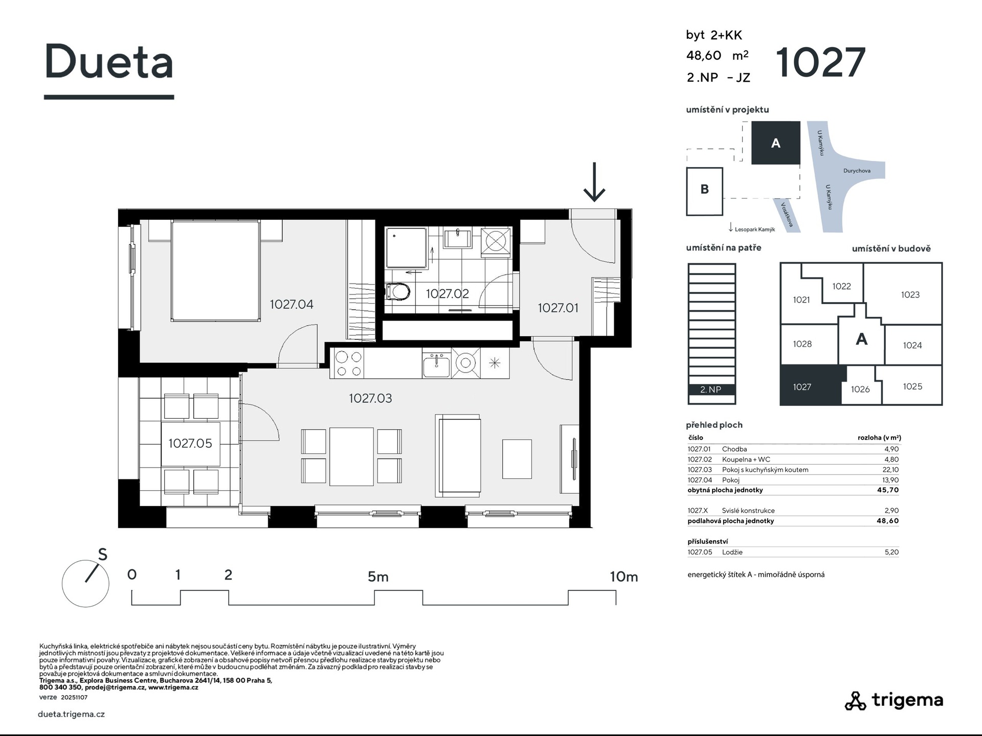 Byt č. 1027: Vzdušné 2+kk s jihozápadní orientací Výstavba zahájena – 40 % bytů prodáno během 6 měsíců! Neváhejte s výběrem – právě teď máte možnost zvolit si ideální dispozici i orientaci bytu v atraktivním projektu Dueta Kamýk, který spojuje moderní bydlení s přírodou. Byt č. 1027 o dispozici 2+kk a podlahové ploše 48,6 m² je situován ve 2. nadzemním podlaží s orientací na jihozápad, což zajišťuje dostatek přirozeného světla, a zvláště příjemnou podvečerní atmosféru. Dispozice bytu zahrnuje prostorný obývací pokoj s kuchyňským koutem (22,10 m²), ložnici, koupelnu s WC a chodbu. Obytná plocha činí 45,70 m², doplněná o konstrukční prvky. Předností jednotky je lodžie o velikosti 5,2 m2. • Jihozápadní orientace pro maximální světlo • Lodžie pro příjemný relax při západu slunce • Kompaktní dispozice s efektivním využitím prostoru • Energetická třída A – mimořádně úsporná Vhodné pro: Páry nebo jednotlivce, kteří hledají moderní byt s příjemnou atmosférou a efektivním řešením. Projekt Dueta Kamýk přináší jedinečnou kombinaci klidného bydlení uprostřed přírody a skvělé dostupnosti do centra Prahy díky plánované trase metra D. Lokalita nabízí nejen blízkost lesoparku a rozsáhlé zeleně, ale i atraktivní výhledy, které ocení každý milovník přírody. Byty jsou vybaveny nadstandardními technologiemi – rekuperací, podlahovým vytápěním, předokenními žaluziemi a kvalitními materiály, které zaručují pohodlí i úsporný provoz. Dueta Kamýk je ideálním řešením jak pro vlastní bydlení, tak jako chytrá investice v rychle se rozvíjející lokalitě.