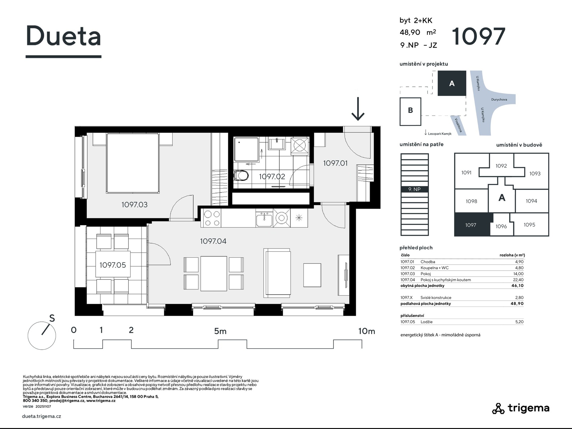 Byt č. 1097: Byt 2+kk s jihozápadní orientací Výstavba zahájena – 40 % bytů prodáno během 6 měsíců! Neváhejte s výběrem – právě teď máte možnost zvolit si ideální dispozici i orientaci bytu v atraktivním projektu Dueta Kamýk, který spojuje moderní bydlení s přírodou Byt č. 1097 o dispozici 2+kk a podlahové ploše 48,9 m² je situován ve 9. nadzemním podlaží s orientací na jihozápad, což zajišťuje dostatek přirozeného světla, a zvláště příjemnou podvečerní atmosféru. Dispozice bytu zahrnuje prostorný obývací pokoj s kuchyňským koutem (22,40 m²), ložnici, koupelnu s WC a chodbu. Obytná plocha činí 46,10 m², doplněná o konstrukční prvky. Předností jednotky je lodžie o velikosti 5,2 m2. - Oblíbená jihozápadní orientace - Lodžie s výhledem na západ slunce - Kompaktní dispozice s efektivním využitím prostoru - Energetická třída A – mimořádně úsporná Vhodné pro: Páry nebo jednotlivce, kteří hledají moderní byt s příjemnou atmosférou a efektivním řešením. Projekt Dueta Kamýk přináší jedinečnou kombinaci klidného bydlení uprostřed přírody a skvělé dostupnosti do centra Prahy díky plánované trase metra D. Lokalita nabízí nejen blízkost lesoparku a rozsáhlé zeleně, ale i atraktivní výhledy, které ocení každý milovník přírody. Byty jsou vybaveny nadstandardními technologiemi – rekuperací, podlahovým vytápěním, předokenními žaluziemi a kvalitními materiály, které zaručují pohodlí i úsporný provoz. Dueta Kamýk je ideálním řešením jak pro vlastní bydlení, tak jako chytrá investice v rychle se rozvíjející lokalitě.