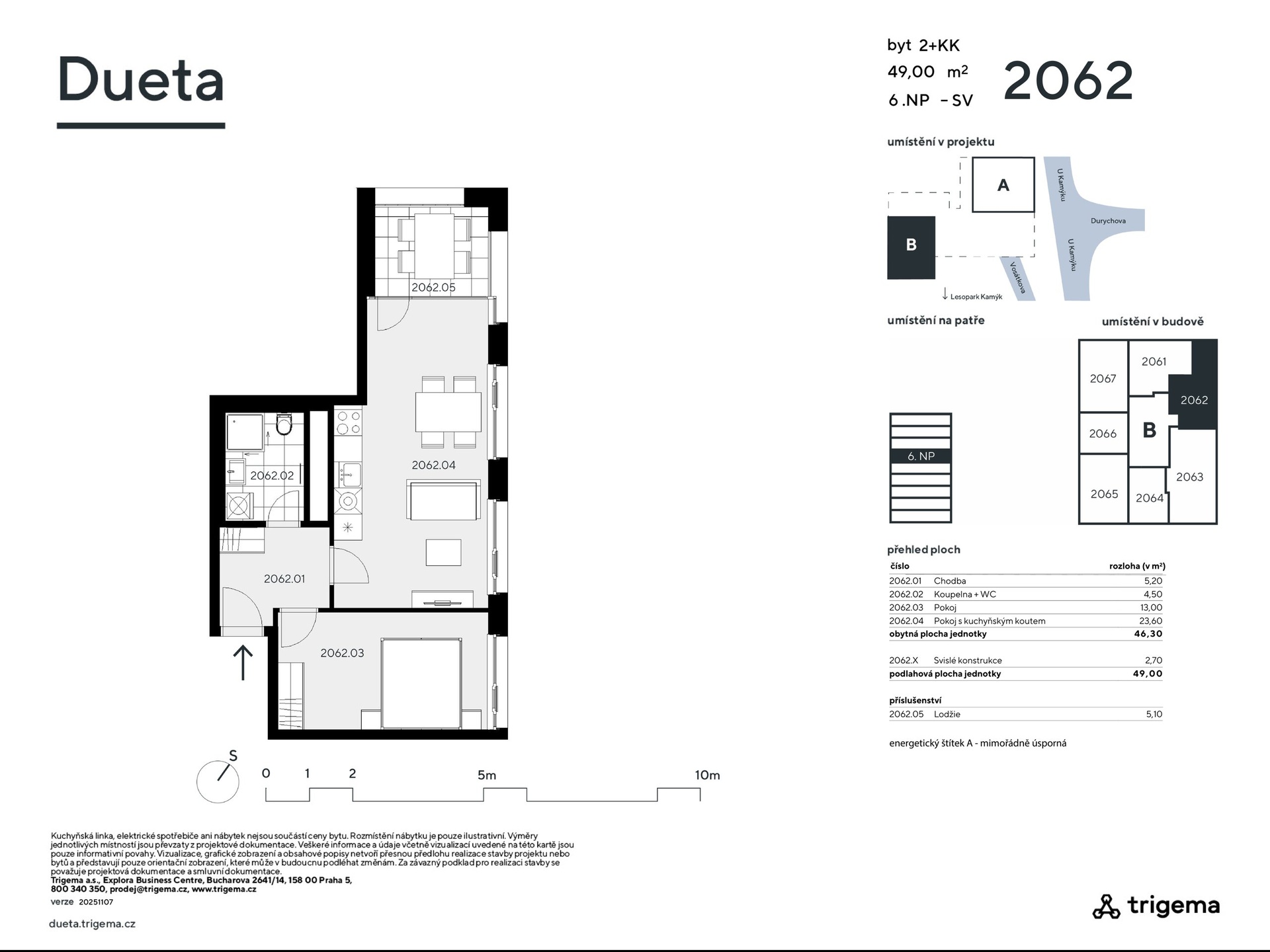 Byt č. 2062: Moderní byt 2+kk s lodžií a orientací na severovýchod Výstavba zahájena – 40 % bytů prodáno během 6 měsíců! Neváhejte s výběrem – právě teď máte možnost zvolit si ideální dispozici i orientaci bytu v atraktivním projektu Dueta Kamýk, který spojuje moderní bydlení s přírodou Bytová jednotka číslo 2062 nabízí praktické dispoziční řešení 2+kk, dostatek denního světla a prostorné místnosti celkovou podlahovou plochou 49 m2. Byt se nachází v 6. nadzemním podlaží projektu Dueta Kamýk a má severovýchodní orientaci, která zajistí dostatek přirozeného světla. Dispozici tvoří obývací pokoj s kuchyňským koutem (23,60 m2), ložnice, chodba a koupelna s WC. Příjemným bonusem je prostorná lodžie o 5,10 m2. - Novostavba s moderními technologiemi a nízkou energetickou náročností - Kvalitní standardy provedení - Praktická dispozice 2+kk s efektivním využitím prostoru Vhodné pro: Páry, singles nebo investory hledající moderní a praktické bydlení. Projekt Dueta Kamýk přináší jedinečnou kombinaci klidného bydlení uprostřed přírody a skvělé dostupnosti do centra Prahy díky plánované trase metra D. Lokalita nabízí nejen blízkost lesoparku a rozsáhlé zeleně, ale i atraktivní výhledy, které ocení každý milovník přírody. Byty jsou vybaveny nadstandardními technologiemi – rekuperací, podlahovým vytápěním, předokenními žaluziemi a kvalitními materiály, které zaručují pohodlí i úsporný provoz. Dueta Kamýk je ideálním řešením jak pro vlastní bydlení, tak jako chytrá investice v rychle se rozvíjející lokalitě.