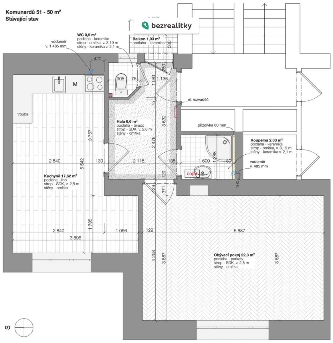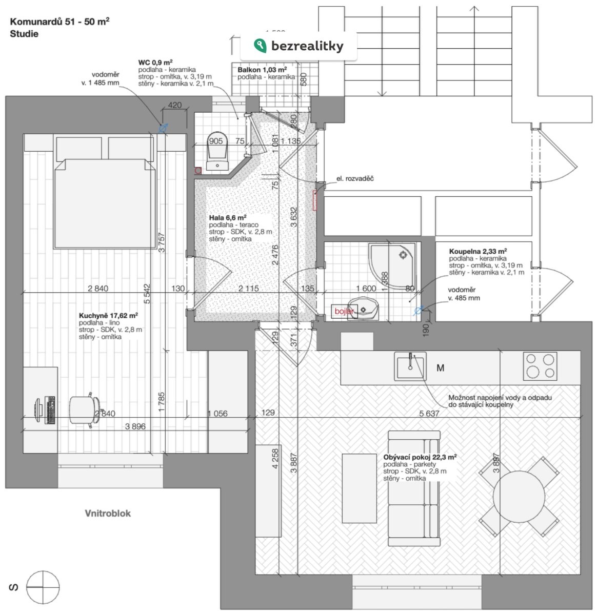 Vlastnictví - Osobní Dispozice - 2+kk Plocha bytu - 49,8 m2 Podlaží - 4. Sklep - Ano, viz foto Vytápění - Nové el. akumulační radiátory, wifi ovládání Teplá voda - El. bojler Okna - Plastová, izol. Dvojsklo Elektroměr - 3 fáze, 3x25A Rozvody el. - Měď, nedávná rekonstrukce Balkon - Ano, do prostoru mezi domy Výtah - Ano, do mezipodesty Přílohy k prohlídce - bezdlužnost SVJ, PENB, prohlášení vlastníka, list vlastnictví Byt je velmi světlý. Obě obytné místnosti směřují do klidného vnitrobloku se západní orientací. Je po nedávné rekonstrukci (omítky, elektro, kuchyně, okna…) a je možné jeho okamžité užívání. Výšky a rozměry místností, návaznosti dispozice a povrchy jsou popsány v přiložených půdorysech. V obývacím pokoji jsou původní parkety v dobrém stavu. V chodbě je původní teraco, které by chtělo zrenovovat. V kuchyni je stávající linoleum na DTD velkoplošných deskách, které s největší pravděpodobností překrývají původní parkety nebo podlahová prkna - sonda nebyla provedena. Dispozičně je možné přemístit kuchyni do větší obytné místnosti s napojením odpadů a vody do koupelny. Společné prostory domu jsou udržované a čisté s původními povrchy a detaily. SVJ řádně fungující. Zápis ze shromáždění za rok 2025 k nahlédnutí. Aktuální výše předepsaných záloh je 2 359 Kč. Ve fondu oprav je cca 1,2 mil. kč. Jedná se o přímý prodej bez provize realitní kanceláři. Realitní kanceláře prosím nekontaktovat. Tato nemovitost je určena výhradně přímým zájemcům o koupi. Na inzerát můžete také reagovat přímo na webu Bezrealitky.