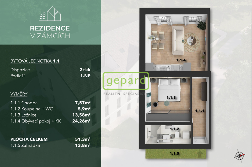 Nízkoenergetický byt (52,1 m2) o dispozici 2+kk s předzahrádkou (47,8 m2) v projektu Rezidence V Zámcích, Praha 8, je nyní k prodeji! Stavební práce budou dokončeny 03/2026. Prohlídky možné již teď. Byt se nachází v 1. nadzemním podlaží a disponuje vstupní halou, odkud se vchází do dalších místností: obývacího pokoje, ložnice a koupelny s WC. Obývací pokoj je orientovaný na jihozápadní stranu a nabízí dech beroucí výhled na řeku a přírodu. V koupelně se nachází místo pro pračku i sušičku, závěsné WC a sprchový kout. Ložnice nabízí celou stěnu pro případné vložení vestavěné skříně pro maximalizaci úložného prostoru. V celém bytě najdete podlahové vytápění, což spolu s tepelným čerpadlem zaručuje nízké náklady na provoz bytu. Pro případné zvýšení komfortu je udělána příprava na klimatizaci. K bytu lze dokoupit sklep a parkovací stání. Rezidence V Zámcích je výjimečný komorní projekt o pouhých 10 bytových jednotkách, který spojuje městské bydlení s přírodou. PRVNÍ TŘI PRODANÉ BYTY MAJÍ SKLEP ZDARMA! Pro více informací či při zájmu o prohlídku mě prosím neváhejte kontaktovat.