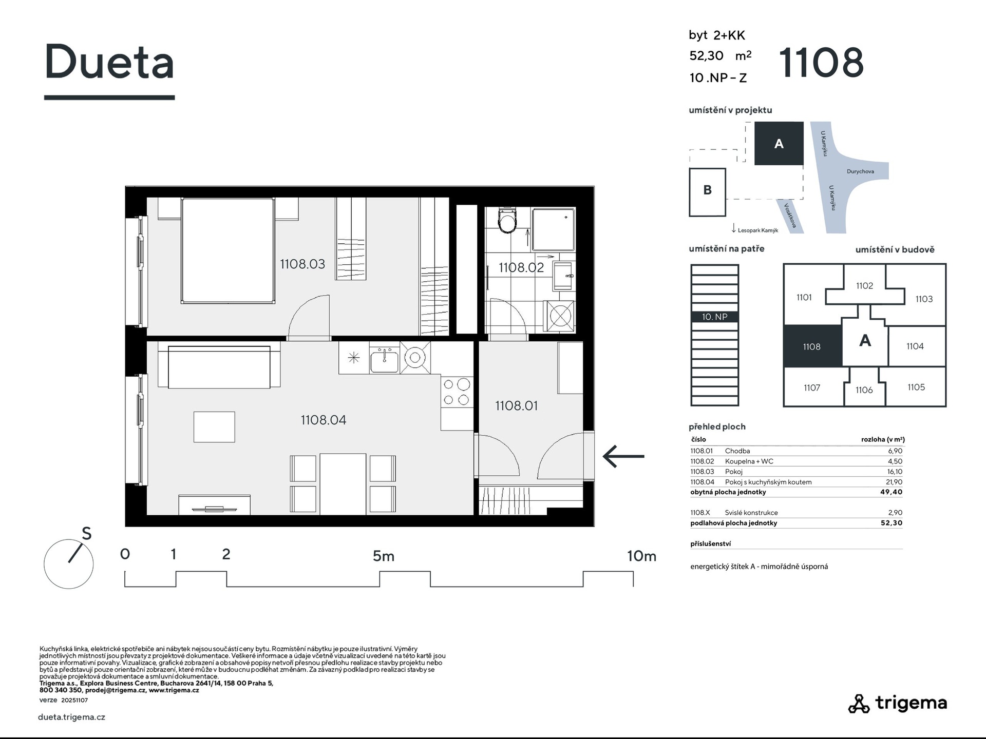 Byt č. 1108: Praktické 2+kk orientované na západ Výstavba zahájena – 40 % bytů prodáno během 6 měsíců! Neváhejte s výběrem – právě teď máte možnost zvolit si ideální dispozici i orientaci bytu v atraktivním projektu Dueta Kamýk, který spojuje moderní bydlení s přírodou. Byt č. 1108 o dispozici 2+kk s podlahovou plochou 52,30 m² je umístěn ve 10. nadzemním podlaží a orientován na západ, což zajišťuje příjemné podvečerní světlo. Vnitřní uspořádání zahrnuje obývací pokoj s kuchyňským koutem, ložnici, koupelnu s WC a chodbu. Obytná plocha činí 49,40 m², doplněná o konstrukční prvky. • Efektivně navržená dispozice 2+kk • Západní orientace - přirozené světlo i v podvečerních hodinách • Ideální kombinace komfortu a jednoduchosti Vhodné pro: Páry nebo jednotlivce, kteří hledají útulný, dobře řešený byt v moderním domě. Projekt Dueta Kamýk přináší jedinečnou kombinaci klidného bydlení uprostřed přírody a skvělé dostupnosti do centra Prahy díky plánované trase metra D. Lokalita nabízí nejen blízkost lesoparku a rozsáhlé zeleně, ale i atraktivní výhledy, které ocení každý milovník přírody. Byty jsou vybaveny nadstandardními technologiemi – rekuperací, podlahovým vytápěním, předokenními žaluziemi a kvalitními materiály, které zaručují pohodlí i úsporný provoz. Dueta Kamýk je ideálním řešením jak pro vlastní bydlení, tak jako chytrá investice v rychle se rozvíjející lokalitě.