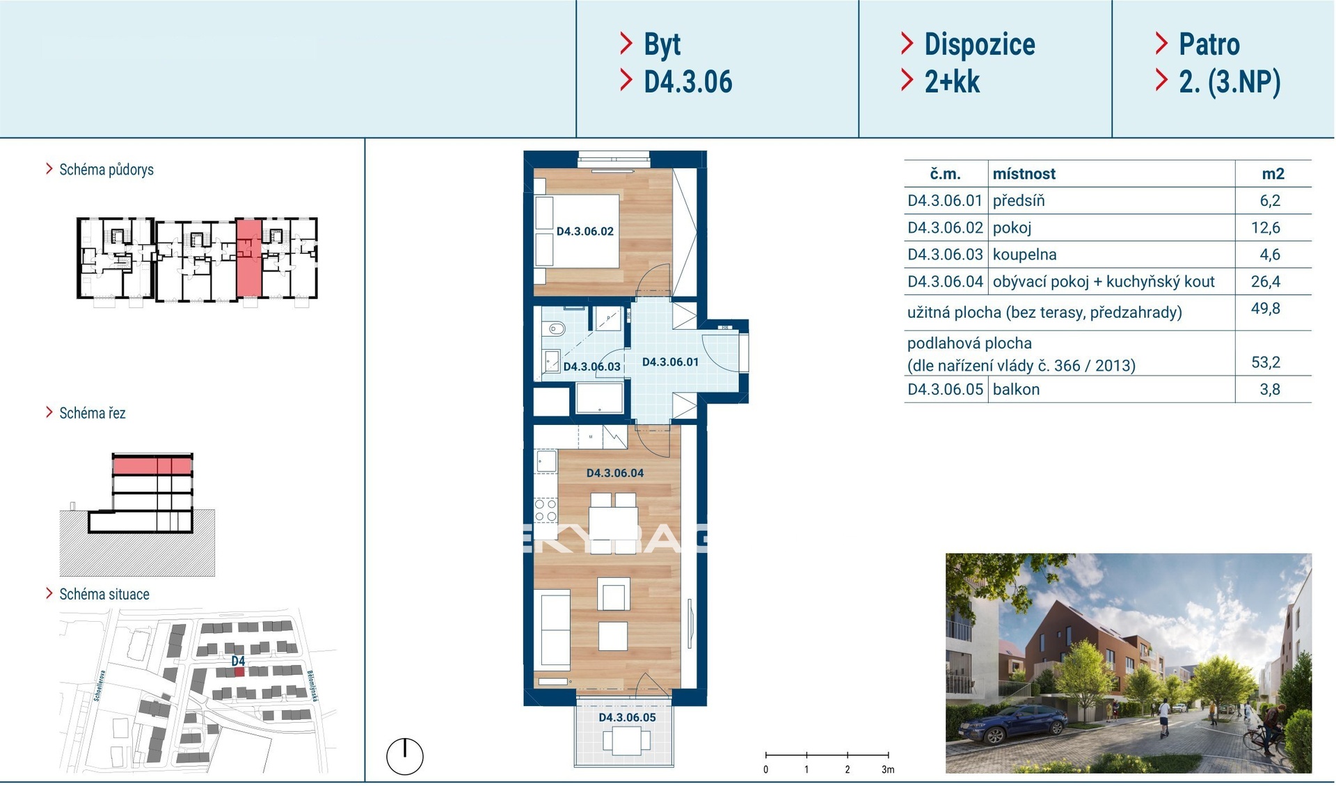 Dovolujeme si Vám nabídnout k prodeji byt 2+kk o výměře 53,2 m² s balkónem 3,8 m² v rezidenčním projektu Rezidence Čakovice. Klidné bydlení 9 obytných domů projektu Rezidence Čakovice poskytuje moderní byty s kvalitně nastavenými standardy bydlení o dispozicích od 1+kk až po 4+kk, součástí Rezidence Čakovice bude multifunkční dům se školkou, ordinacemi a ubytovacími jednotkami. Aby přirozeně zapadly do okolní zástavby, samotné domy jsou koncipovány jako tří až pětipodlažní. Řada bytů bude disponovat vlastní zahrádkou či balkonem. Samozřejmostí jsou parkovací místa a garáže. S původní zástavbou novou rezidenci propojí příjemné uličky lemované alejemi, které plynule navážou na stávající ulice. K oddychu a rekreaci obyvatel bude sloužit i přilehlý „zelený“ prostor s trávou a stromy, jenž bude realizován v rámci výstavby projektu. Čakovice mají dlouhou a barvitou historii. Suverénní městečko se stalo součástí Prahy v roce 1968, zachovalo si však svůj genius loci. Místní kulturní památkou je novorománský kostel sv. Remigia postavený podle plánů Karla Scheinera a zámek Čakovice, který se nachází v blízkosti čakovického cukrovaru, a mezi nimi se rozprostírá anglický park. V těsném sousedství budoucí Rezidence Čakovice je i potok, rybník nebo zámecký park, což jen podtrhuje komorní a příjemnou atmosféru bydlení.