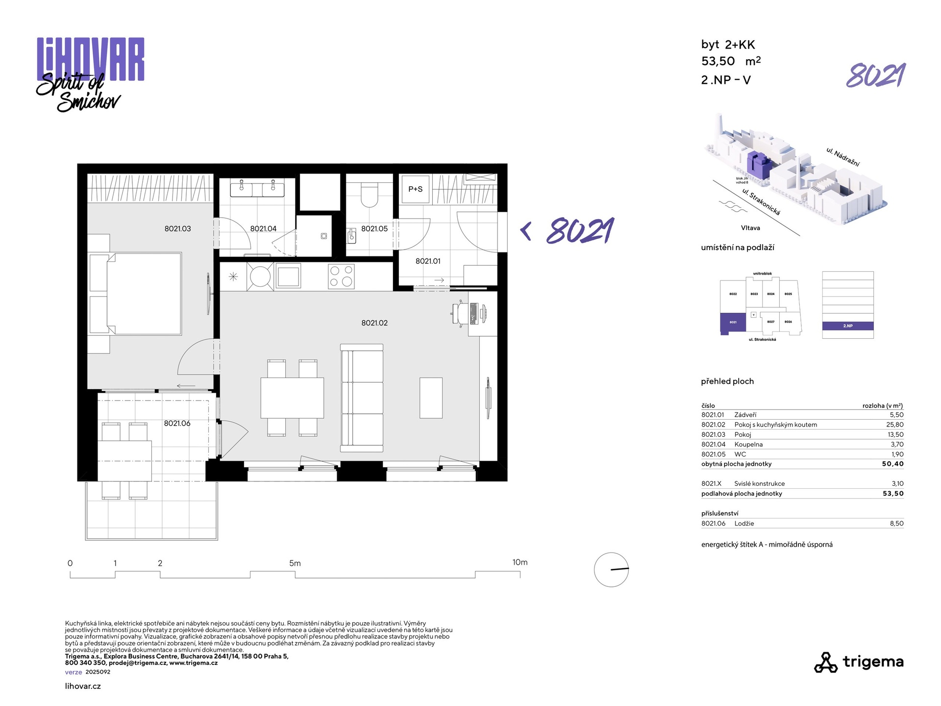 Staňte se součástí výjimečného projektu! Smíchov se mění – a vy můžete být u toho. Třetí a zároveň poslední etapa výjimečného projektu uzavírá vznik nové čtvrti, kde se industriální styl snoubí s moderní architekturou. Na místě vyroste živý prostor plný obchodů, služeb a kulinářských zážitků v rámci rozsáhlého food courtu. Nový Dvorecký most propojí Smíchov s Podolím a rekonstrukce Smíchovského nádraží dodá celé lokalitě ještě větší hodnotu. Prémiové byty ve vyšších patrech nabídnou neopakovatelné výhledy na Vltavu, Vyšehrad a Pankrác. Poslední šance stát se součástí místa, které definuje budoucnost této části Prahy. Světlé 2+kk s lodžií a praktickým uspořádáním Byt č. 8021 o dispozici 2+kk s podlahovou plochou 53,50 m² se nachází v 2. nadzemním podlaží a je orientovaný na východ – ideální pro ty, kdo ocení ranní sluneční paprsky. Obytná plocha bytu činí 50,40 m², doplněná o svislé konstrukce a prostornou lodžii (8,5 m²). · Efektivní a vzdušná dispozice 2+kk · Východní orientace – dostatek ranního světla · Samostatné WC a koupelna pro větší pohodlí · Lodžie jako příjemný exteriérový bonus · Energetická třída A – mimořádně úsporná O pohodlí se starají moderní technologie – rekuperace, stropní chlazení, exteriérové žaluzie či izolační trojskla. Vše je řízeno chytrým systémem Loxone, který zajišťuje příjemné a úsporné bydlení v každém ročním období. Byty v LIHOVARU jsou navrženy pro maximální komfort a praktičnost. Každý byt má vlastní terasu nebo lodžii. Promyšlené dispozice přinášejí dostatek světla a vzdušnost, přičemž ideální domov tu najde jak náročný singl, tak rodina s dětmi. Předpokládaný termín kolaudace ve 3Q/2027. Fotografie interiéru jsou pouze referenční. Pro prohlídku nemovitosti kontaktujte makléře společnosti. Nabídka dalších bytů na stránkách developerského projektu.