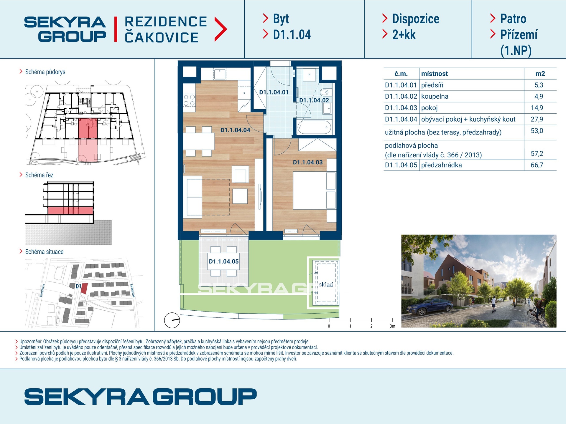 Dovolujeme si Vám nabídnout k prodeji byt 2+kk o výměře 57,2 m² se zahradou 66,7 m² v rezidenčním projektu Rezidence Čakovice. Klidné bydlení 9 obytných domů projektu Rezidence Čakovice poskytuje moderní byty s kvalitně nastavenými standardy bydlení o dispozicích od 1+kk až po 4+kk, součástí Rezidence Čakovice bude multifunkční dům se školkou, ordinacemi a ubytovacími jednotkami. Aby přirozeně zapadly do okolní zástavby, samotné domy jsou koncipovány jako tří až pětipodlažní. Řada bytů bude disponovat vlastní zahrádkou či balkonem. Samozřejmostí jsou parkovací místa a garáže. S původní zástavbou novou rezidenci propojí příjemné uličky lemované alejemi, které plynule navážou na stávající ulice. K oddychu a rekreaci obyvatel bude sloužit i přilehlý „zelený“ prostor s trávou a stromy, jenž bude realizován v rámci výstavby projektu. Čakovice mají dlouhou a barvitou historii. Suverénní městečko se stalo součástí Prahy v roce 1968, zachovalo si však svůj genius loci. Místní kulturní památkou je novorománský kostel sv. Remigia postavený podle plánů Karla Scheinera a zámek Čakovice, který se nachází v blízkosti čakovického cukrovaru, a mezi nimi se rozprostírá anglický park. V těsném sousedství budoucí Rezidence Čakovice je i potok, rybník nebo zámecký park, což jen podtrhuje komorní a příjemnou atmosféru bydlení.
