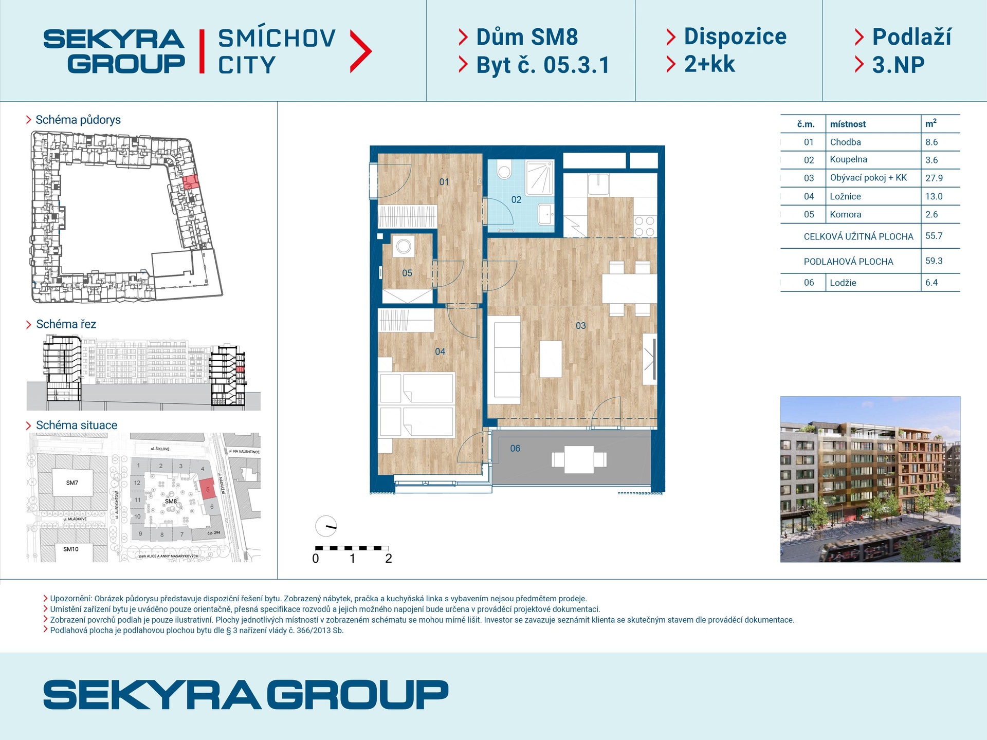 Dovolujeme si Vám nabídnout k prodeji byt 2+kk o výměře 59,3 m² s lodžií 6,4 m² v rezidenčním projektu Smíchov City, blok SM8. K bytu je možné přikoupit 1 parkovací stání. V ceně bytu je podlahové topení, předokenní žaluzie a příprava na dochlazování. SM8 navazuje na již realizované rezidenční bloky SM1/2 a SM3 a zahrnuje celkem 12 bytových domů. Je součástí projektu Smíchov City, jehož záměrem je nabídnout obyvatelům moderní bydlení s vysokým standardem provedení, vybavené špičkovými technologiemi. Nespornou výhodou je navíc umístění v centru města. Exkluzivní byty doplní v přízemí objektů funkční městský parter s obchody a službami. V ulicích budou vysázeny stromy, které zpříjemní klima a v horkých dnech poskytnou chladivý stín. Blok sousedí s třídou Madeleine Albrightové pojatou jako pěší podélný park a budoucím parkem Alice a Anny Masarykových. Byty v bloku SM8 jsou navrženy tak, aby si podle svých preferencí a možností mohl vybrat opravdu každý. Dispozičně tu naleznete vše – od malých bytů 1+kk až po velké byty kategorie 5+kk s nádhernými výhledy na Prahu. Samozřejmostí je dostatek parkovacích míst, technické zázemí a sklepní kóje v suterénu objektu. V posledním podlaží jsou pak ty nejexkluzivnější byty, z nichž některé nabízí jedinečný pohled na Vyšehrad. Všechny byty jsou navrženy ve vysokém standardu, což se týká povrchových materiálů i zařízení, jako je podlahové topení či vzduchotechnika s rekuperací vzduchu. Standard bytů lze samozřejmě přizpůsobit potřebám budoucích majitelů. Stačí se obrátit na naše prodejce.
