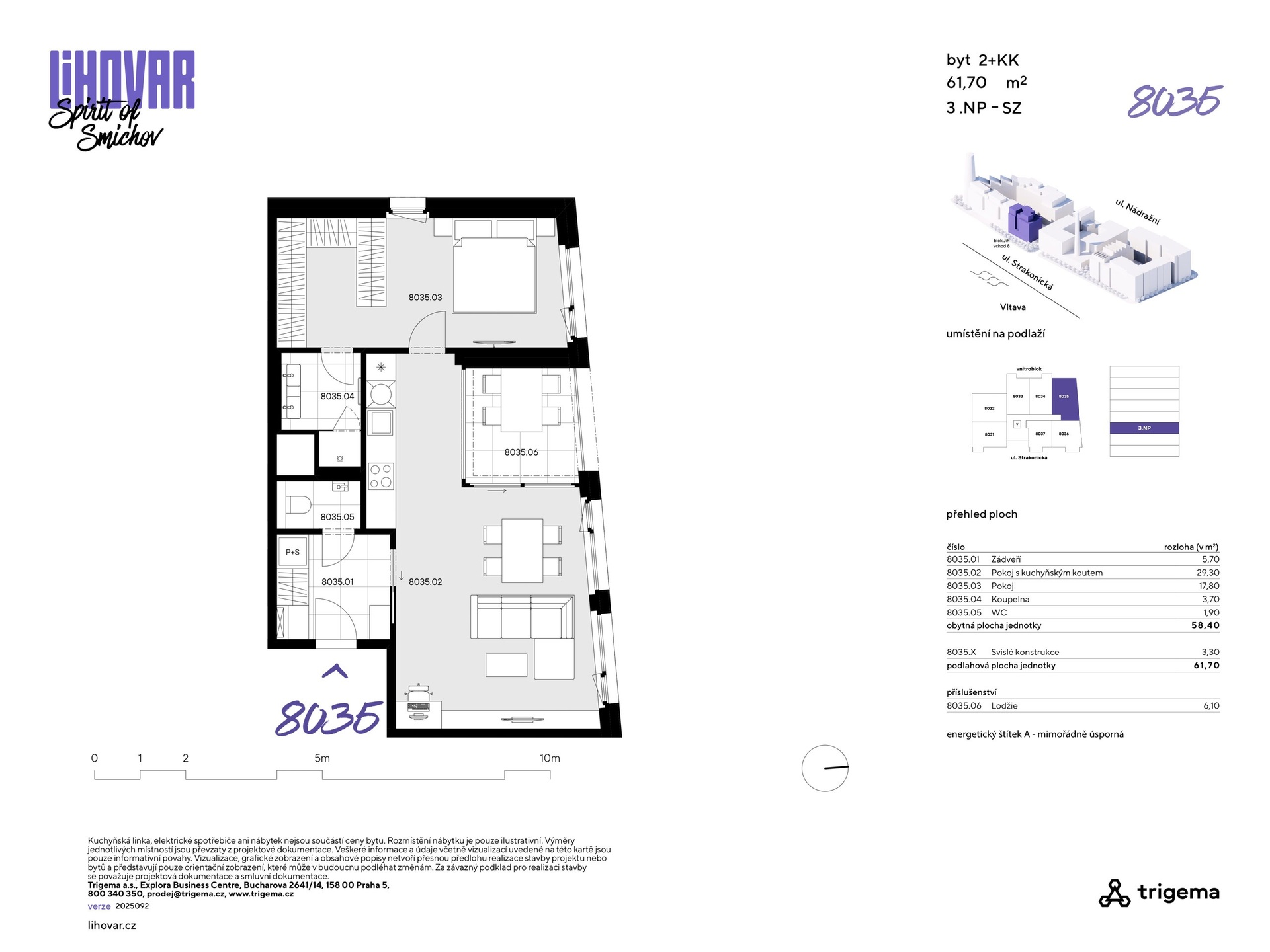 Staňte se součástí výjimečného projektu! Smíchov se mění – a vy můžete být u toho. Třetí a zároveň poslední etapa výjimečného projektu uzavírá vznik nové čtvrti, kde se industriální styl snoubí s moderní architekturou. Na místě vyroste živý prostor plný obchodů, služeb a kulinářských zážitků v rámci rozsáhlého food courtu. Nový Dvorecký most propojí Smíchov s Podolím a rekonstrukce Smíchovského nádraží dodá celé lokalitě ještě větší hodnotu. Prémiové byty od renomovaného developera Trigema ve vyšších patrech nabídnou neopakovatelné výhledy na Vltavu, Vyšehrad a Pankrác. Poslední šance stát se součástí místa, které definuje budoucnost této části Prahy. Velkorysé 2+kk s lodžií a severozápadní orientací Byt č. 8035 o dispozici 2+kk a celkové podlahové ploše 61,70 m² se nachází v 3. nadzemním podlaží a je orientovaný na severozápad, což zajišťuje příjemné světlo v odpoledních hodinách. Obytná plocha činí 58,40 m², doplněná o svislé konstrukce. Benefitem je prostorná lodžie poskytující 6,10 m² prostoru pro Vaši relaxaci. • Samostatné WC a koupelna se sprchovým koutem • Efektivně navržená dispozice 2+kk • Energetická třída A – mimořádně úsporná O pohodlí se starají moderní technologie – rekuperace, stropní chlazení, exteriérové žaluzie či izolační trojskla. Vše je řízeno chytrým systémem Loxone, který zajišťuje příjemné a úsporné bydlení v každém ročním období. Byty v LIHOVARU jsou navrženy pro maximální komfort a praktičnost. Každý byt má vlastní terasu nebo lodžii. Promyšlené dispozice přinášejí dostatek světla a vzdušnost, přičemž ideální domov tu najde jak náročný singl, tak rodina s dětmi. Předpokládaný termín kolaudace ve 3Q/2027. Fotografie interiéru jsou pouze referenční. Pro prohlídku nemovitosti kontaktujte makléře společnosti. Nabídka dalších bytů na stránkách developerského projektu.