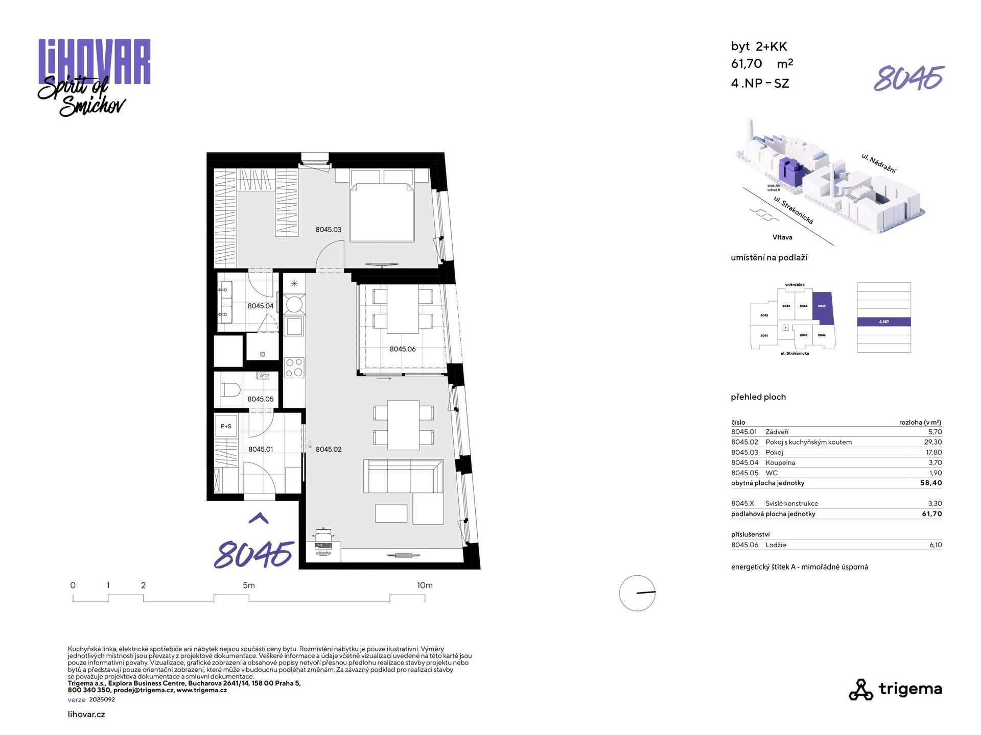 Staňte se součástí výjimečného projektu! Smíchov se mění – a vy můžete být u toho. Třetí a zároveň poslední etapa výjimečného projektu uzavírá vznik nové čtvrti, kde se industriální styl snoubí s moderní architekturou. Na místě vyroste živý prostor plný obchodů, služeb a kulinářských zážitků v rámci rozsáhlého food courtu. Nový Dvorecký most propojí Smíchov s Podolím a rekonstrukce Smíchovského nádraží dodá celé lokalitě ještě větší hodnotu. Prémiové byty od renomovaného developera Trigema ve vyšších patrech nabídnou neopakovatelné výhledy na Vltavu, Vyšehrad a Pankrác. Poslední šance stát se součástí místa, které definuje budoucnost této části Prahy. Velkorysé 2+kk s lodžií a severozápadní orientací Byt č. 8045 o dispozici 2+kk a celkové podlahové ploše 61,70 m² se nachází v 4. nadzemním podlaží a je orientovaný na severozápad, což zajišťuje příjemné světlo v odpoledních hodinách. Obytná plocha činí 58,40 m², doplněná o svislé konstrukce. Benefitem je prostorná lodžie poskytující 6,10 m² prostoru pro Vaši relaxaci. • Samostatné WC a koupelna se sprchovým koutem • Efektivně navržená dispozice 2+kk • Energetická třída A – mimořádně úsporná O pohodlí se starají moderní technologie – rekuperace, stropní chlazení, exteriérové žaluzie či izolační trojskla. Vše je řízeno chytrým systémem Loxone, který zajišťuje příjemné a úsporné bydlení v každém ročním období. Byty v LIHOVARU jsou navrženy pro maximální komfort a praktičnost. Každý byt má vlastní terasu nebo lodžii. Promyšlené dispozice přinášejí dostatek světla a vzdušnost, přičemž ideální domov tu najde jak náročný singl, tak rodina s dětmi. Předpokládaný termín kolaudace ve 3Q/2027. Fotografie interiéru jsou pouze referenční. Pro prohlídku nemovitosti kontaktujte makléře společnosti. Nabídka dalších bytů na stránkách developerského projektu.