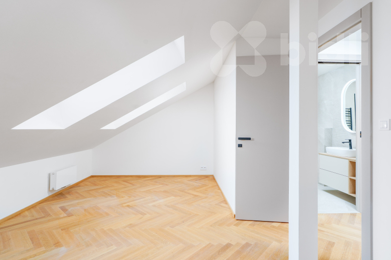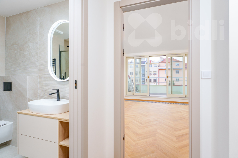 Nabízíme k prodeji novostavbu podkrovního bytu o dispozici 2+kk a celkové užitné ploše 63,6 m2, která se nachází v 6. nadzemním podlaží kompletně zrekonstruovaného činžovního domu v ulici Bořivojova na pražském Žižkově. Dokončení projektu a předání bytů v březen 2026. Dispozice a orientace bytu: Interiér o podlahové ploše 59,1 m2 rozšiřuje terasa o velikosti 4,5 m2. Srdcem bytu je obývací pokoj s přípravou na kuchyňský kout, který je orientován na západ. Díky velkoformátovému posuvnému oknu (HS portál) je prostor nadstandardně prosvětlený a nabízí přímý vstup na terasu s úchvatným výhledem na dominanty Prahy - kostel a Žižkovskou věž. Ložnice je situována na východní stranu s výhledem do klidného parku, což zajišťuje nerušený odpočinek. Místnost je prosvětlena kvalitními střešními okny. Dispozici doplňuje moderní koupelna se sprchovým koutem a toaletou a vstupní chodba. Byt je díky své oboustranné orientaci (východ-západ) vzdušný a světlý. Standardy a kvalita provedení: Za realizací stojí zkušená společnost Stavba&design, s.r.o., specializující se na půdní vestavby. Projekt citlivě kombinuje původní architektonické prvky domu z počátku 20. století s moderním designem a vysokým standardem provedení. Vstupní bezpečnostní a protipožární dveře. Velkoformátový HS portál na terasu. Kvalitní sanitární vybavení a obklady. Stav budovy: Dům prošel nákladnou generální rekonstrukcí, zahrnující nové rozvody inženýrských sítí (elektřina, voda, odpady), opravu společných prostor a instalaci nového proskleného výtahu. Vytápění a ohřev teplé vody zajišťuje centrální úsporná plynová kotelna umístěná v domě. Lokalita: Žižkov patří mezi nejžádanější pražské lokality. Ulice Bořivojova nabízí klidné bydlení s perfektní dostupností do centra a kompletní občanskou vybaveností v bezprostředním okolí (školy, parky, kavárny, restaurace). Cena: 12 895 000 Kč K bytu je možno přikoupit 1 parkovací stání ve dvoře s dálkově ovládanými vjezdovými vraty. Informaci o ceně parkovacího stání vám rádi sdělíme dle podmínek prodeje.