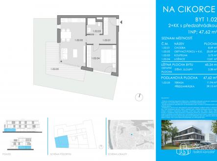 V exkluzivní lokalitě Prahy 12 – Modřany vám nabízíme jedinečnou příležitost ke koupi moderní bytové jednotky 2+kk s předzahrádkou v připravovaném projektu Rezidence Cikorka, který klade důraz na komfortní bydlení, elegantní architekturu a maximální soukromí. Kupující neplatí žádnou provizi – výhodná nabídka bytu přímo od developera. Byt o dispozici 2+kk a užitné ploše 47,62 m² se nachází v přízemí novostavby. Jeho největší předností je předzahrádka s terasou o velikosti 51 m², která poskytne ideální prostor pro relaxaci nebo letní posezení s přáteli. Dispozice bytu: • vzdušný obývací prostor s kuchyňským koutem • samostatná ložnice • koupelna s toaletou Technické standardy a vybavení: • bezpečnostní vstupní dveře • vnitřní podlahy – dřevěné nebo dlažba (dle výběru klienta) • terasa a předzahrádka – dřevěná nebo velkoformátová dlažba • kompletní sanitární vybavení a obklady • vnitřní dveře • hliníková okna s izolačním trojsklem • venkovní žaluzie pro stínění a tepelný komfort • podlahové vytápění ve všech místnostech • tepelné čerpadlo pro vytápění a ohřev TUV • rekuperace vzduchu • příprava na klimatizaci • bezbariérový přístup do celého domu • venkovní parkovací stání Rezidence Cikorka se nachází v klidné rezidenční zástavbě s dostatkem zeleně a výbornou dopravní dostupností do centra města. Projekt nabízí pouze 12 bytových jednotek, což zaručuje komorní charakter a klidné bydlení. Kolaudace – konec roku 2026. Cena parkovacího stání není zahrnuta v ceně bytu. Vizualizace a fotografie mají pouze ilustrační charakter. Vyhrazujeme si právo na změny v průběhu realizace projektu. Nemovitost lze financovat hypotečním úvěrem – s jeho vyřízením vám rádi pomůžeme. Zveme vás na osobní schůzku do naší kanceláře v Praze či Sokolově, kde vám rádi představíme projektovou dokumentaci a probereme možnosti individuálních úprav dle vašich představ. Jsme vám k dispozici – neváhejte se na nás obrátit. Tento byt je skvělou volbou jak pro vlastní bydlení, tak jako investiční příležitost.