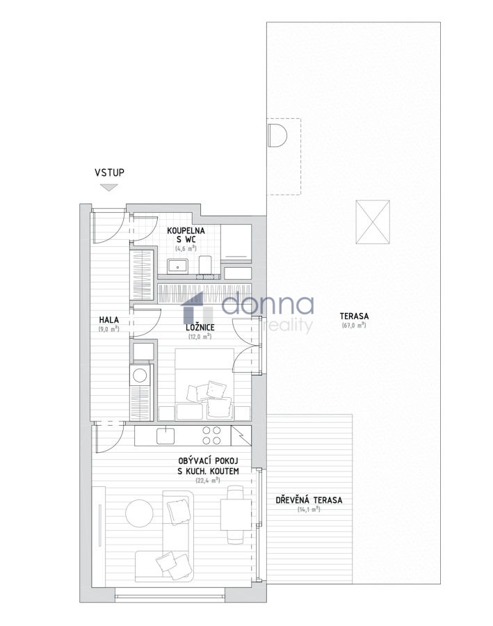 Prodej bytu 2+kk/T +garáž , AC, 51,3 m2 + terasa 81 m2, P9 - Kbely